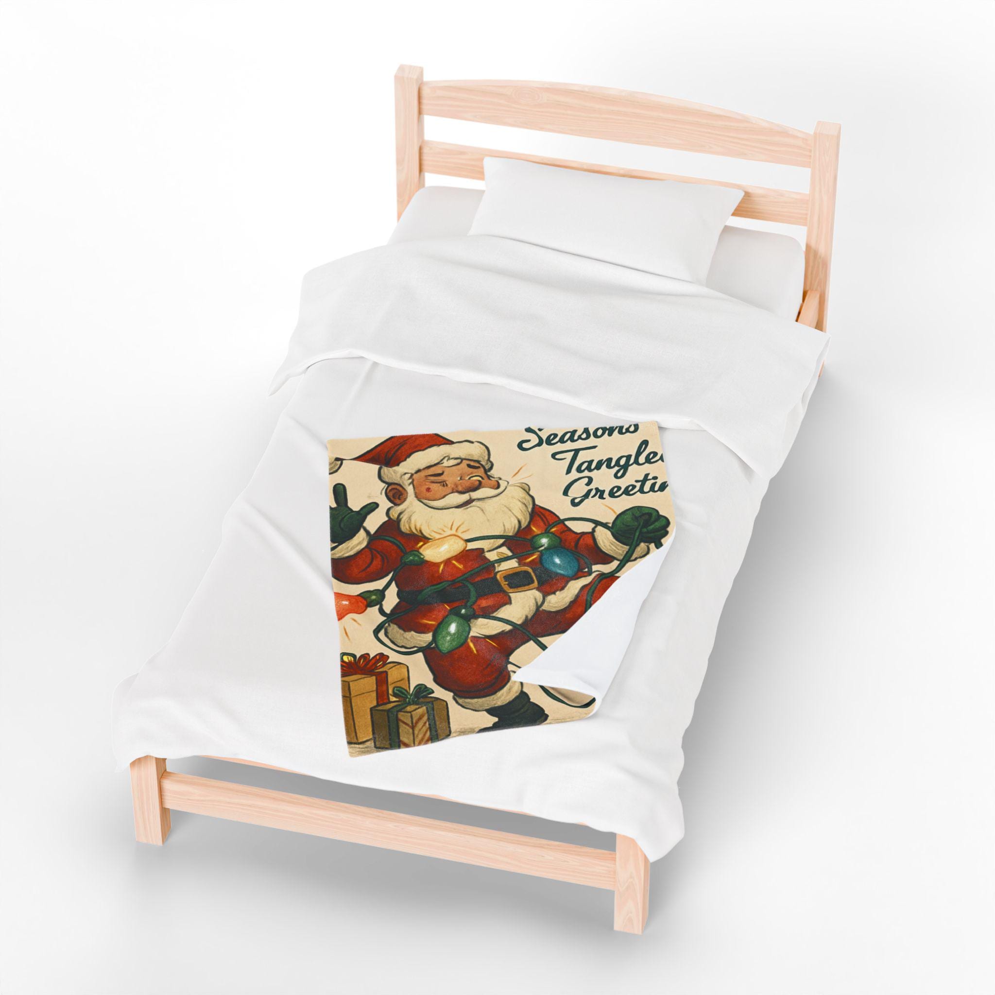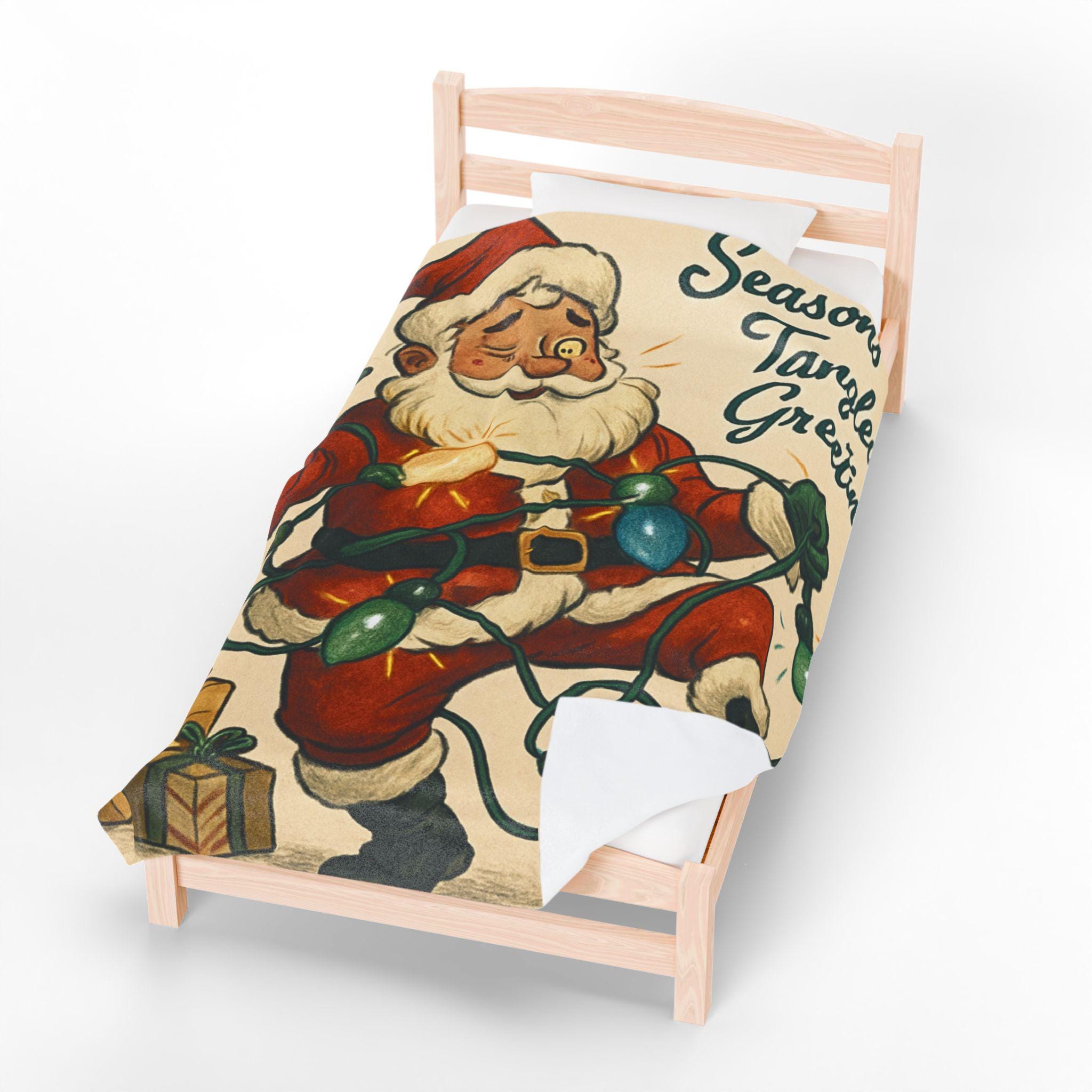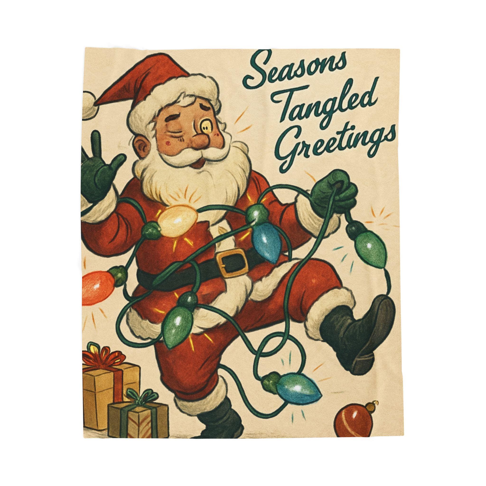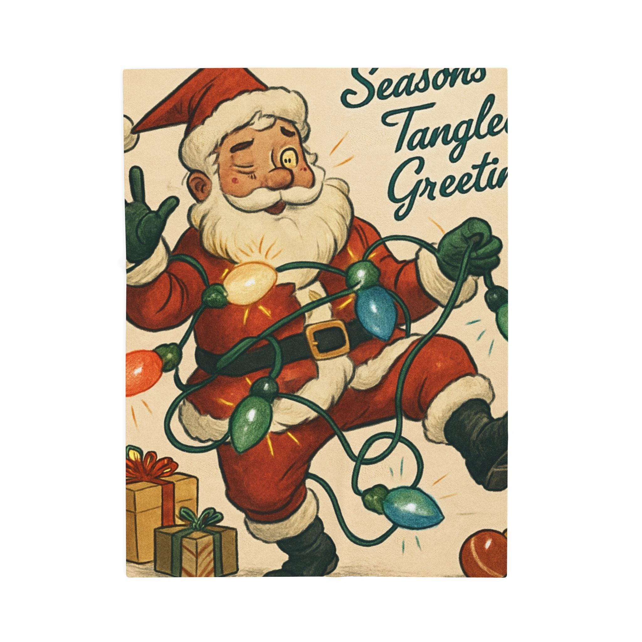 Wrap yourself in a warm, nostalgic holiday moment. This velveteen plush blanket features a vintage Santa tangled in colorful lights and the cheerful script “Seasons Tangled Greetings.” The surface is velvety-soft with vivid, single-side printing that keeps the illustration crisp and bright. It drapes easily over shoulders during chilly movie nights, adds a playful retro touch to a living room throw pile, and sits ready for quiet mornings with coffee beneath twinkling tree lights. Lightweight yet cozy, it brings a kitschy, cheerful energy—like finding an old holiday card come to life—so you can relive childhood silliness and laughter every winter evening.