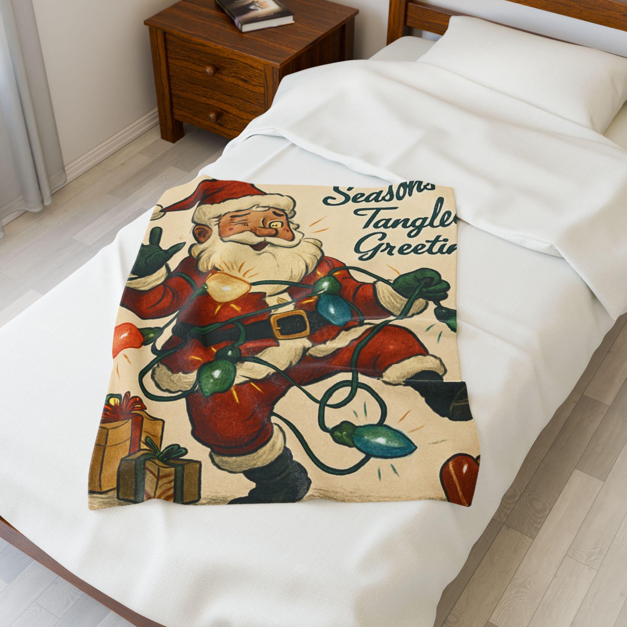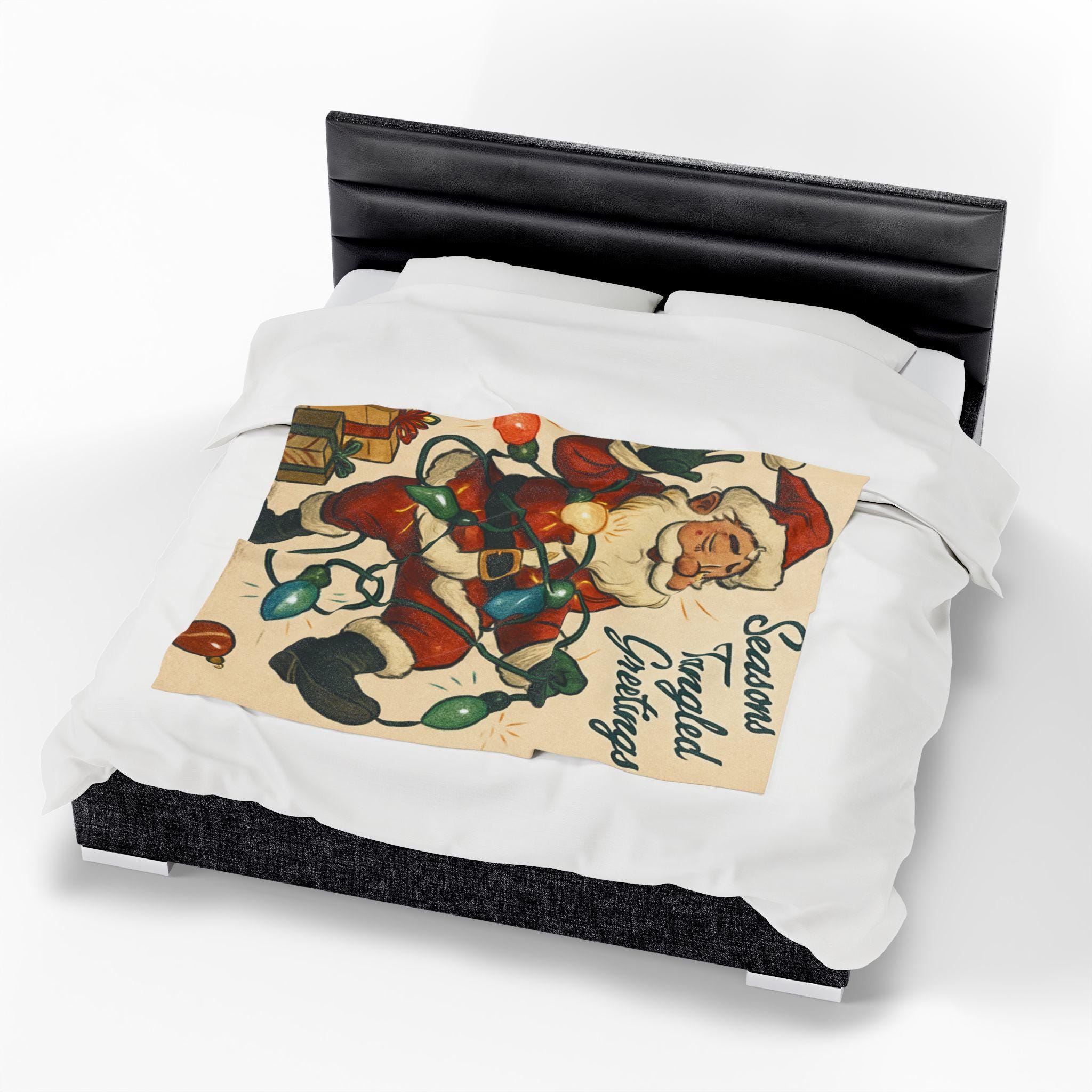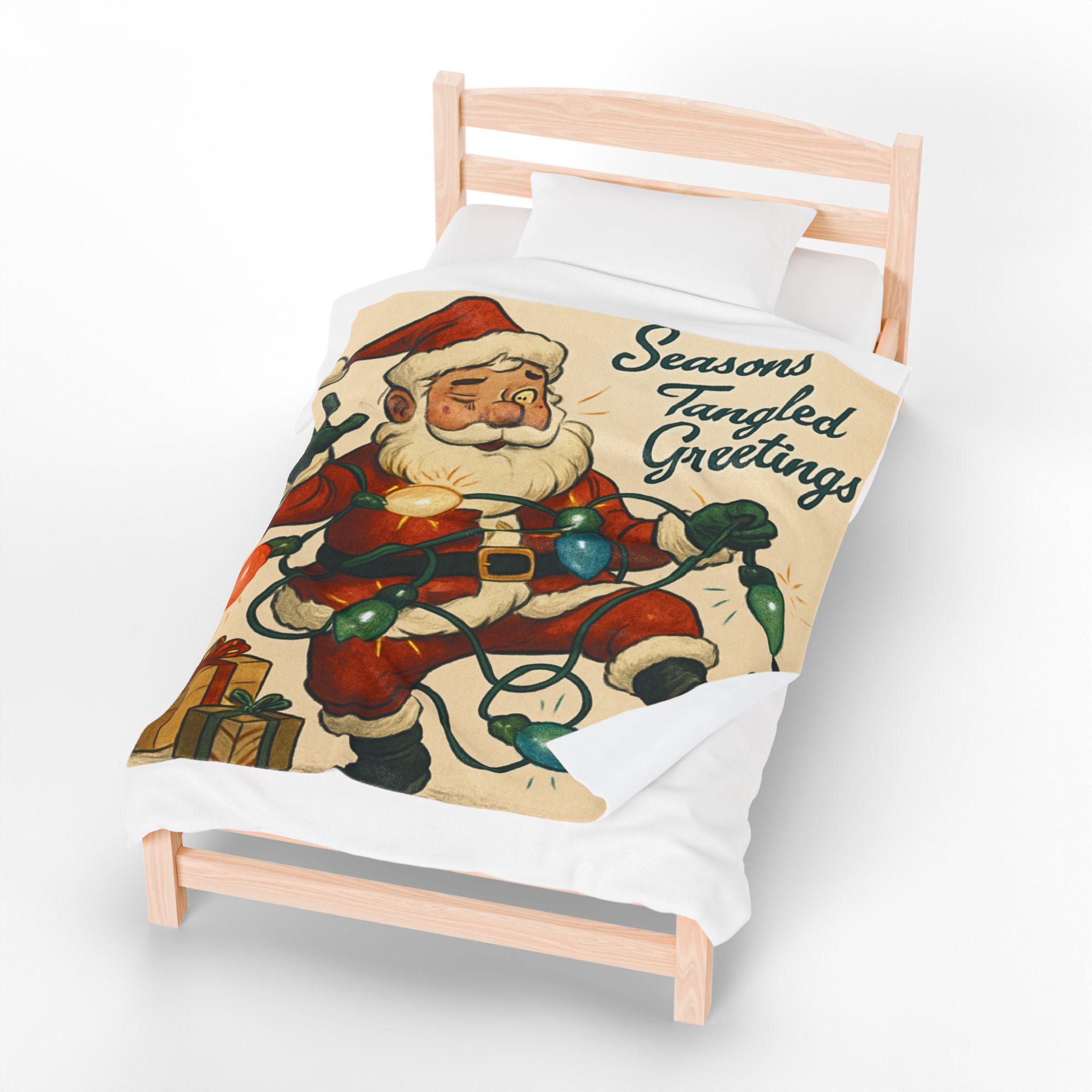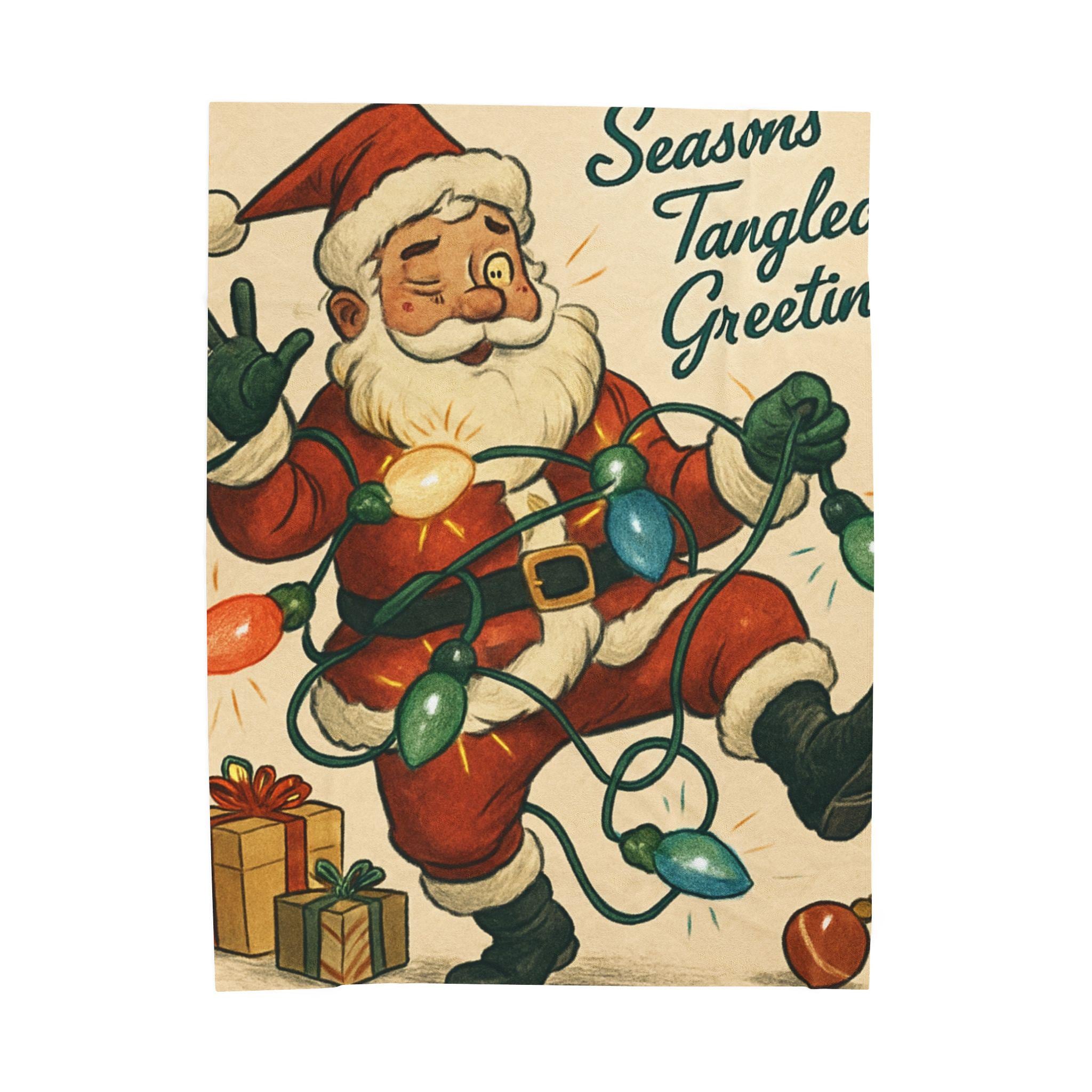 Wrap yourself in a warm, nostalgic holiday moment. This velveteen plush blanket features a vintage Santa tangled in colorful lights and the cheerful script “Seasons Tangled Greetings.” The surface is velvety-soft with vivid, single-side printing that keeps the illustration crisp and bright. It drapes easily over shoulders during chilly movie nights, adds a playful retro touch to a living room throw pile, and sits ready for quiet mornings with coffee beneath twinkling tree lights. Lightweight yet cozy, it brings a kitschy, cheerful energy—like finding an old holiday card come to life—so you can relive childhood silliness and laughter every winter evening.