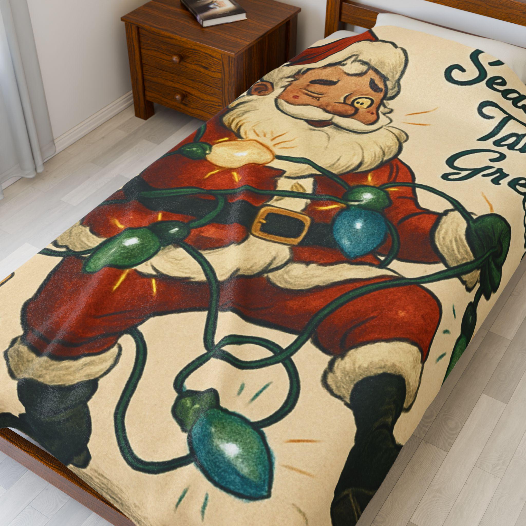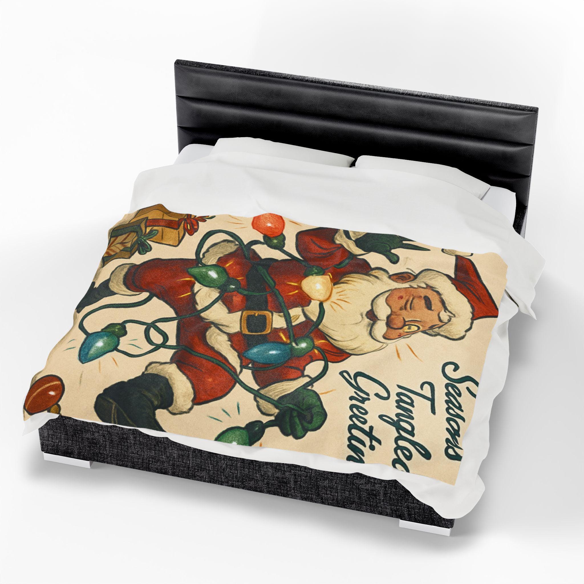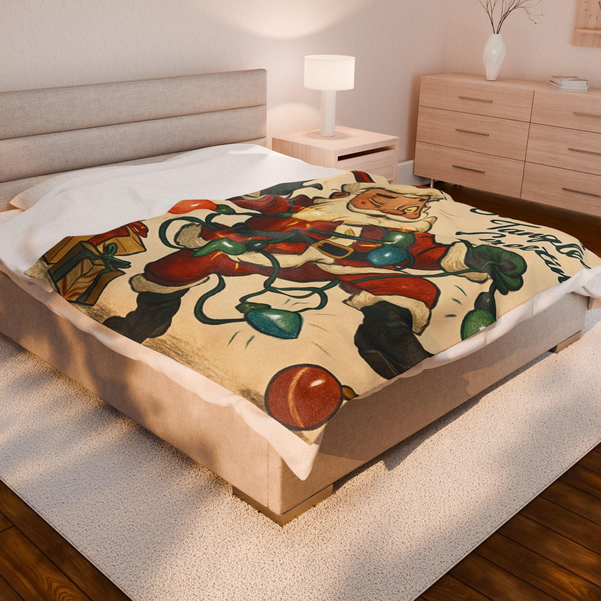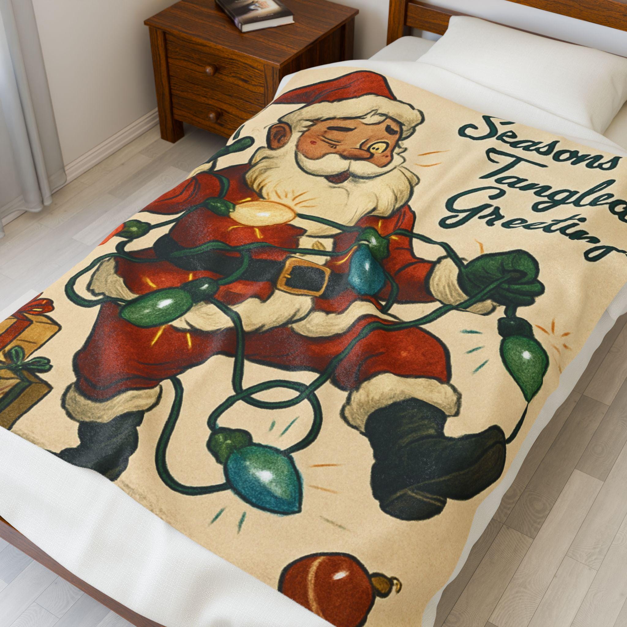 Wrap yourself in a warm, nostalgic holiday moment. This velveteen plush blanket features a vintage Santa tangled in colorful lights and the cheerful script “Seasons Tangled Greetings.” The surface is velvety-soft with vivid, single-side printing that keeps the illustration crisp and bright. It drapes easily over shoulders during chilly movie nights, adds a playful retro touch to a living room throw pile, and sits ready for quiet mornings with coffee beneath twinkling tree lights. Lightweight yet cozy, it brings a kitschy, cheerful energy—like finding an old holiday card come to life—so you can relive childhood silliness and laughter every winter evening.