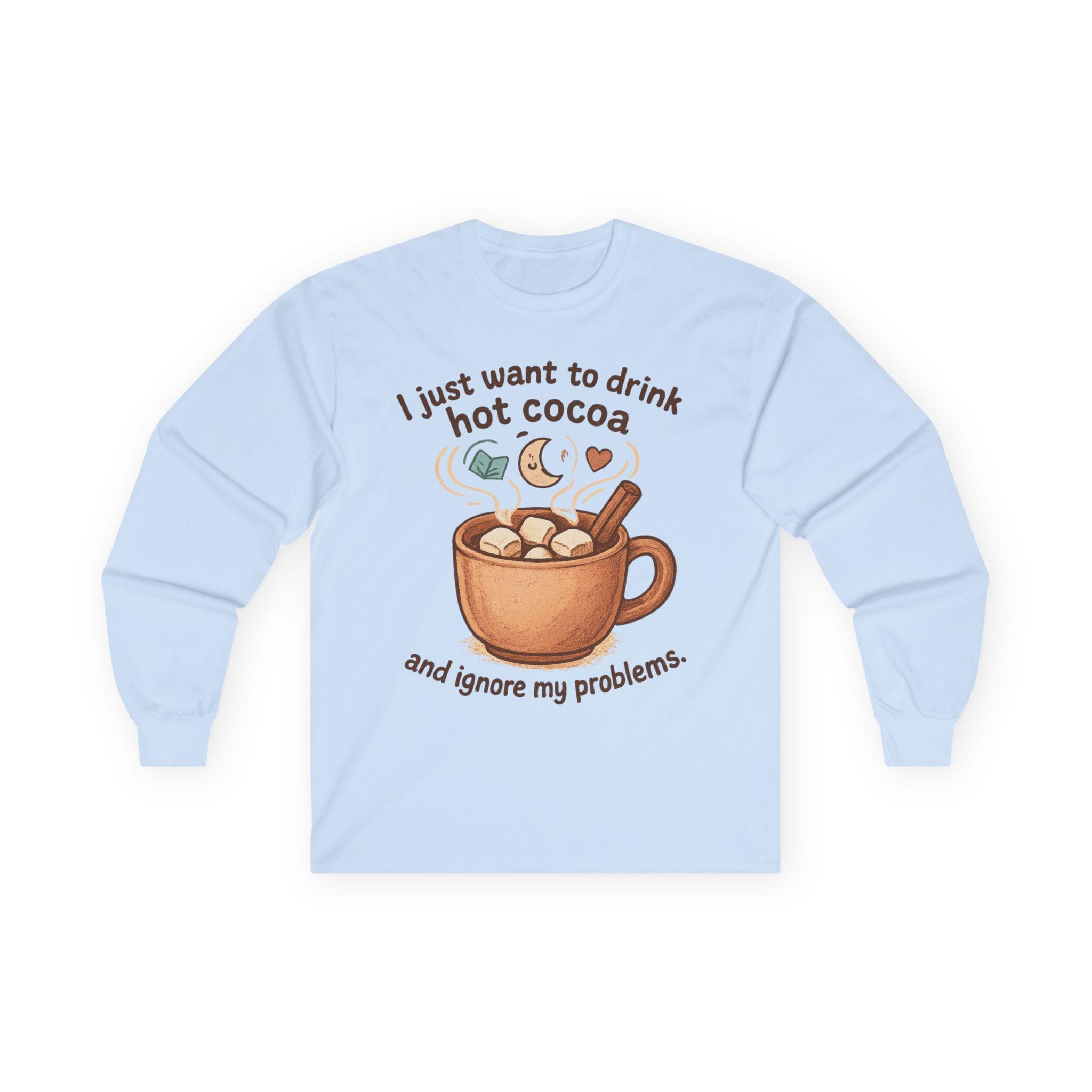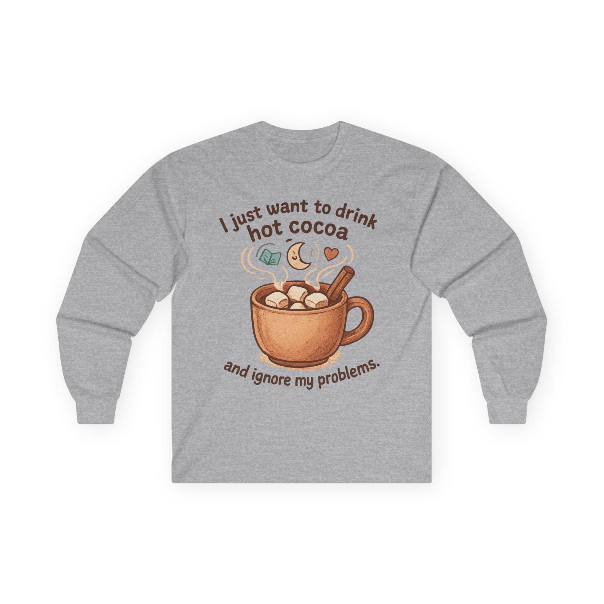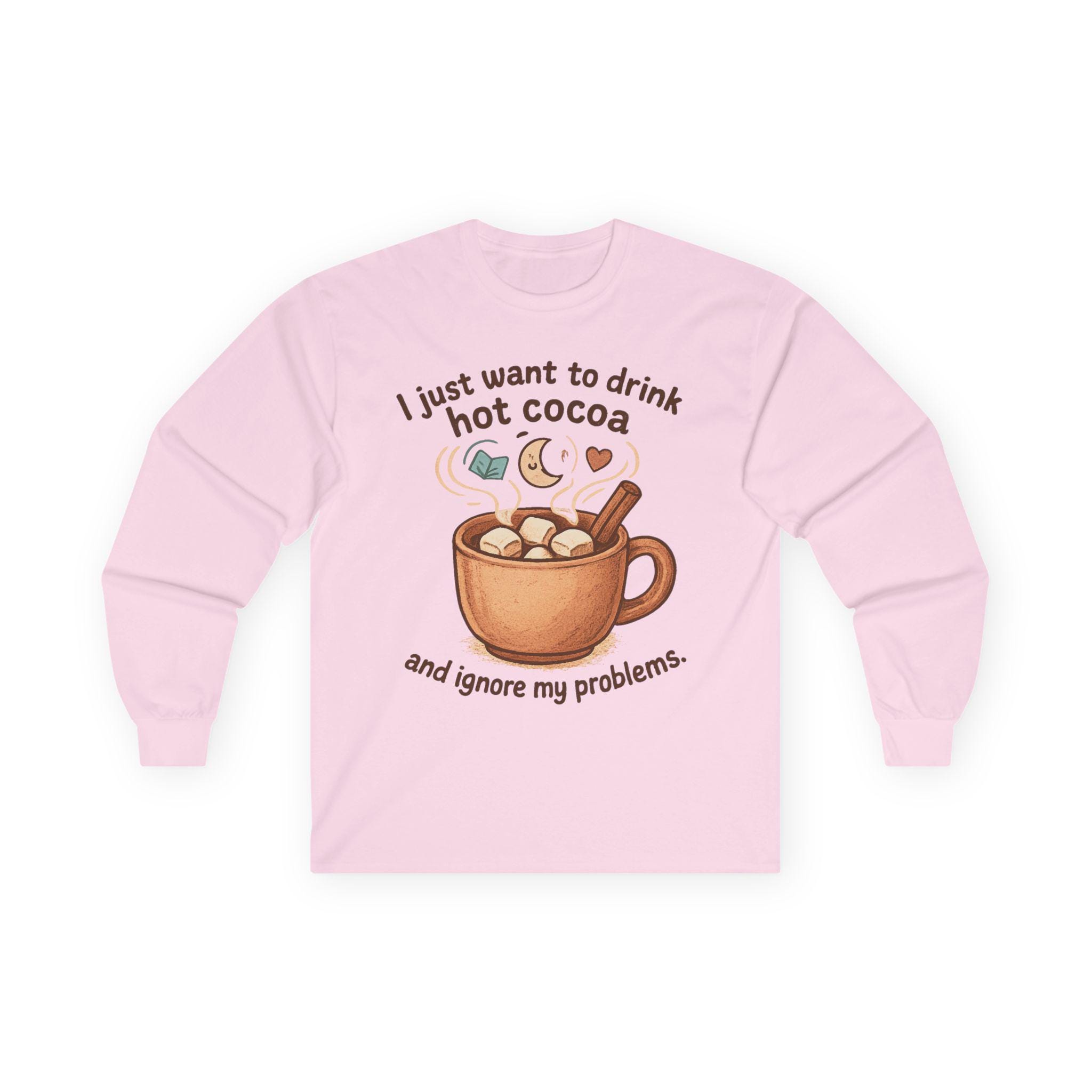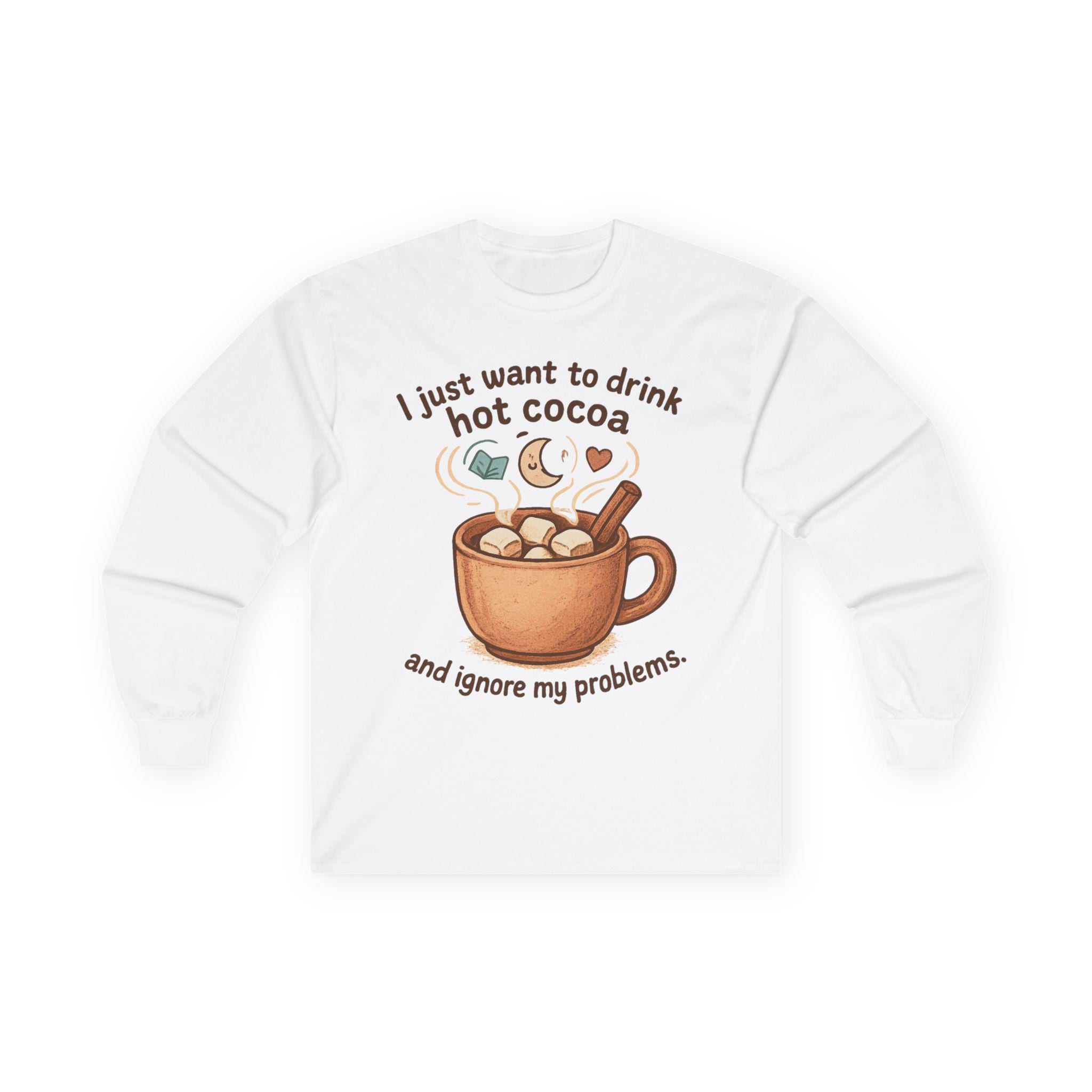 Warm, cozy, and a little bit cheeky — this long sleeve tee wraps you in a thicker vintage-feel cotton and a soft, familiar comfort that invites slow mornings with a steaming mug. The front art shows a bubbly cup of hot cocoa with marshmallows and a cinnamon stick, paired with the tongue-in-cheek line “I just want to drink hot cocoa and ignore my problems.” It reads like a quiet ritual: dim lights, fuzzy socks, and a few peaceful minutes of escapism. The relaxed, classic fit and ribbed collar hold their shape through repeated wear, while the tubular knit and shoulder tape keep the silhouette clean and made-to-last. Reach for it on chilly afternoons, casual coffee dates, or laid-back evenings when you want to feel soothed and seen.