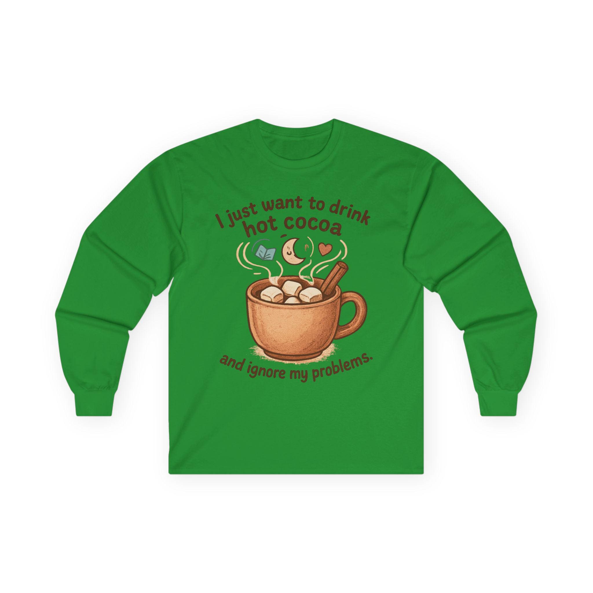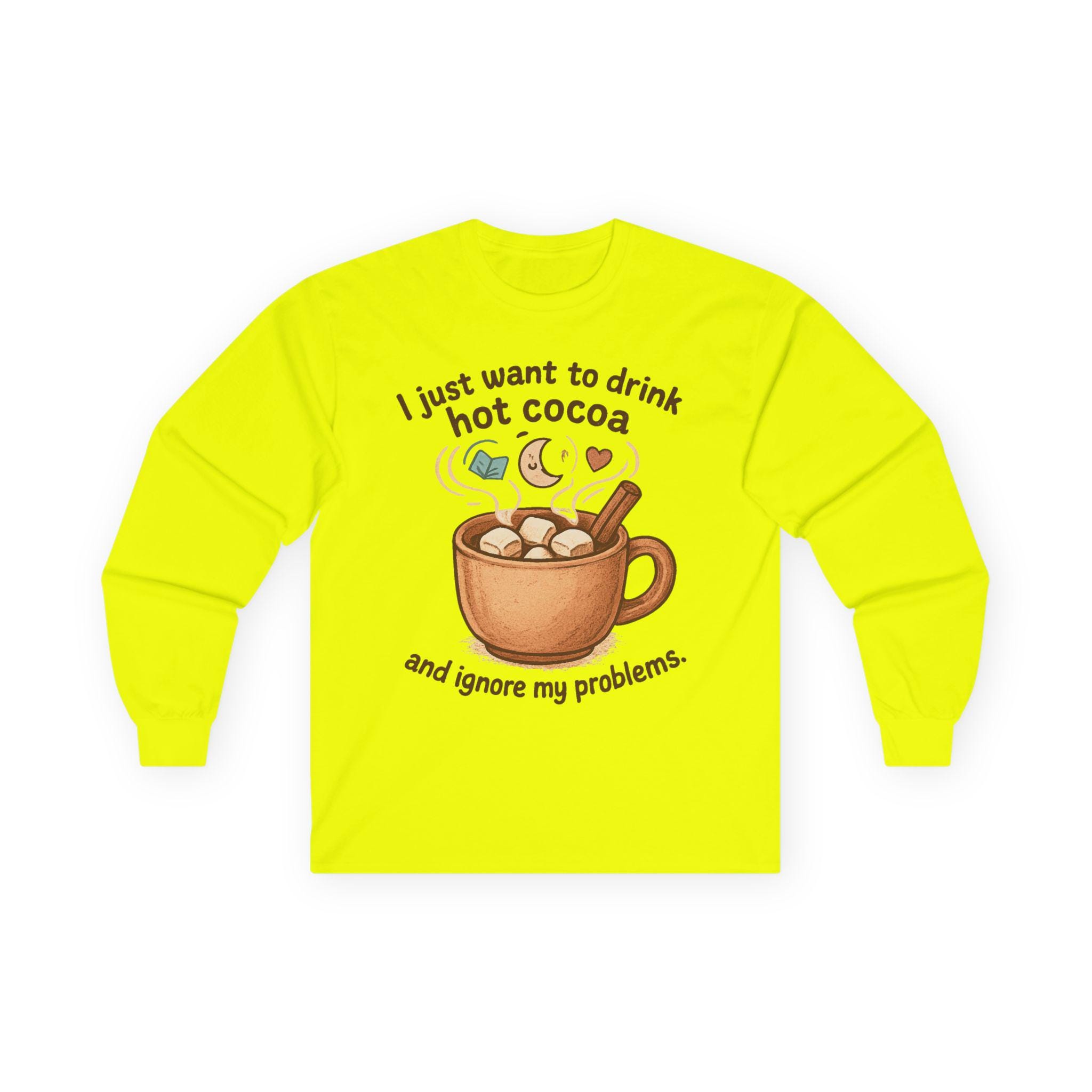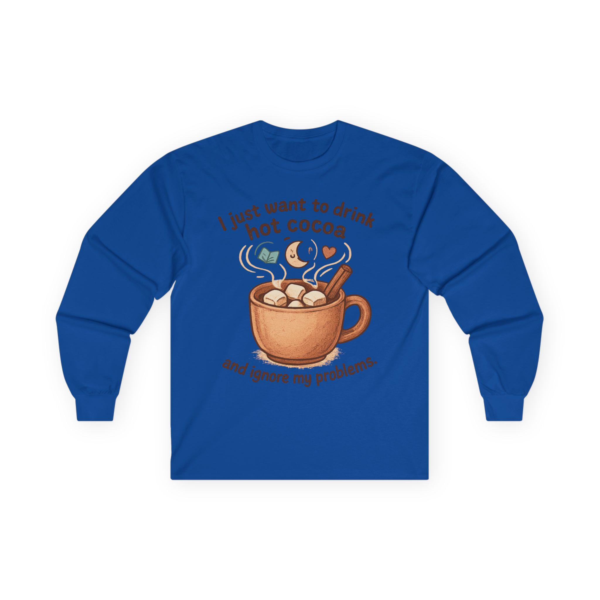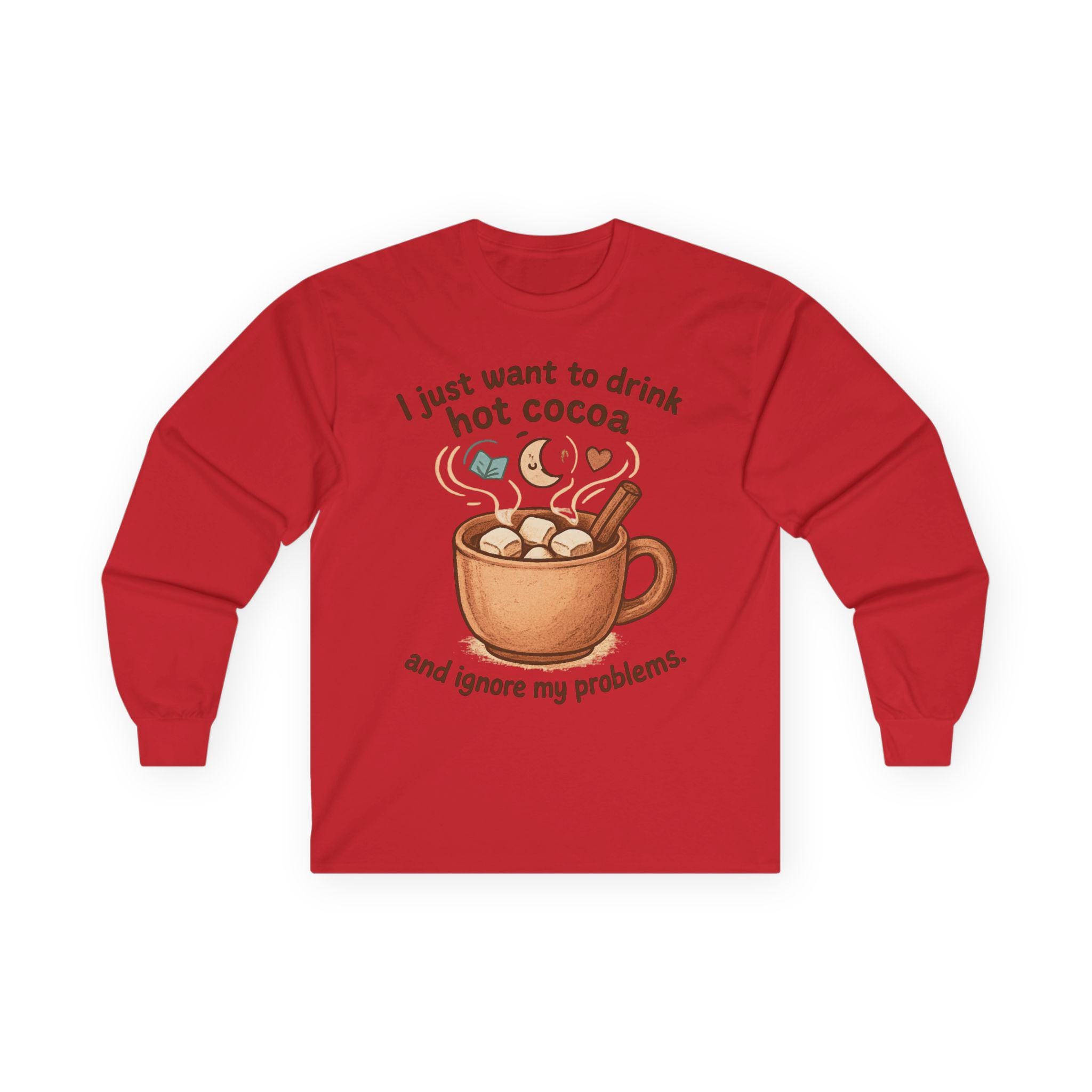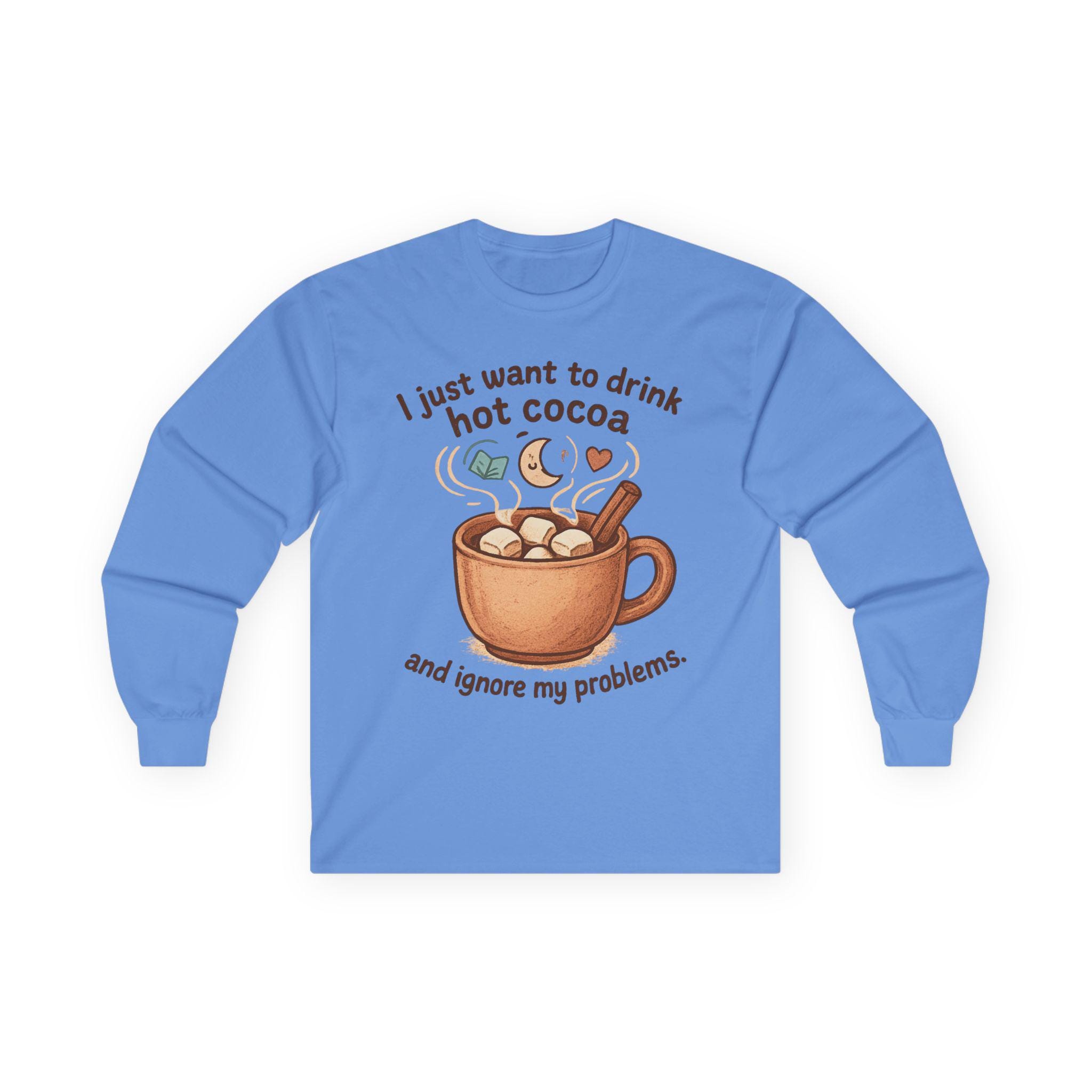 Warm, cozy, and a little bit cheeky — this long sleeve tee wraps you in a thicker vintage-feel cotton and a soft, familiar comfort that invites slow mornings with a steaming mug. The front art shows a bubbly cup of hot cocoa with marshmallows and a cinnamon stick, paired with the tongue-in-cheek line “I just want to drink hot cocoa and ignore my problems.” It reads like a quiet ritual: dim lights, fuzzy socks, and a few peaceful minutes of escapism. The relaxed, classic fit and ribbed collar hold their shape through repeated wear, while the tubular knit and shoulder tape keep the silhouette clean and made-to-last. Reach for it on chilly afternoons, casual coffee dates, or laid-back evenings when you want to feel soothed and seen.