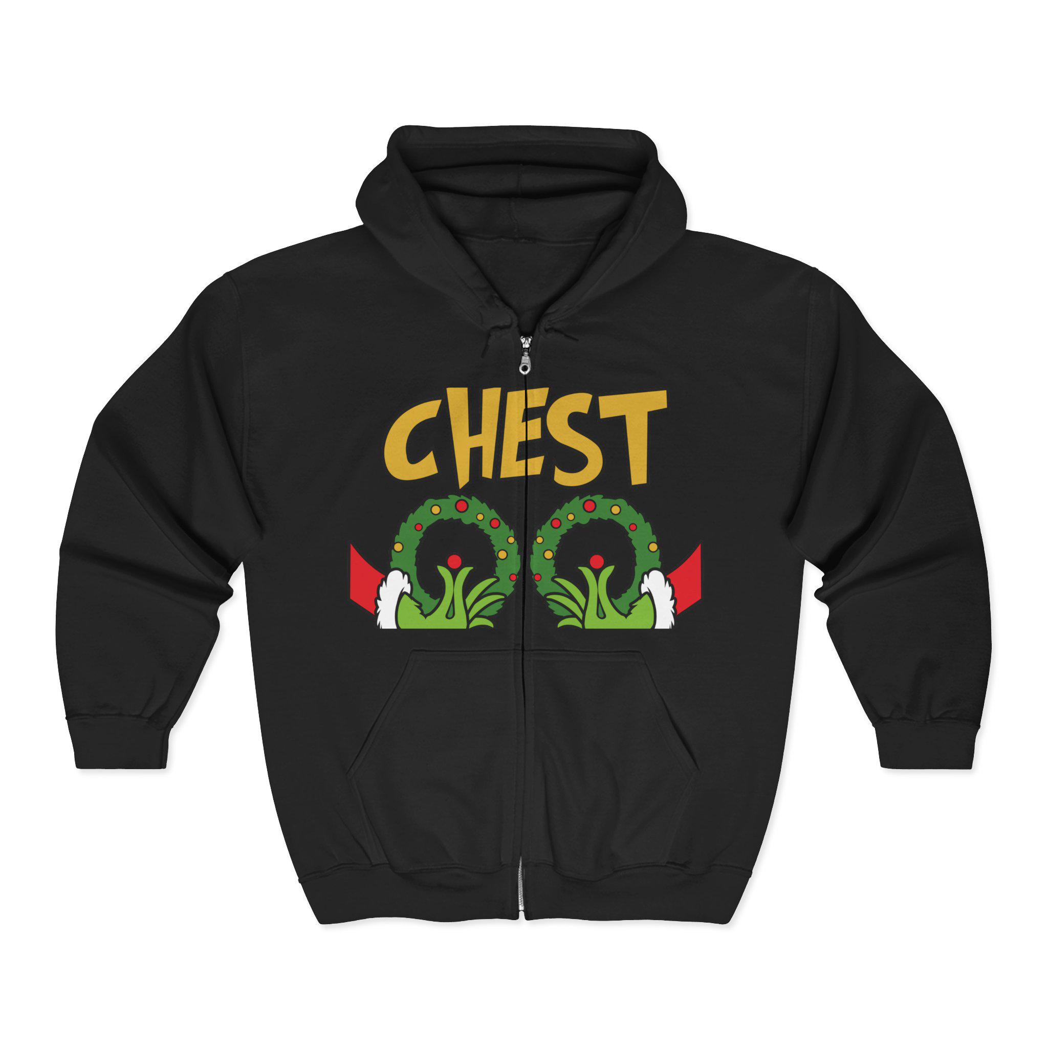 A playful, tongue-in-cheek zip hoodie that leans into cheeky holiday humor. The front shows bold lettering with wreaths forming a playful visual pun, while the back continues the joke with contrasting text and graphics—designed for people who enjoy witty, irreverent seasonal apparel. The midweight fabric and classic fit give it a cozy, lived-in feel for cold evenings around friends or casual gatherings. Wear it to spark laughs, break the ice, and tell a little story without saying a word.