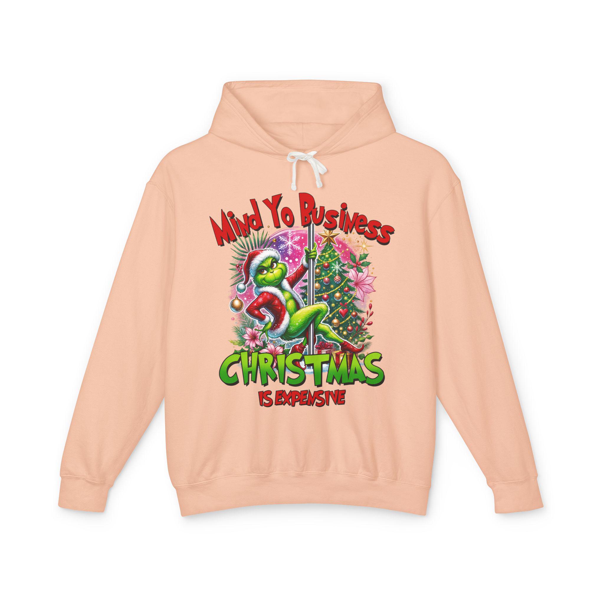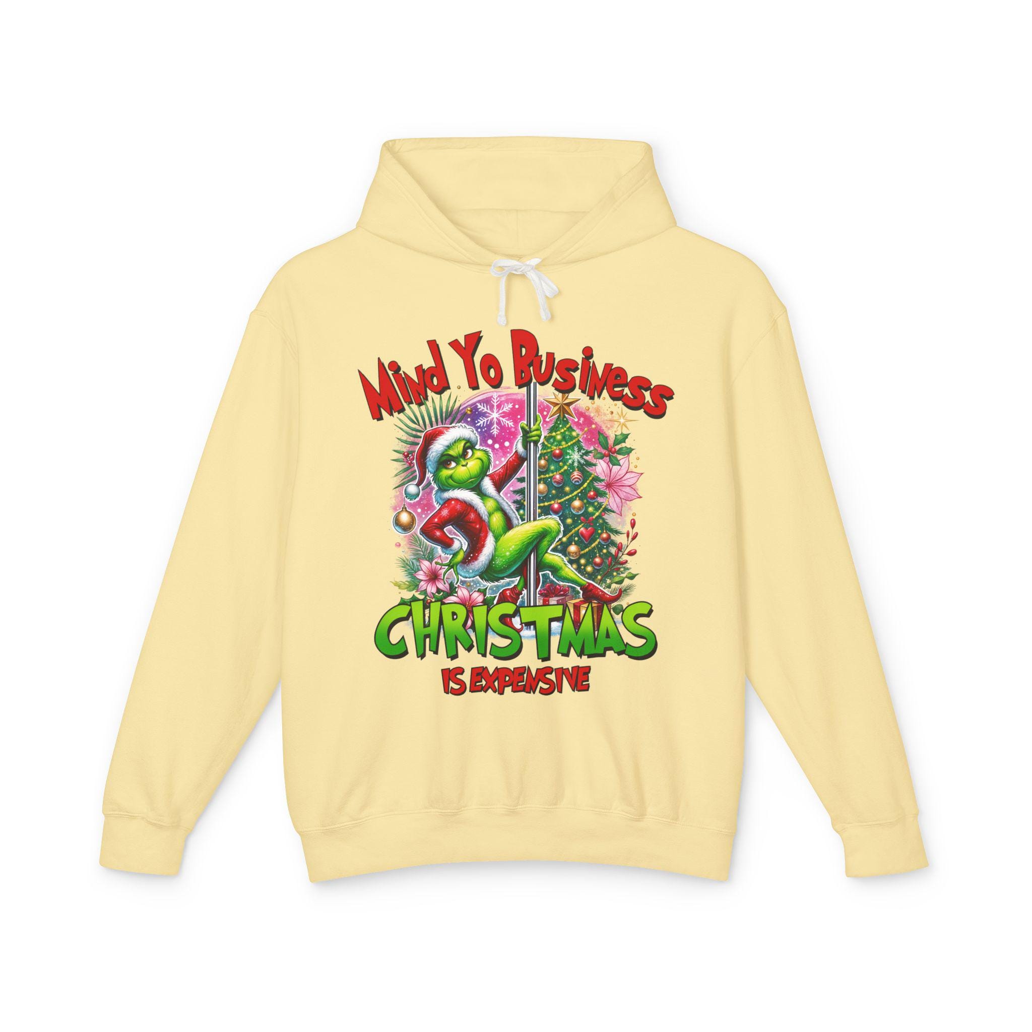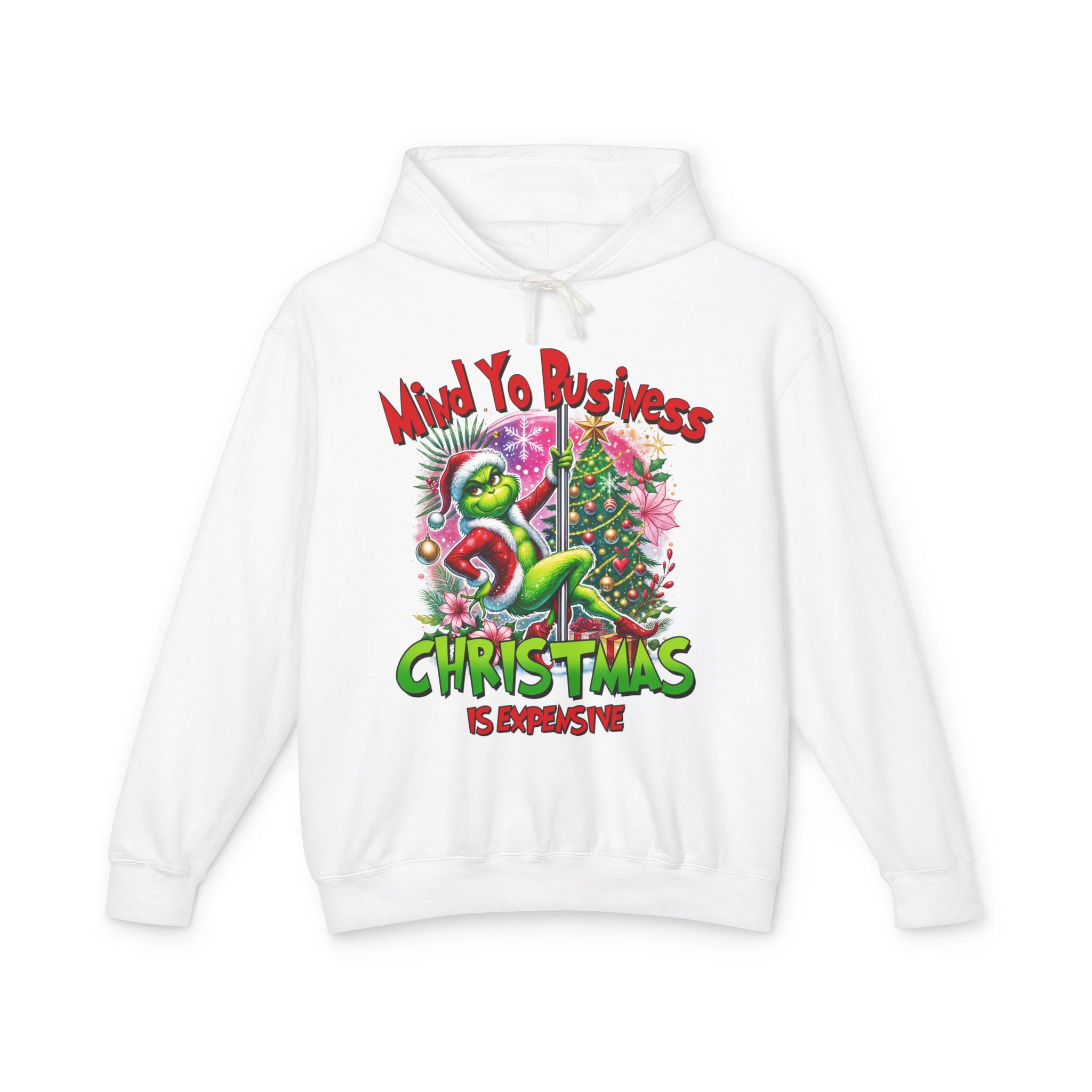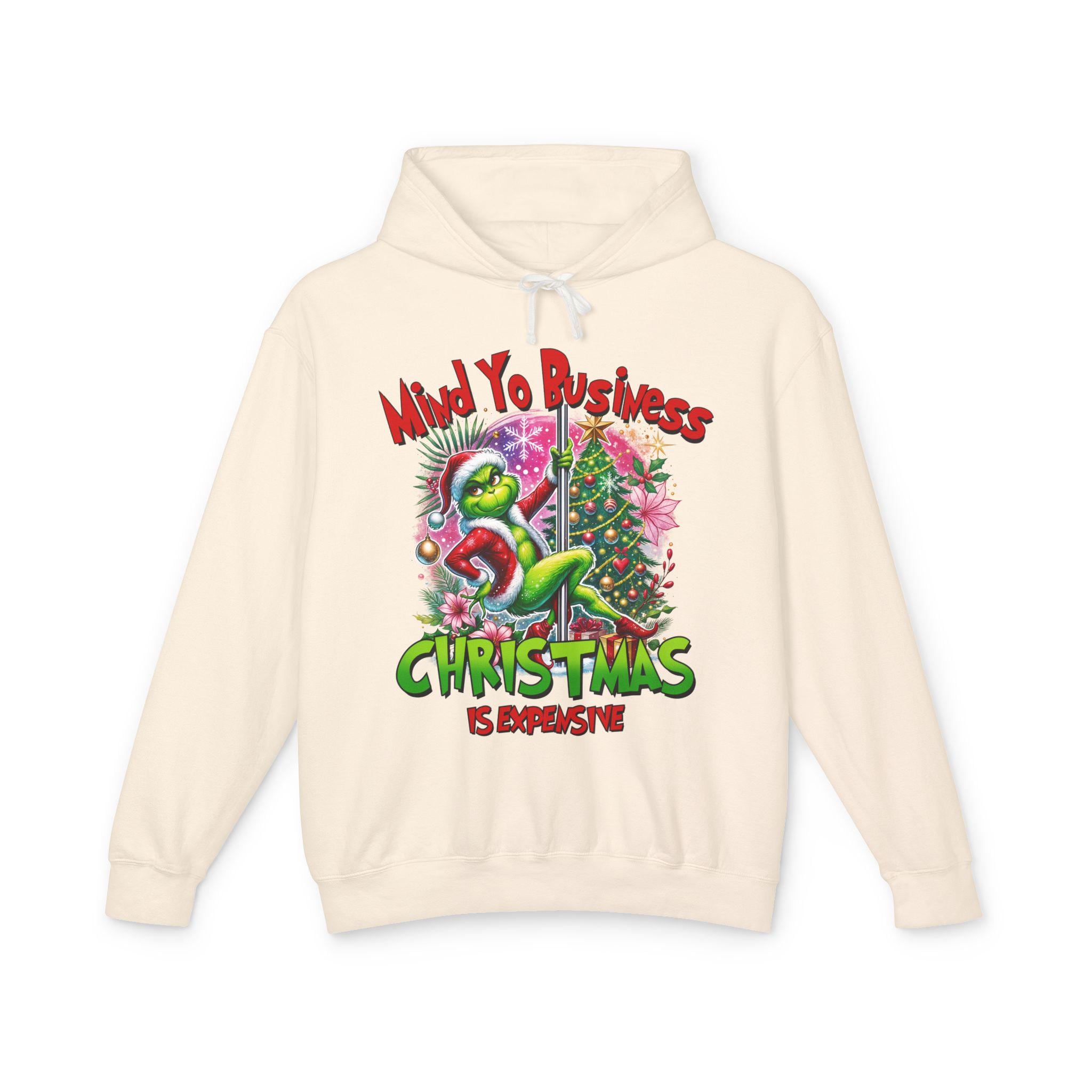 A soft, lightweight hoodie that brings snarky holiday cheer to slow mornings and loud family dinners. The cream fabric showcases a bold, colorful graphic of a grumpy green creature tangled in tinsel beside a decorated tree, captioned with a sassy “Mind Yo Business — Christmas is Expensive.” It sits relaxed on the shoulders with a jersey-lined hood and crisp flatcord, moving easily from errand runs to cozy nights by the tree. Thoughtfully made with low-impact dyes and responsibly sourced U.S. ring-spun cotton, this sweatshirt feels gentle on skin and considerate toward the planet — the kind of go-to layer you reach for when you want humor, comfort, and a little seasonal edge.