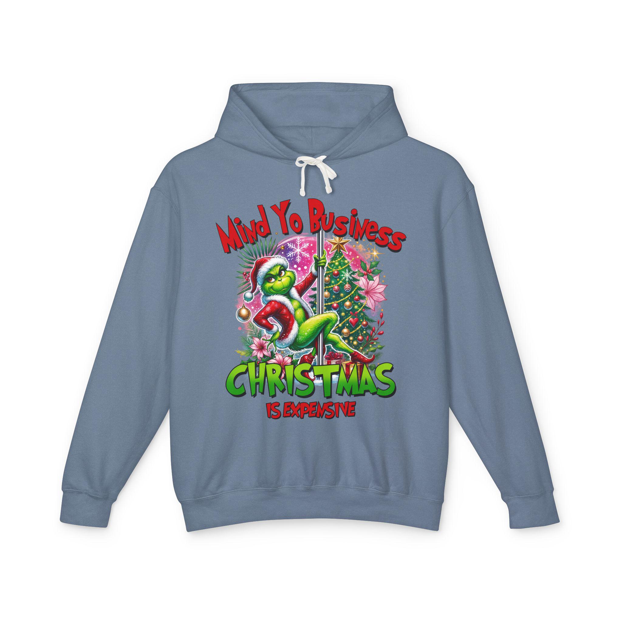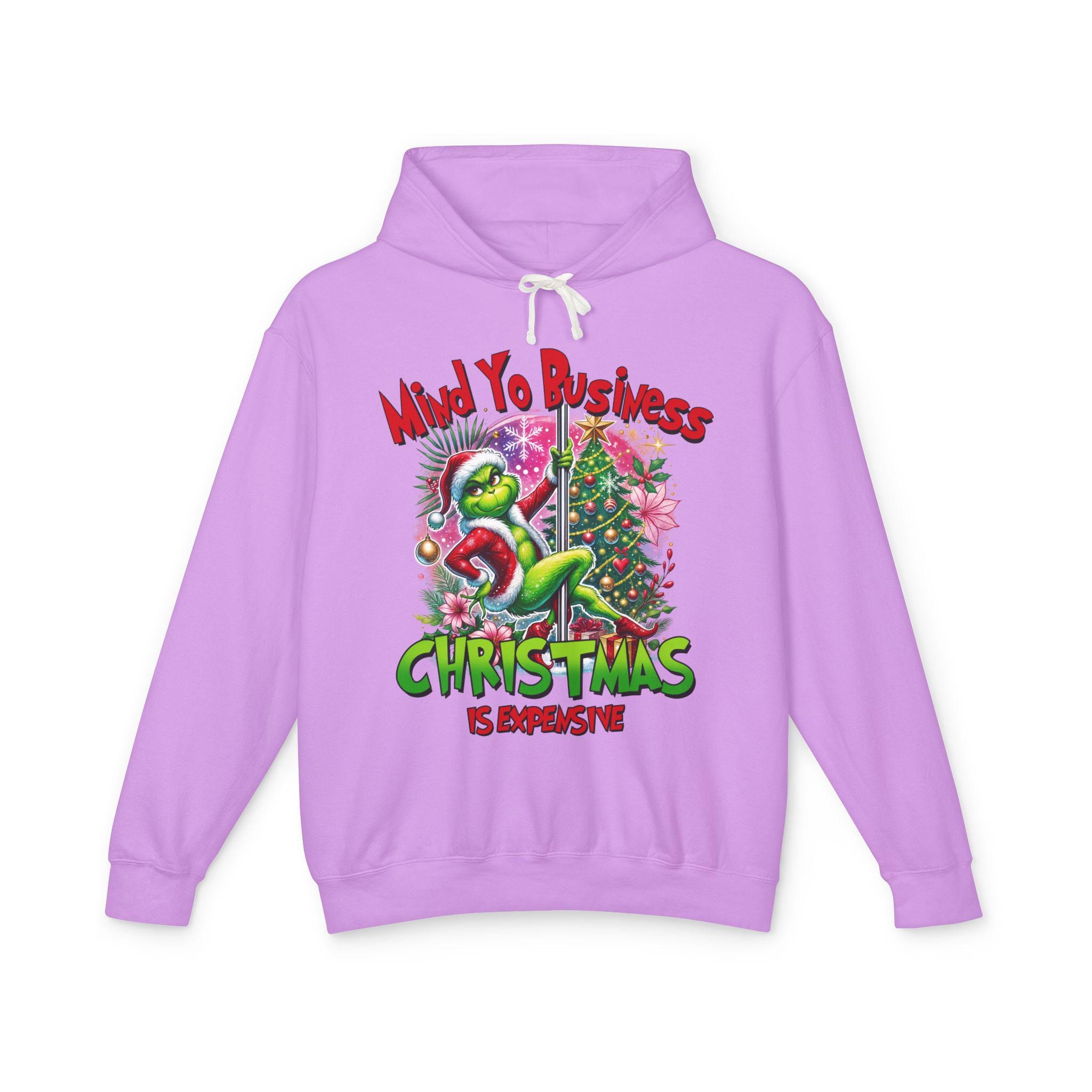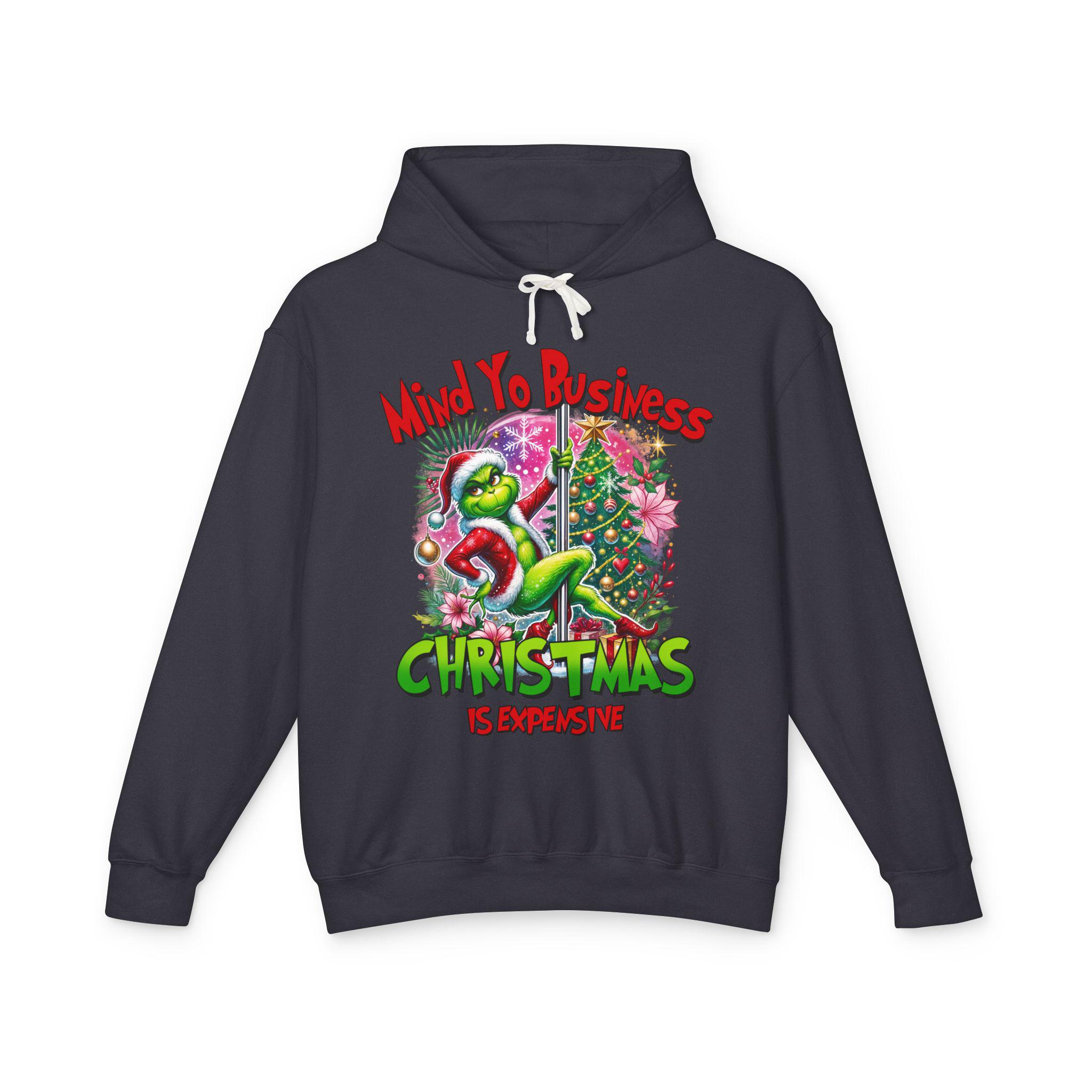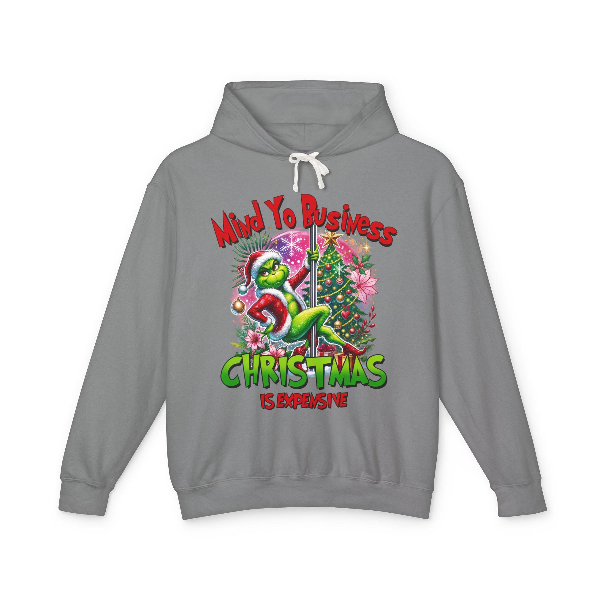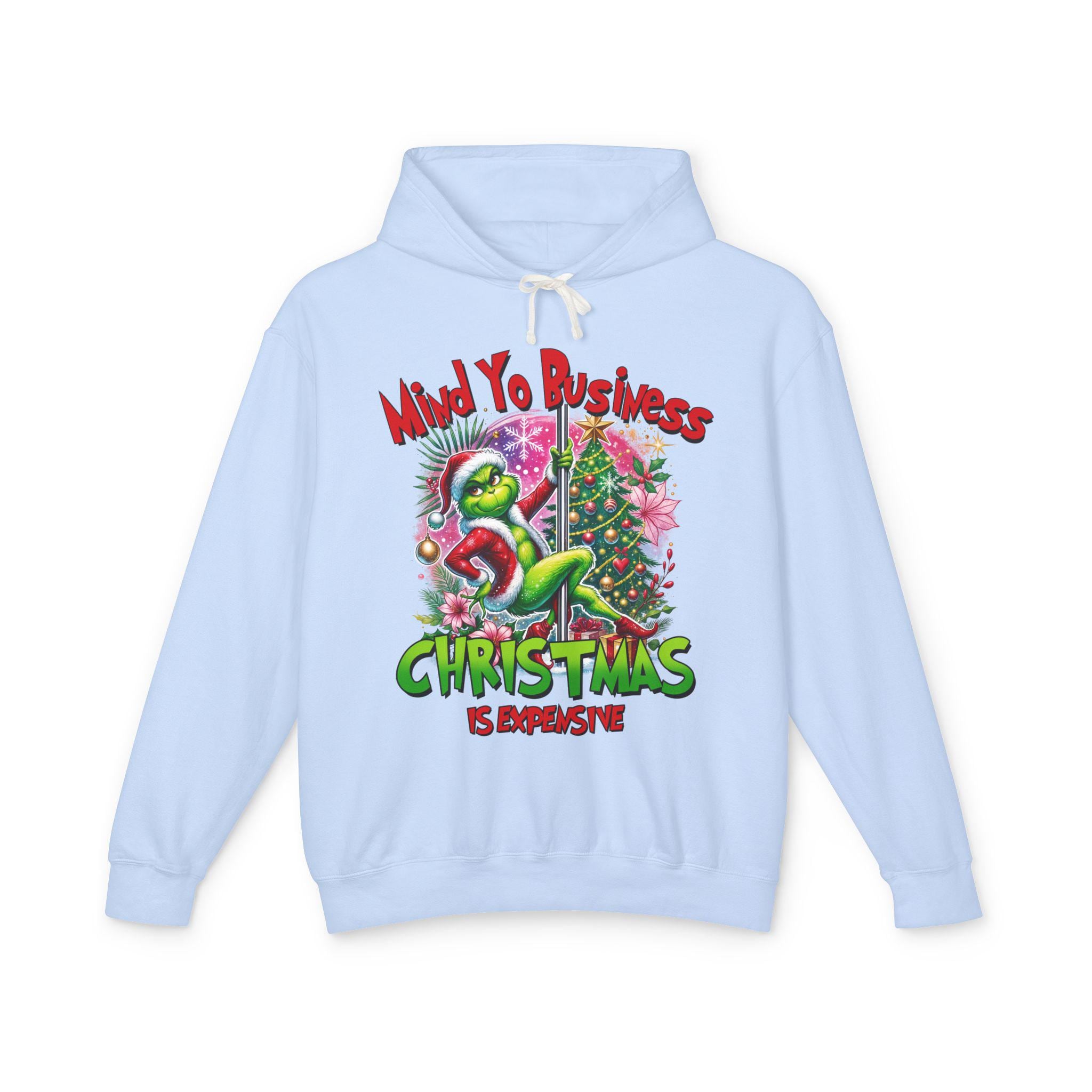 A soft, lightweight hoodie that brings snarky holiday cheer to slow mornings and loud family dinners. The cream fabric showcases a bold, colorful graphic of a grumpy green creature tangled in tinsel beside a decorated tree, captioned with a sassy “Mind Yo Business — Christmas is Expensive.” It sits relaxed on the shoulders with a jersey-lined hood and crisp flatcord, moving easily from errand runs to cozy nights by the tree. Thoughtfully made with low-impact dyes and responsibly sourced U.S. ring-spun cotton, this sweatshirt feels gentle on skin and considerate toward the planet — the kind of go-to layer you reach for when you want humor, comfort, and a little seasonal edge.