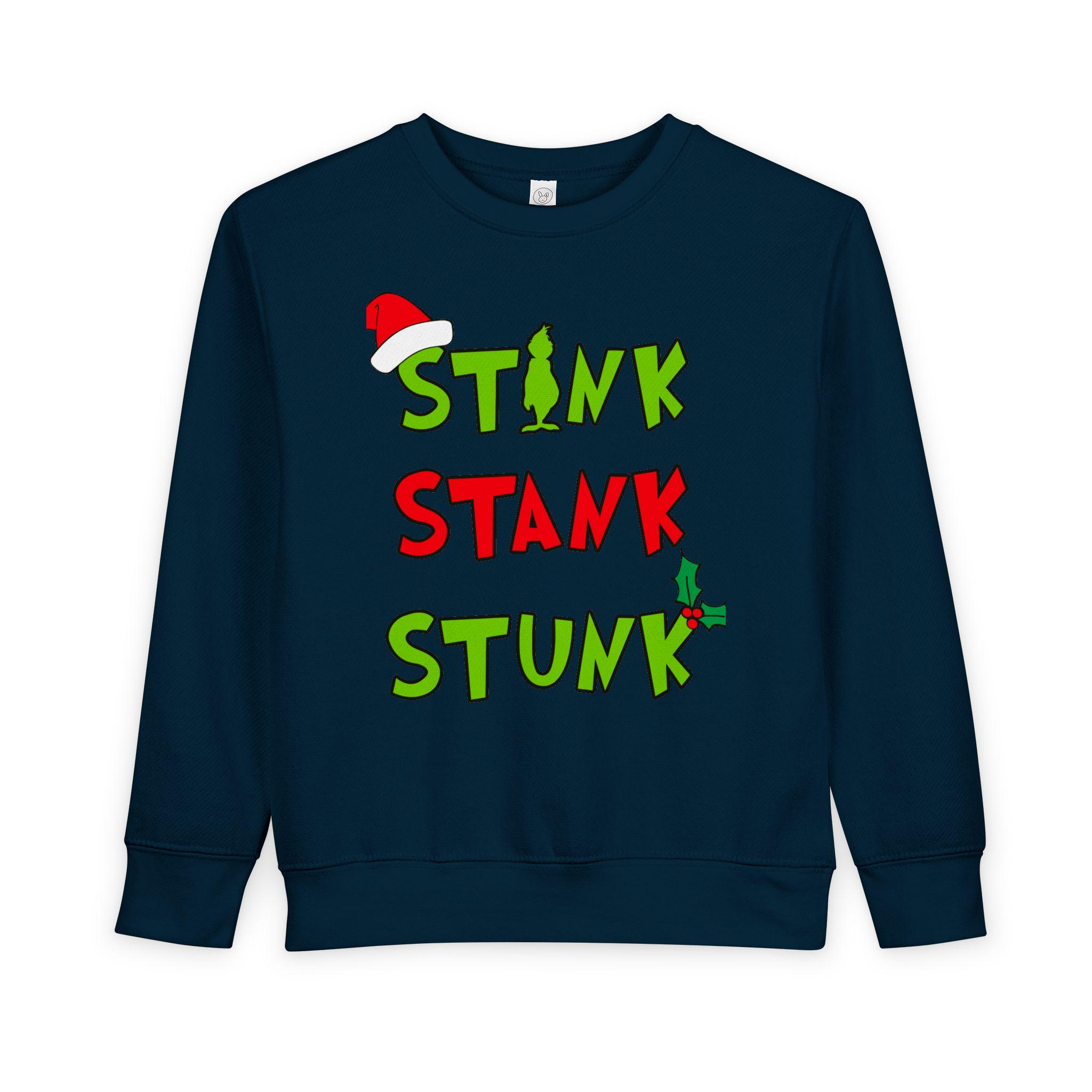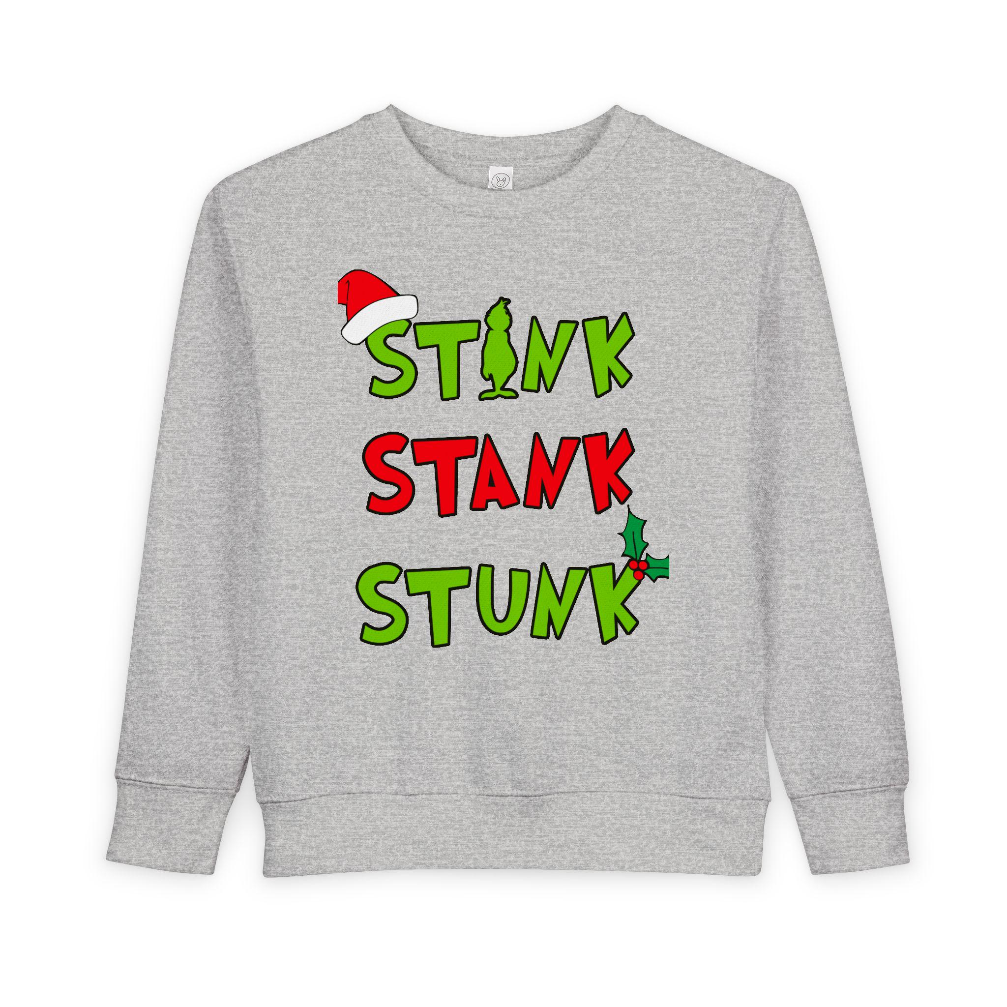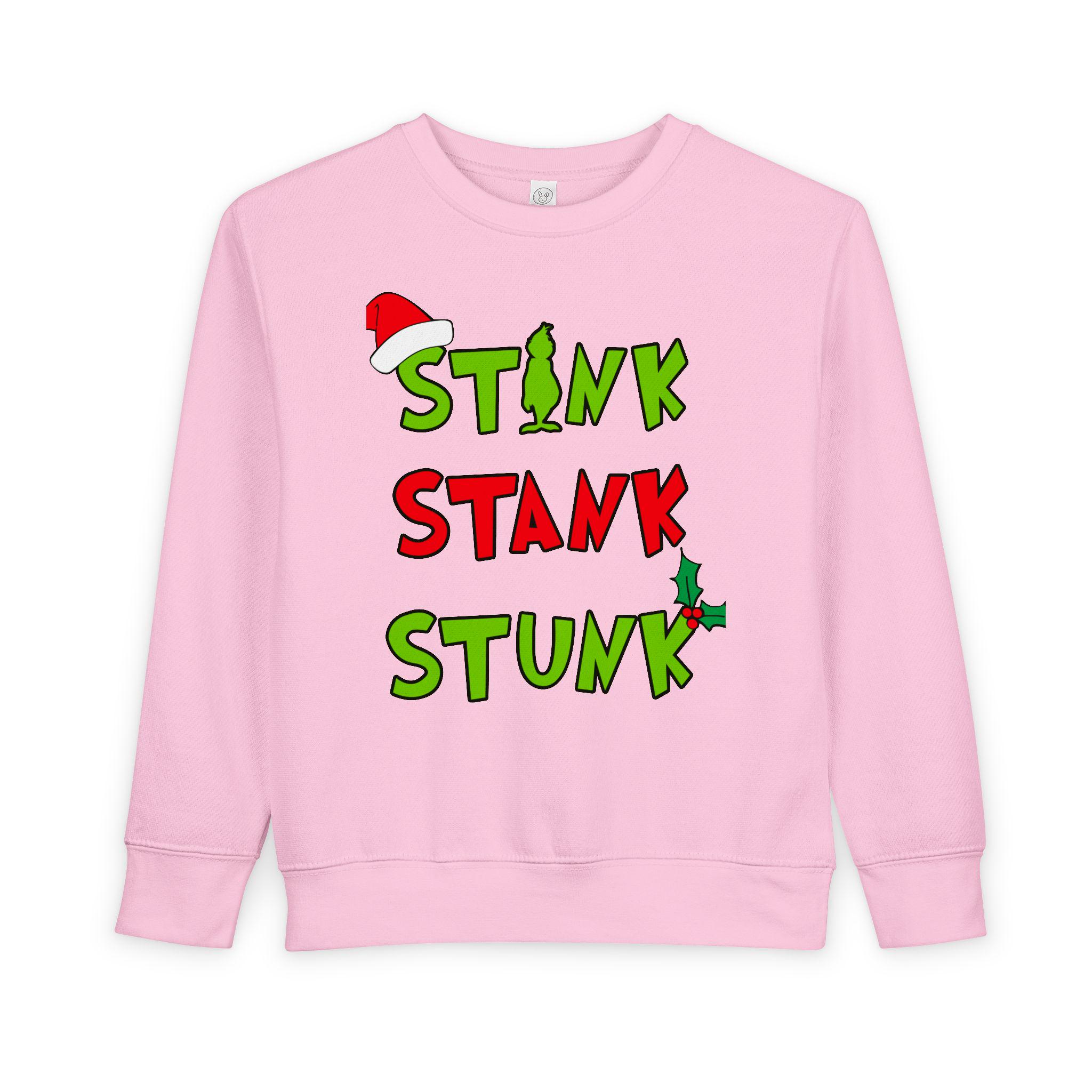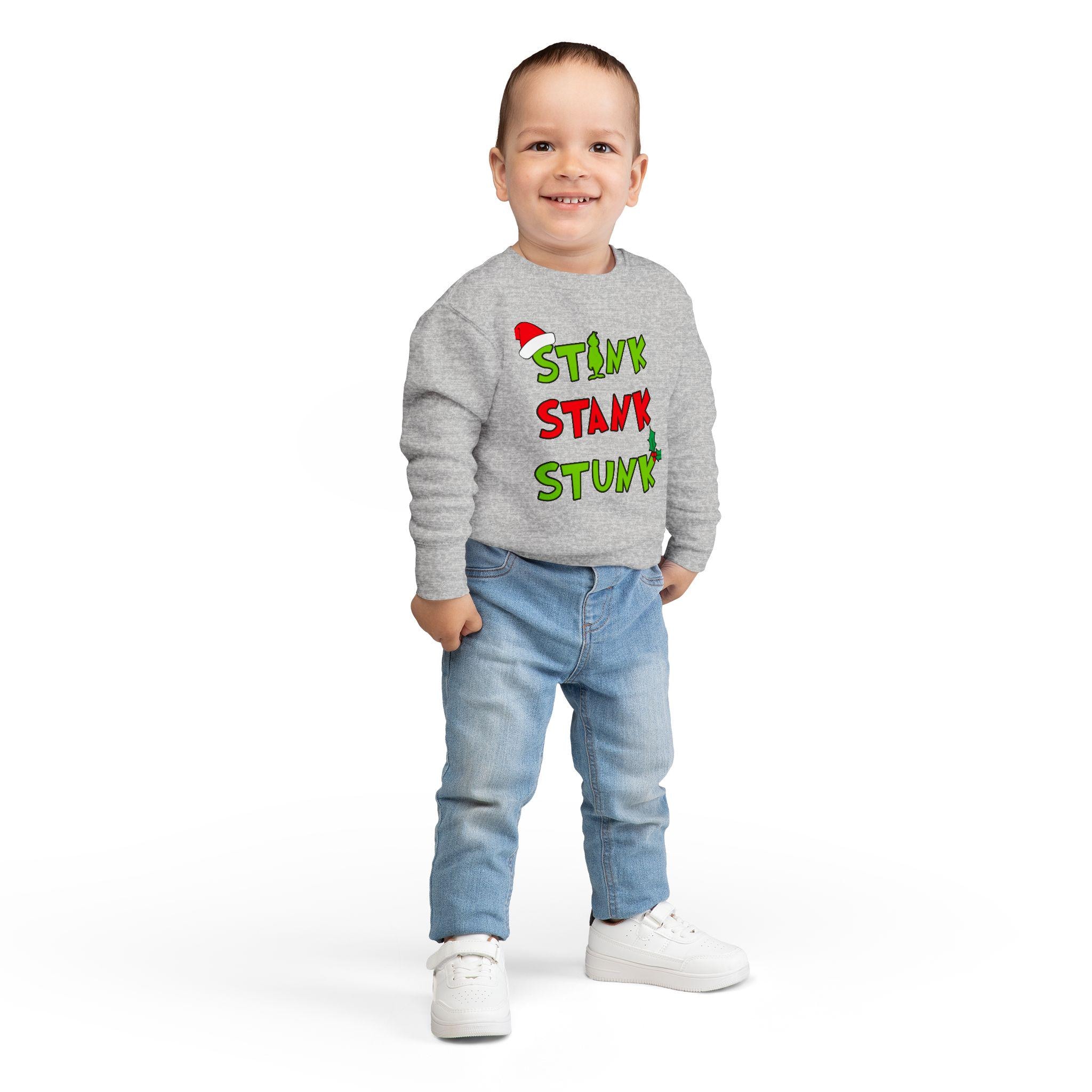 A cozy toddler sweatshirt with playful holiday attitude. Soft, mid-weight fleece wraps little ones in warmth while the cheeky “Stink Stank Stunk” design—bright red and green letters with a Santa hat and holly accents—adds mischievous seasonal charm. The relaxed crewneck silhouette and ribbed cuffs create an easy layer for carol-singing mornings, cookie-baking messes, or family photos that lean into holiday humor. Breathable cotton-blend fabric and a tear-away label keep comfort front and center, so kids can move, snack, and nap without fuss. This sweatshirt reads like a wink from the holidays—fun, slightly silly, and made for memory-making moments.