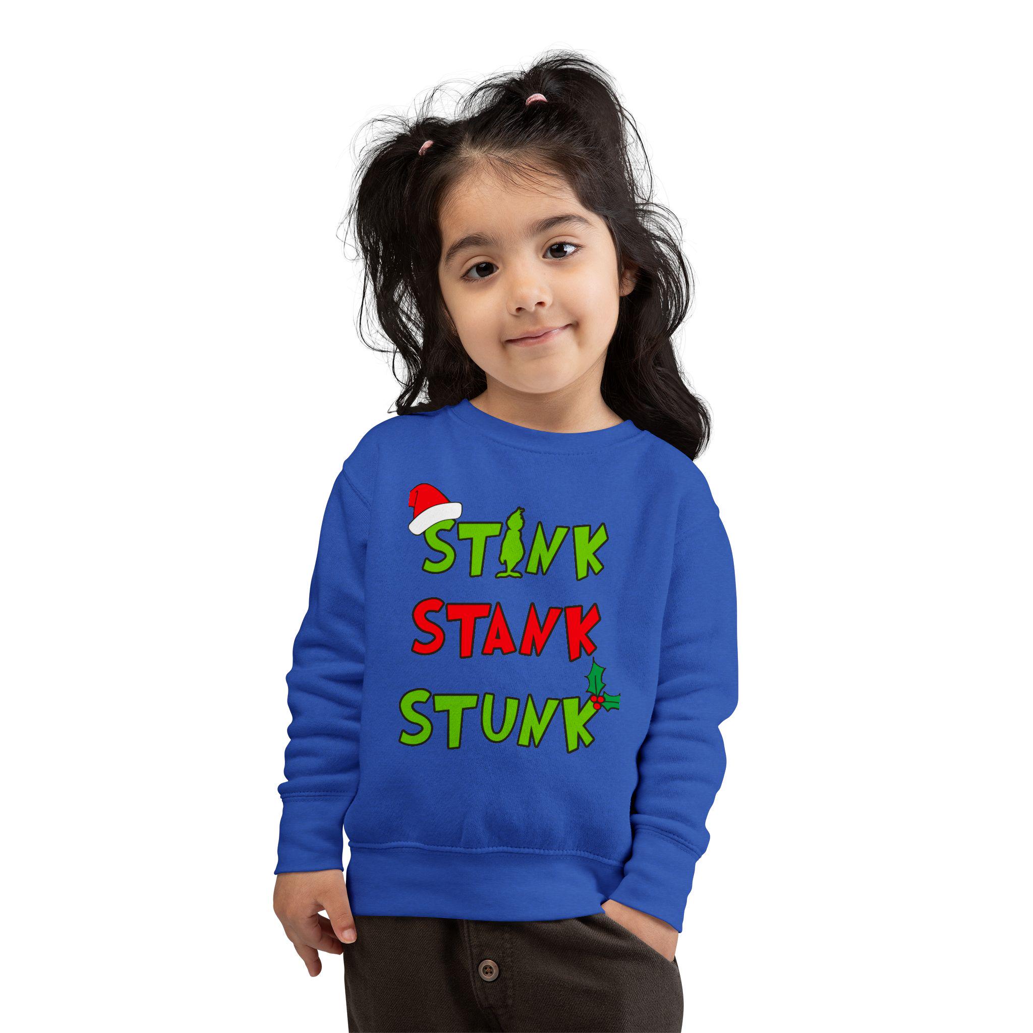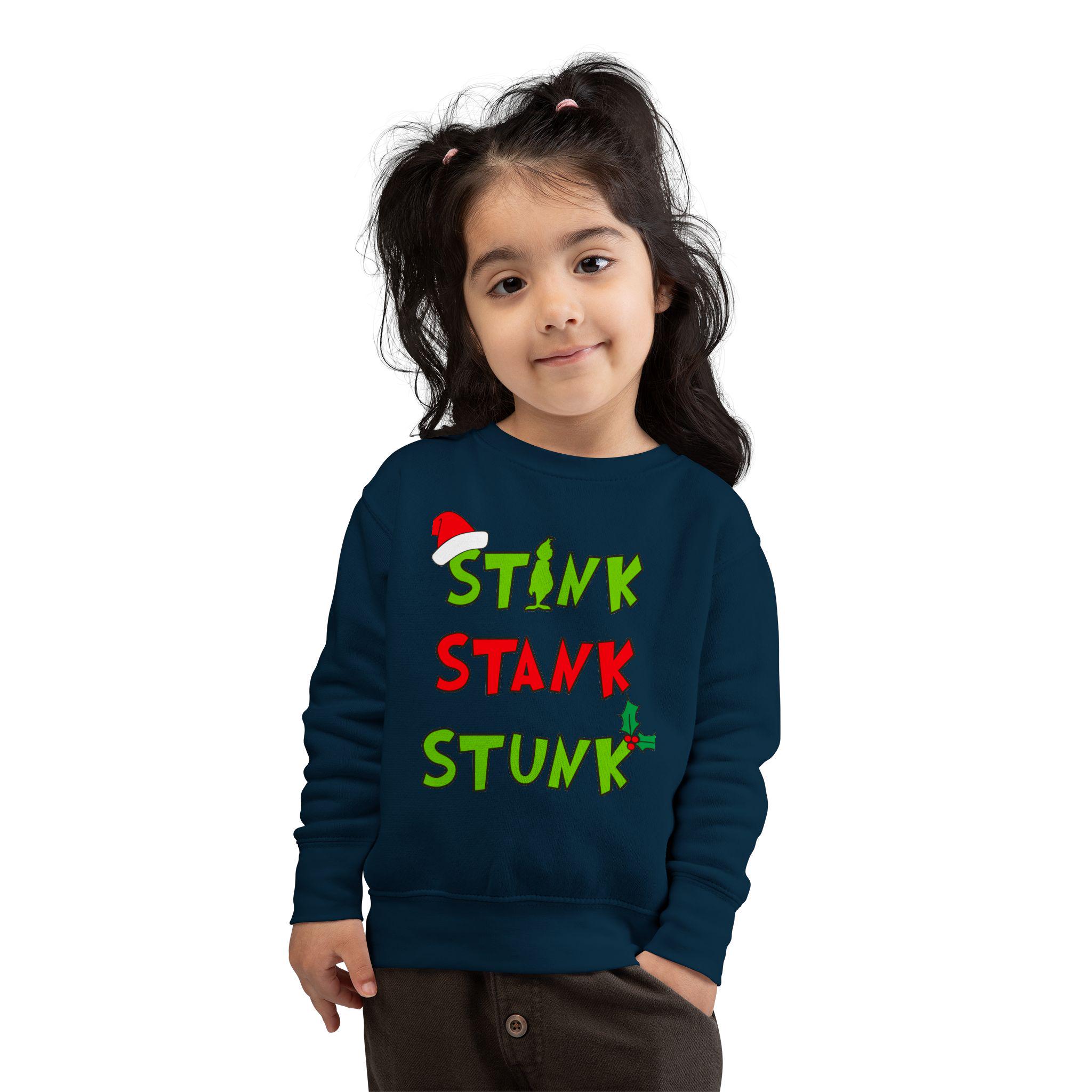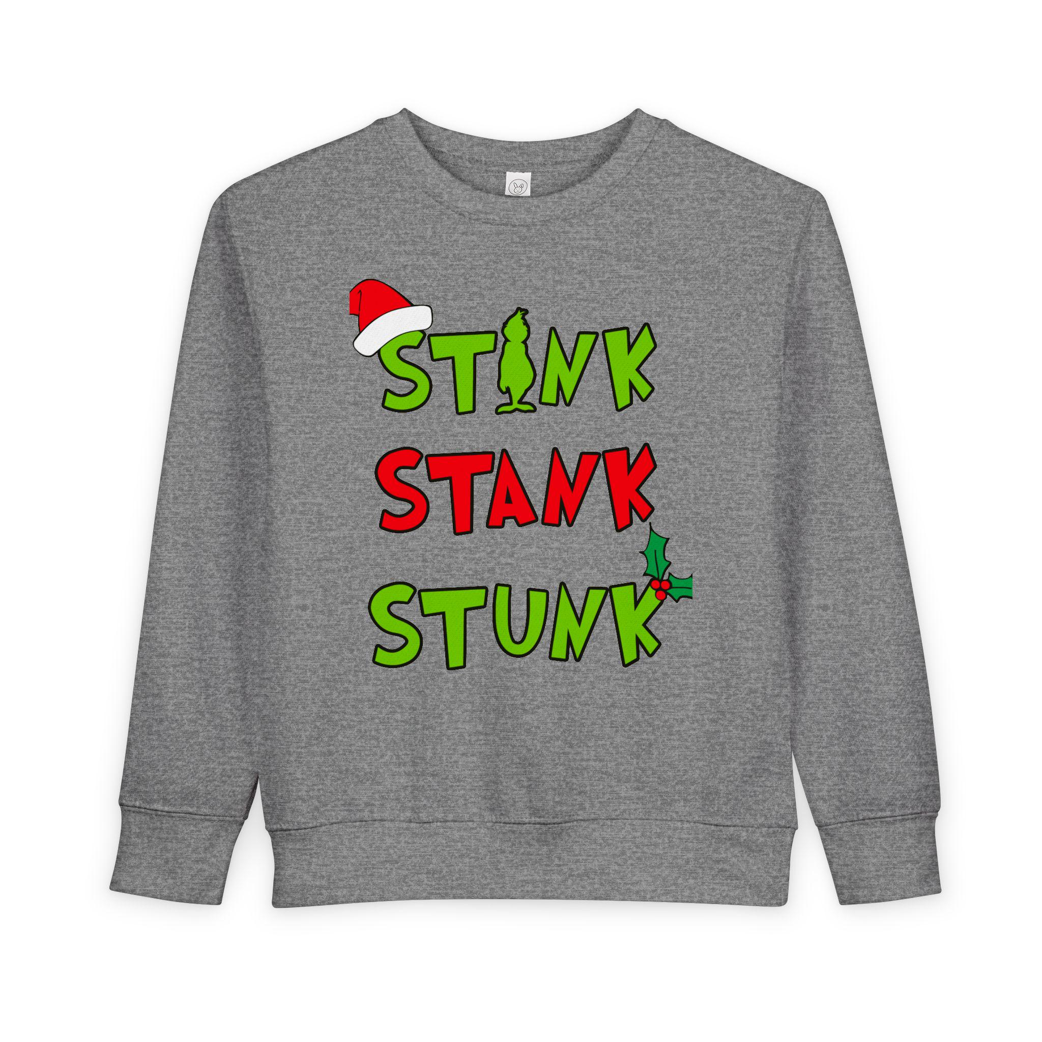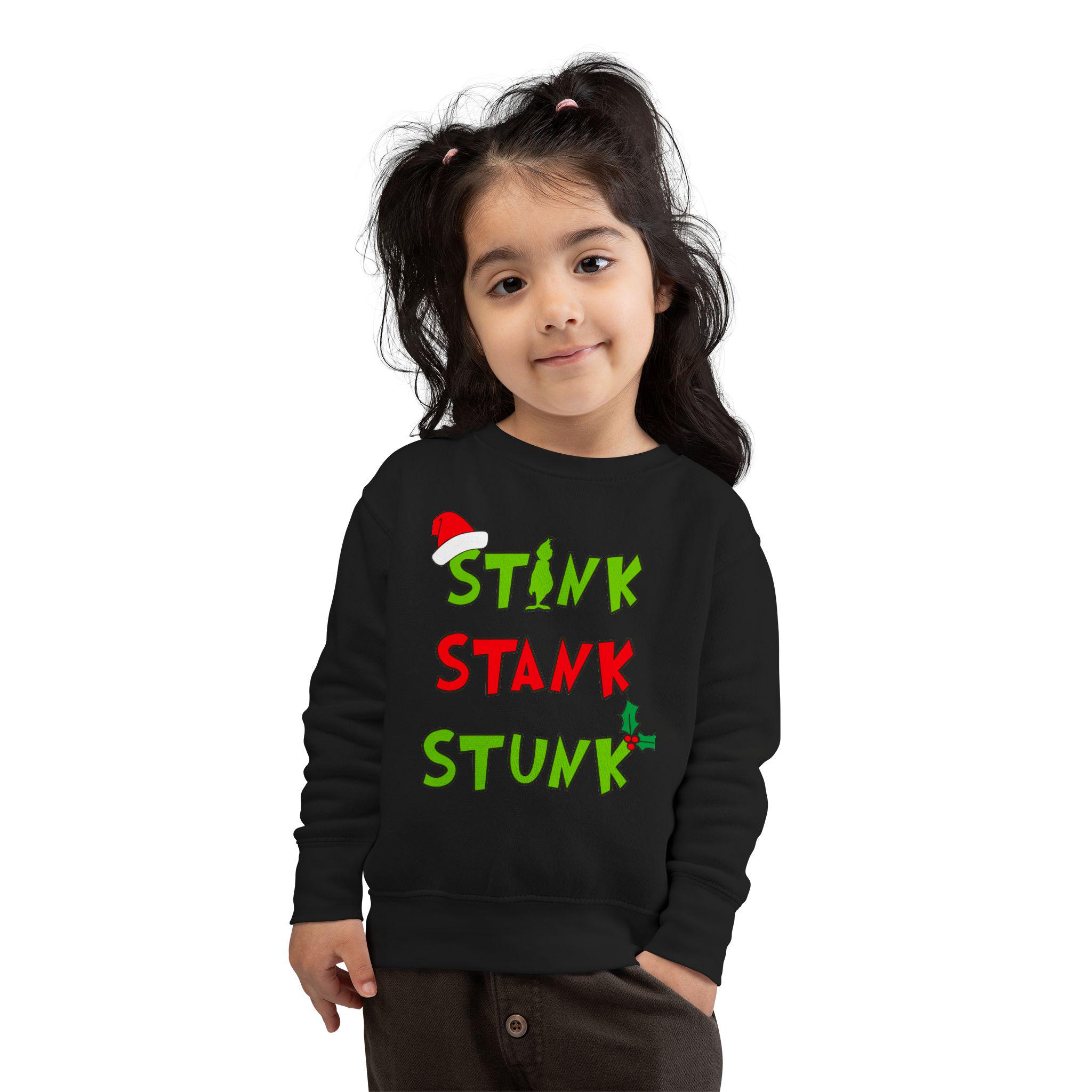 A cozy toddler sweatshirt with playful holiday attitude. Soft, mid-weight fleece wraps little ones in warmth while the cheeky “Stink Stank Stunk” design—bright red and green letters with a Santa hat and holly accents—adds mischievous seasonal charm. The relaxed crewneck silhouette and ribbed cuffs create an easy layer for carol-singing mornings, cookie-baking messes, or family photos that lean into holiday humor. Breathable cotton-blend fabric and a tear-away label keep comfort front and center, so kids can move, snack, and nap without fuss. This sweatshirt reads like a wink from the holidays—fun, slightly silly, and made for memory-making moments.