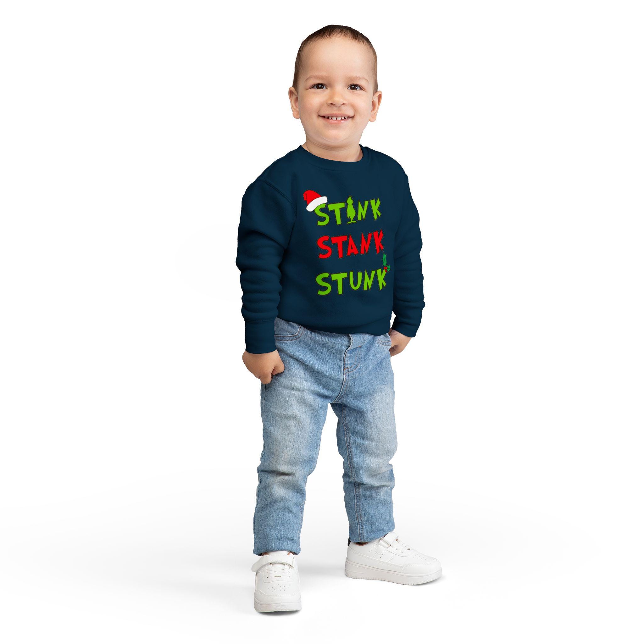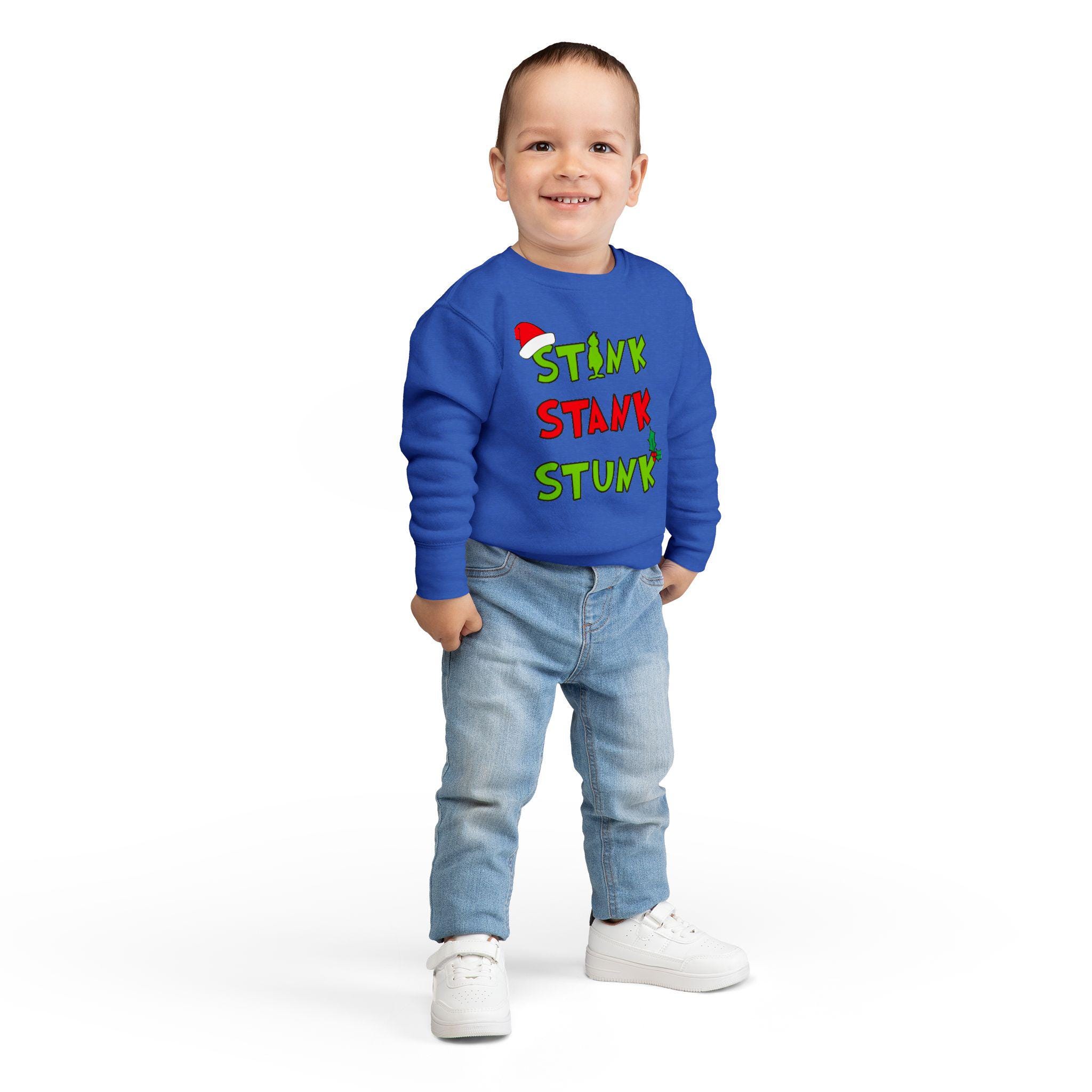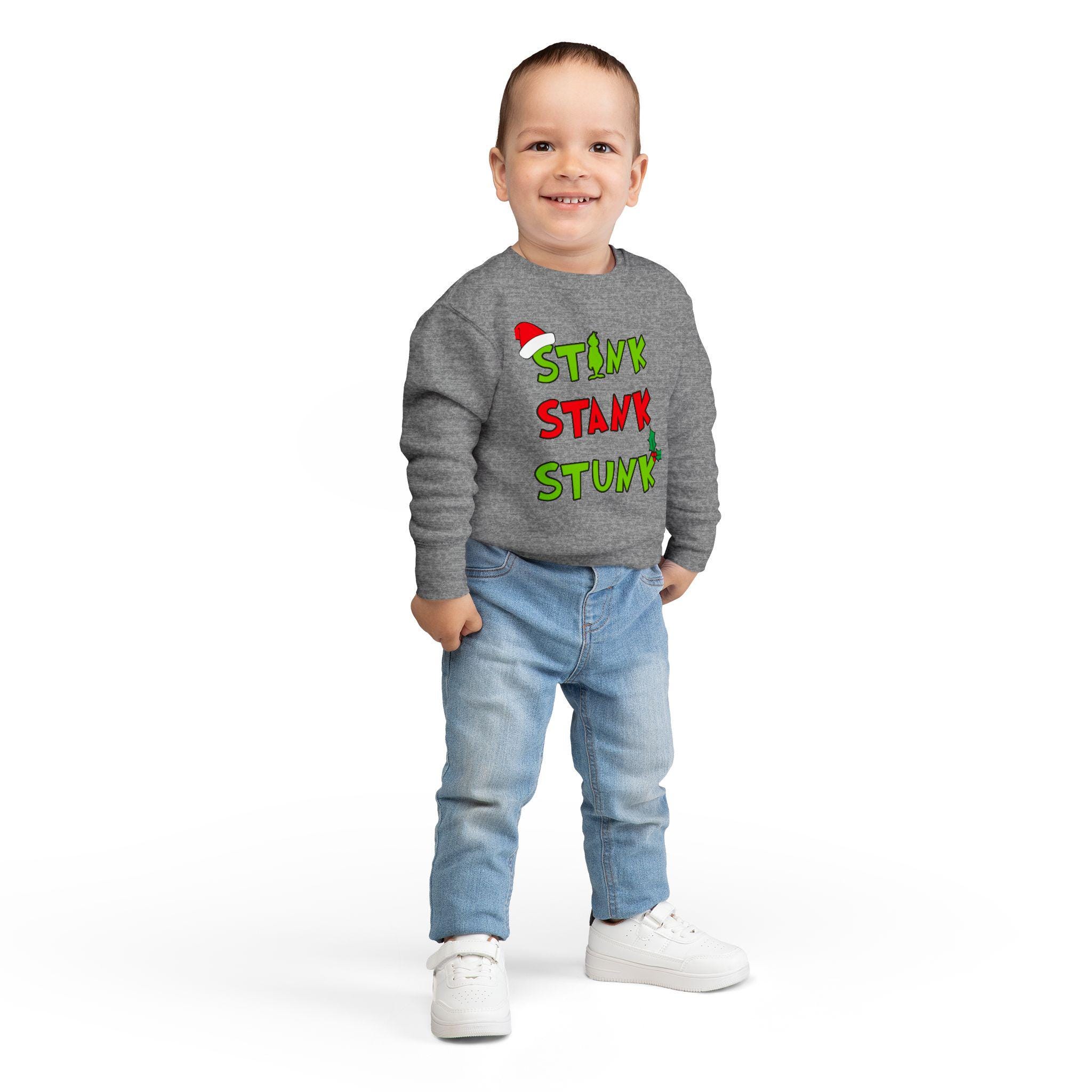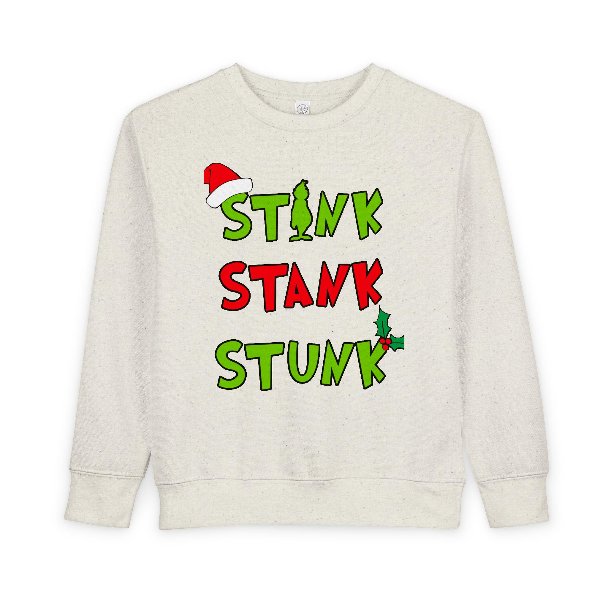 A cozy toddler sweatshirt with playful holiday attitude. Soft, mid-weight fleece wraps little ones in warmth while the cheeky “Stink Stank Stunk” design—bright red and green letters with a Santa hat and holly accents—adds mischievous seasonal charm. The relaxed crewneck silhouette and ribbed cuffs create an easy layer for carol-singing mornings, cookie-baking messes, or family photos that lean into holiday humor. Breathable cotton-blend fabric and a tear-away label keep comfort front and center, so kids can move, snack, and nap without fuss. This sweatshirt reads like a wink from the holidays—fun, slightly silly, and made for memory-making moments.
