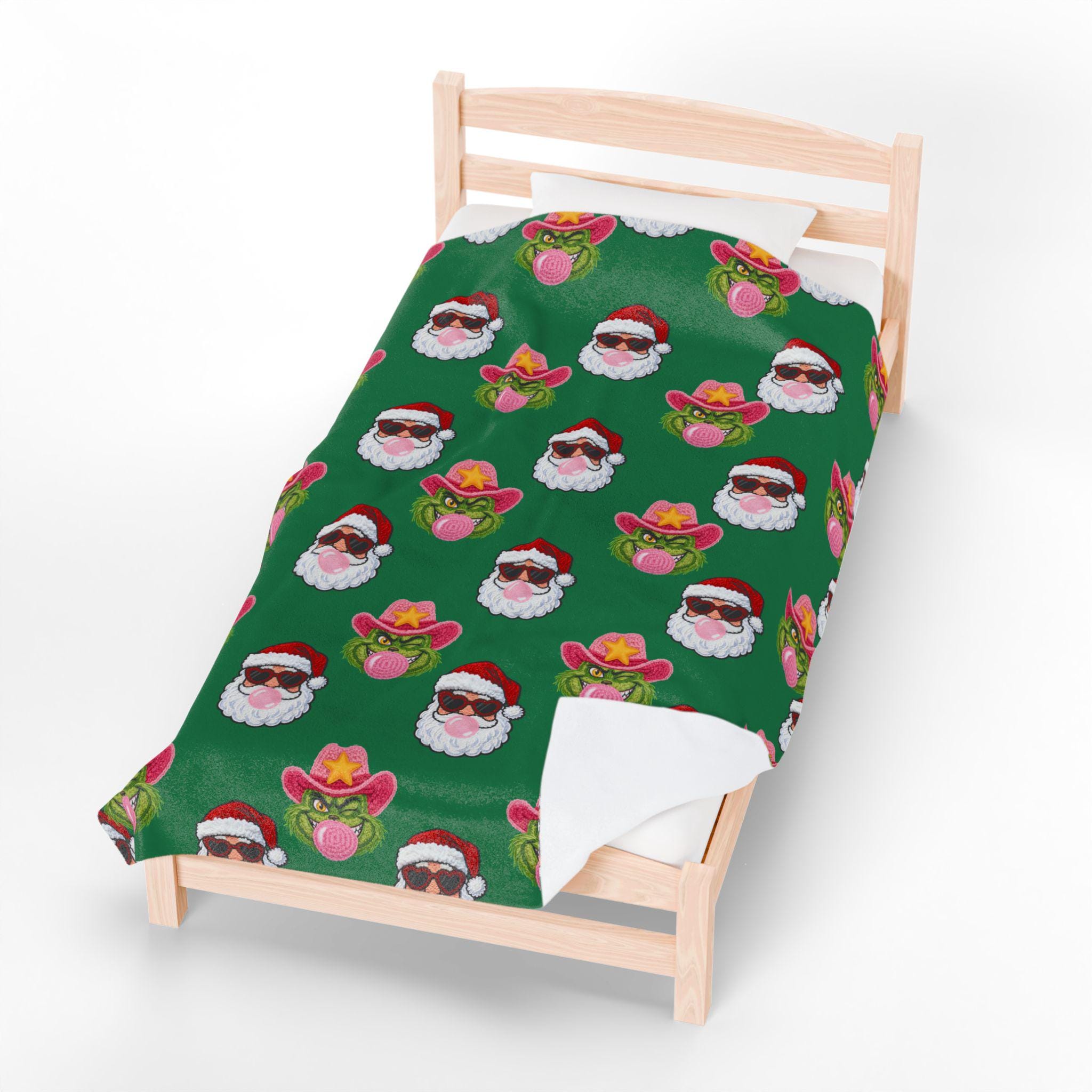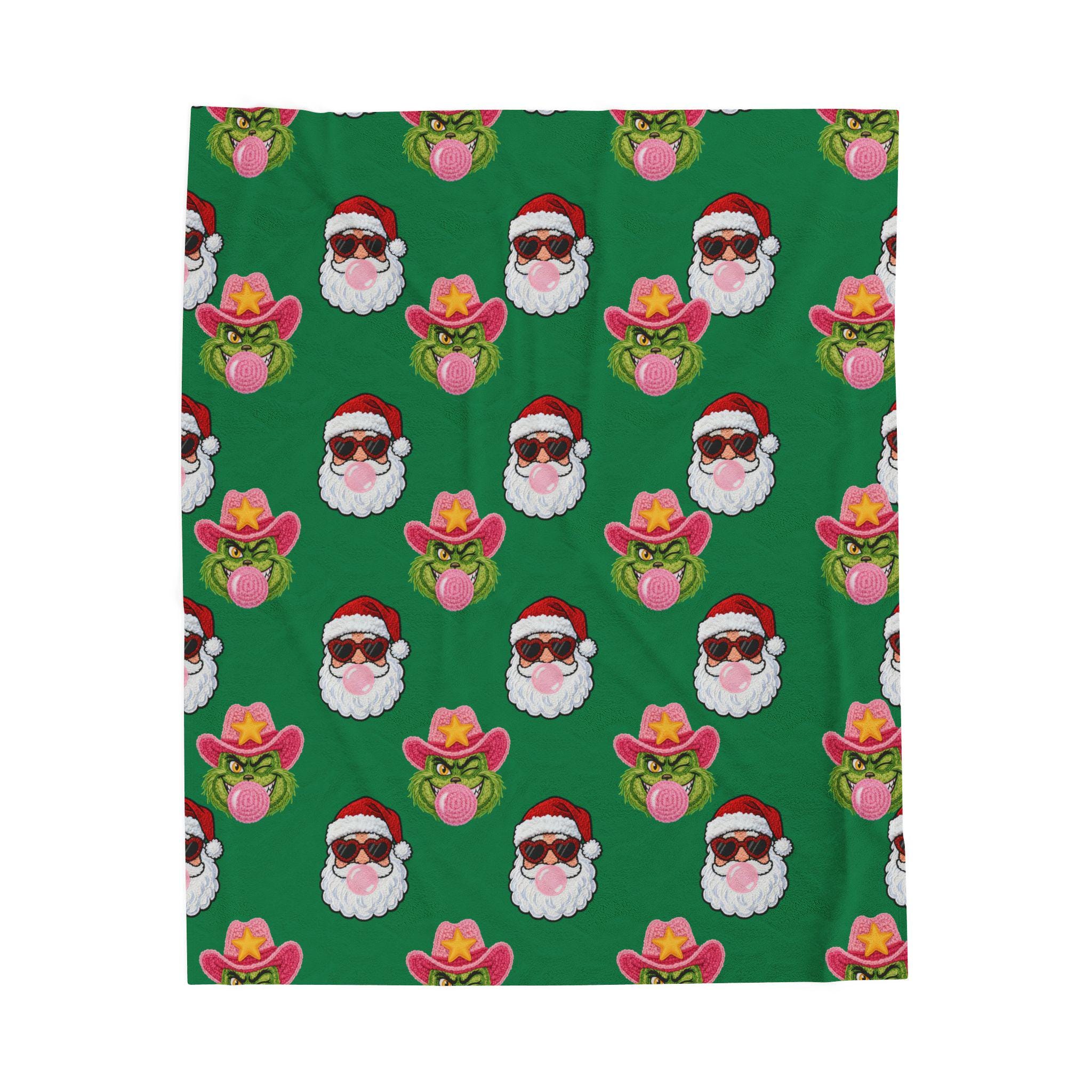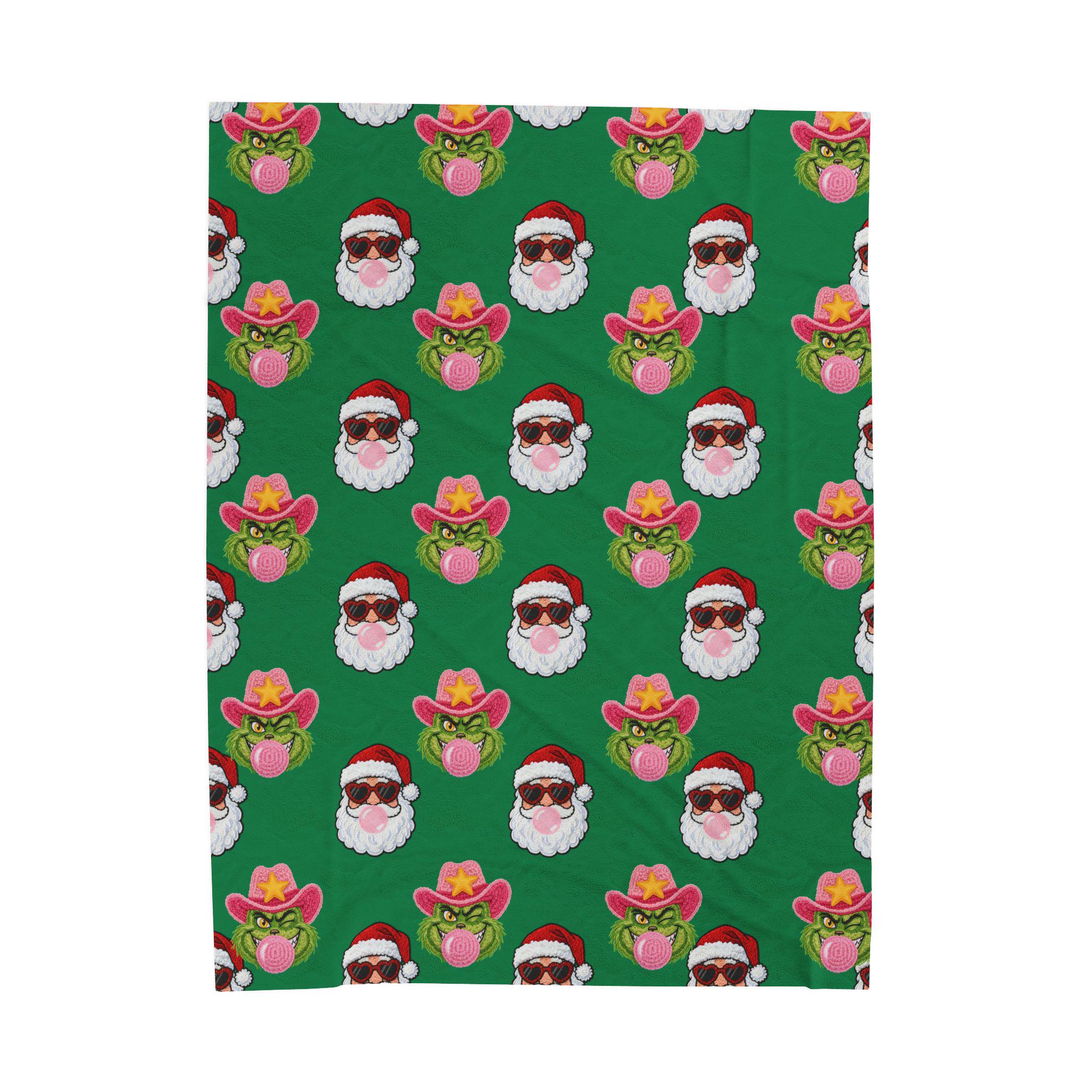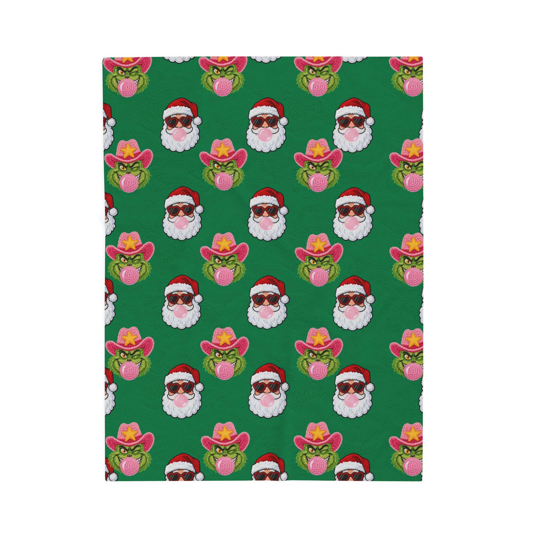 Wrap yourself in playful holiday spirit with this velveteen plush blanket. Soft, medium-weight fabric cradles you while a festive pattern of Santa faces—some sporting shades, others rocking cowboy hats and bubblegum—repeats across a rich green field. It’s the kind of cozy that invites movie nights, slow mornings by twinkling lights, and laughing around a living room full of mismatched socks. The vibrant one-sided print keeps the design bright after many washes while the plush side stays sumptuously soft against skin. Use it on the couch, draped over a favorite chair, or tucked around your shoulders when the night turns crisp—this blanket brings a little irreverent cheer to holiday moments and everyday downtime alike.