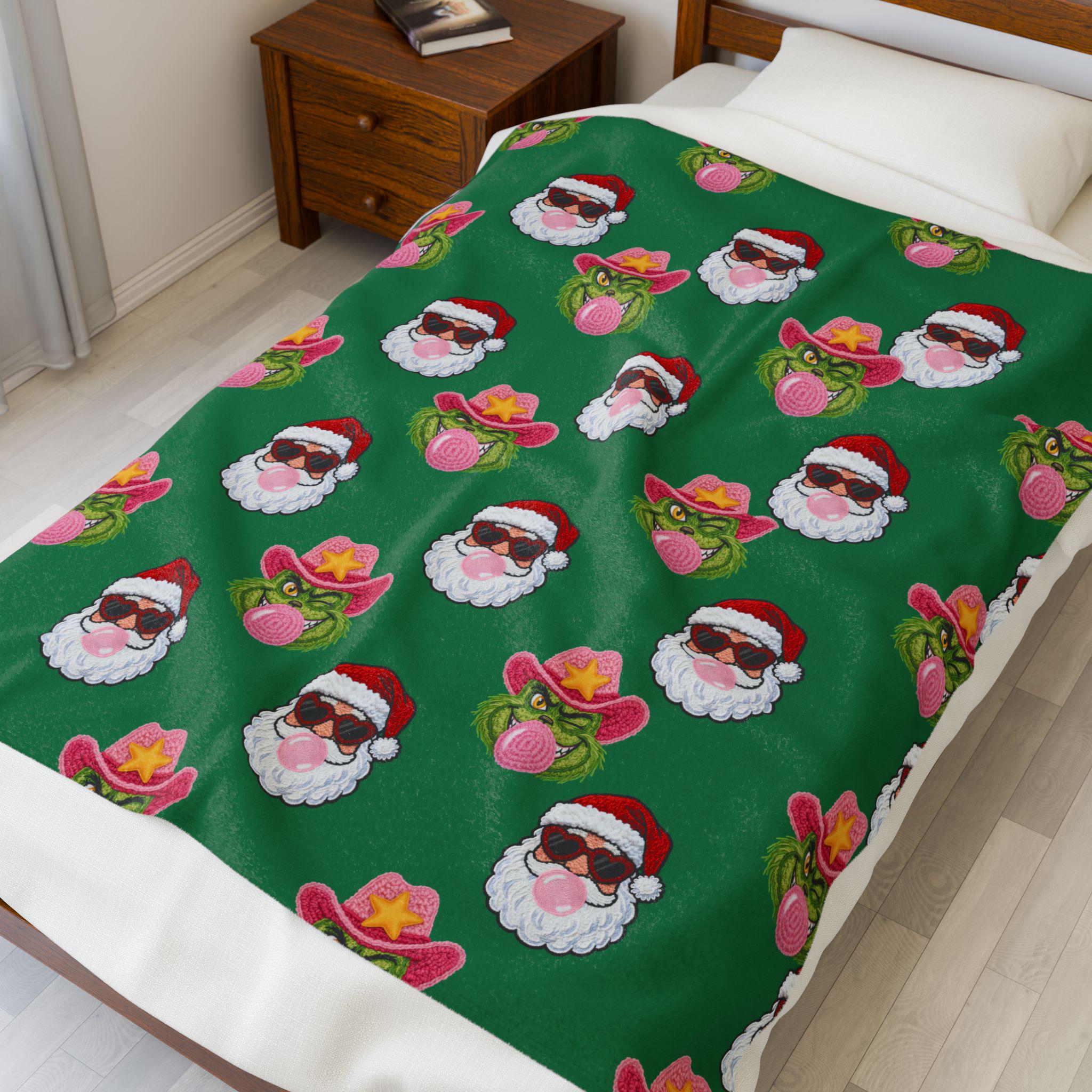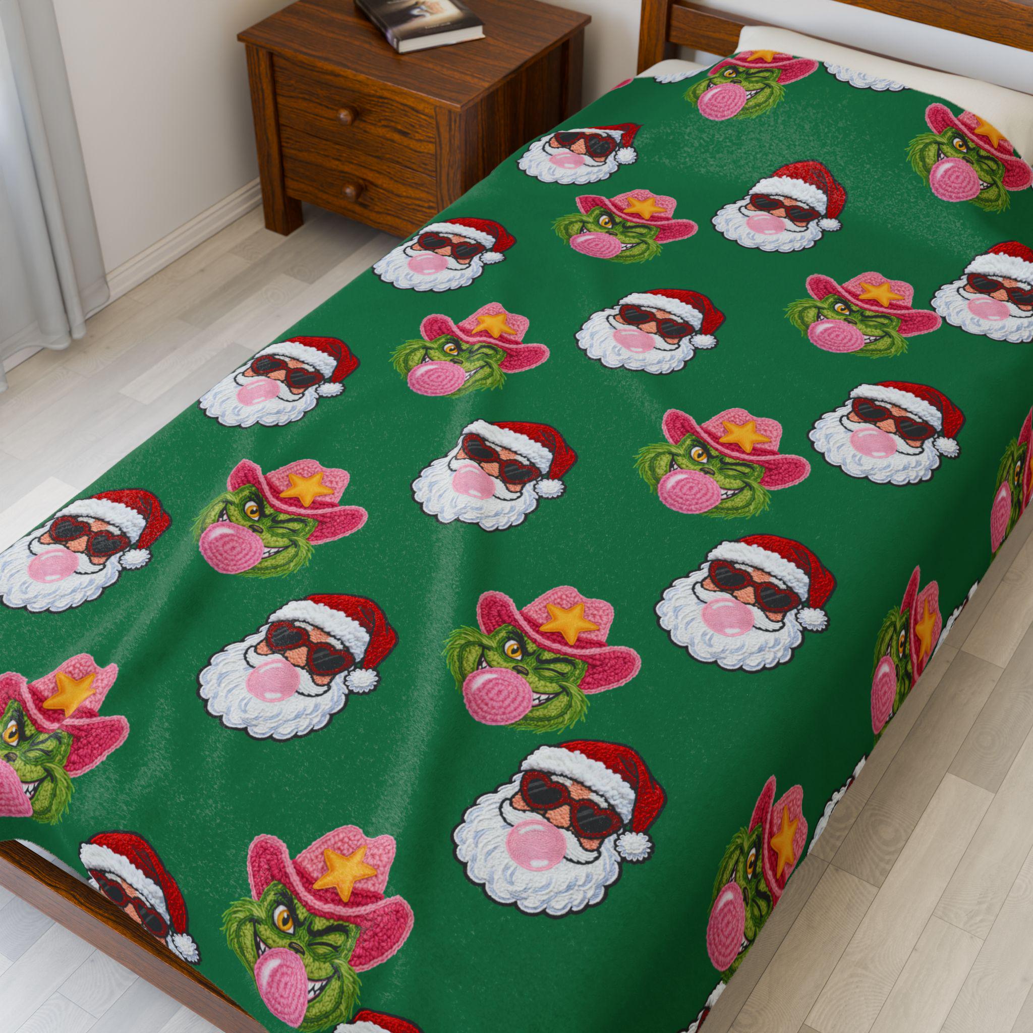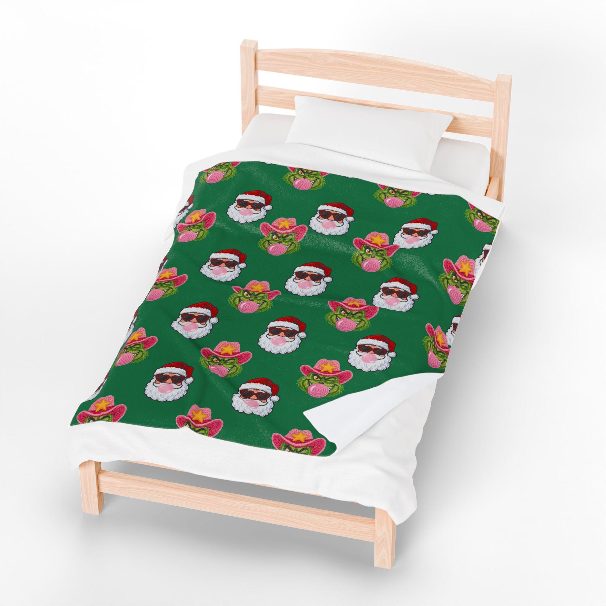 Wrap yourself in playful holiday spirit with this velveteen plush blanket. Soft, medium-weight fabric cradles you while a festive pattern of Santa faces—some sporting shades, others rocking cowboy hats and bubblegum—repeats across a rich green field. It’s the kind of cozy that invites movie nights, slow mornings by twinkling lights, and laughing around a living room full of mismatched socks. The vibrant one-sided print keeps the design bright after many washes while the plush side stays sumptuously soft against skin. Use it on the couch, draped over a favorite chair, or tucked around your shoulders when the night turns crisp—this blanket brings a little irreverent cheer to holiday moments and everyday downtime alike.