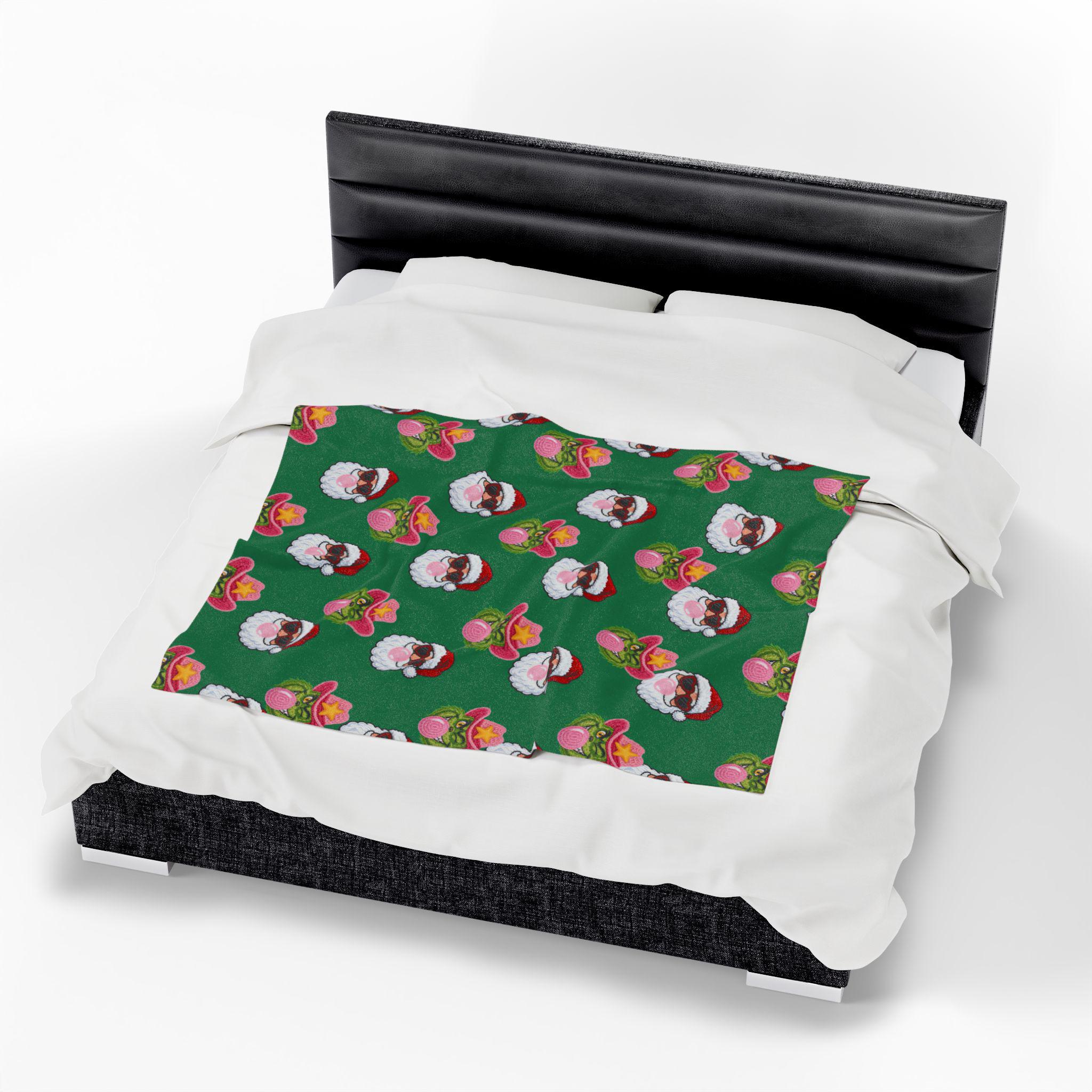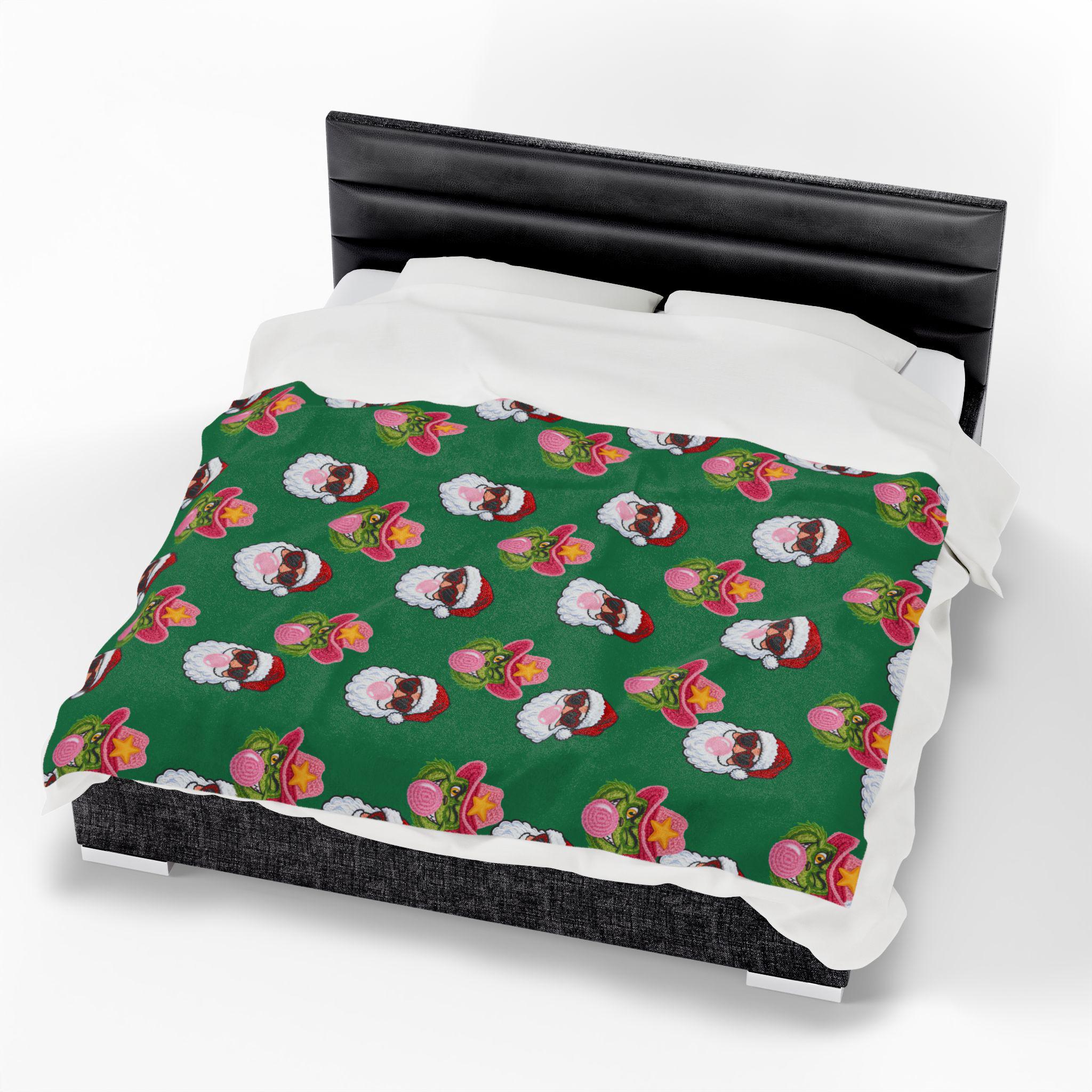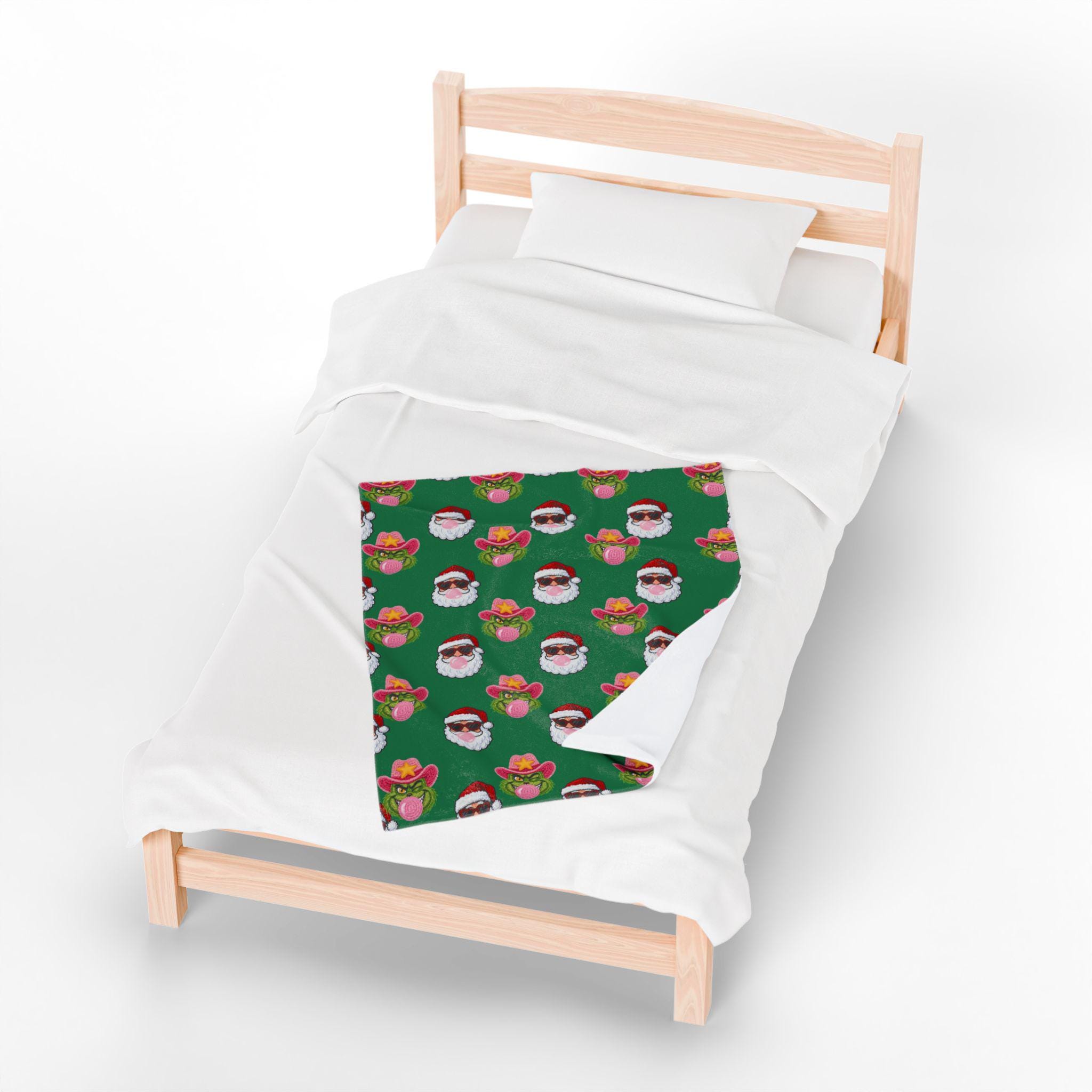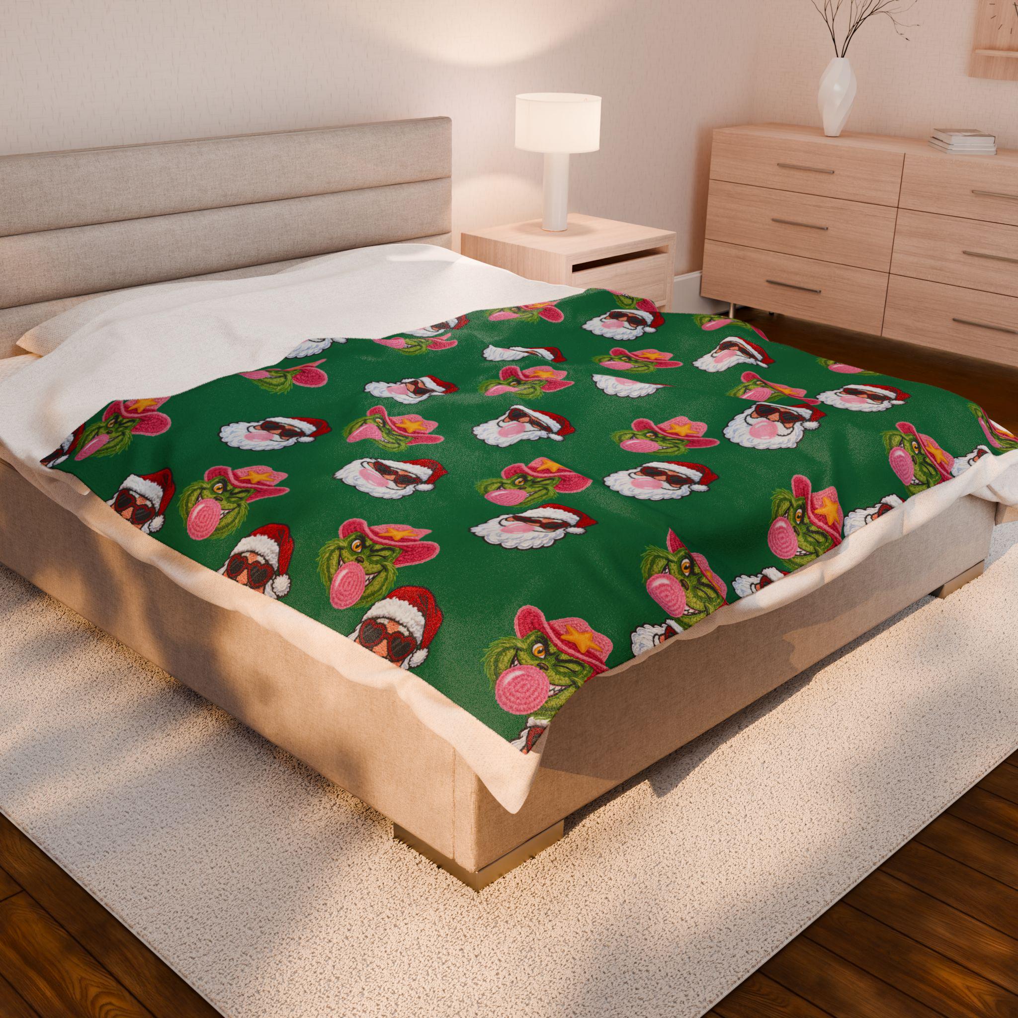 Wrap yourself in playful holiday spirit with this velveteen plush blanket. Soft, medium-weight fabric cradles you while a festive pattern of Santa faces—some sporting shades, others rocking cowboy hats and bubblegum—repeats across a rich green field. It’s the kind of cozy that invites movie nights, slow mornings by twinkling lights, and laughing around a living room full of mismatched socks. The vibrant one-sided print keeps the design bright after many washes while the plush side stays sumptuously soft against skin. Use it on the couch, draped over a favorite chair, or tucked around your shoulders when the night turns crisp—this blanket brings a little irreverent cheer to holiday moments and everyday downtime alike.