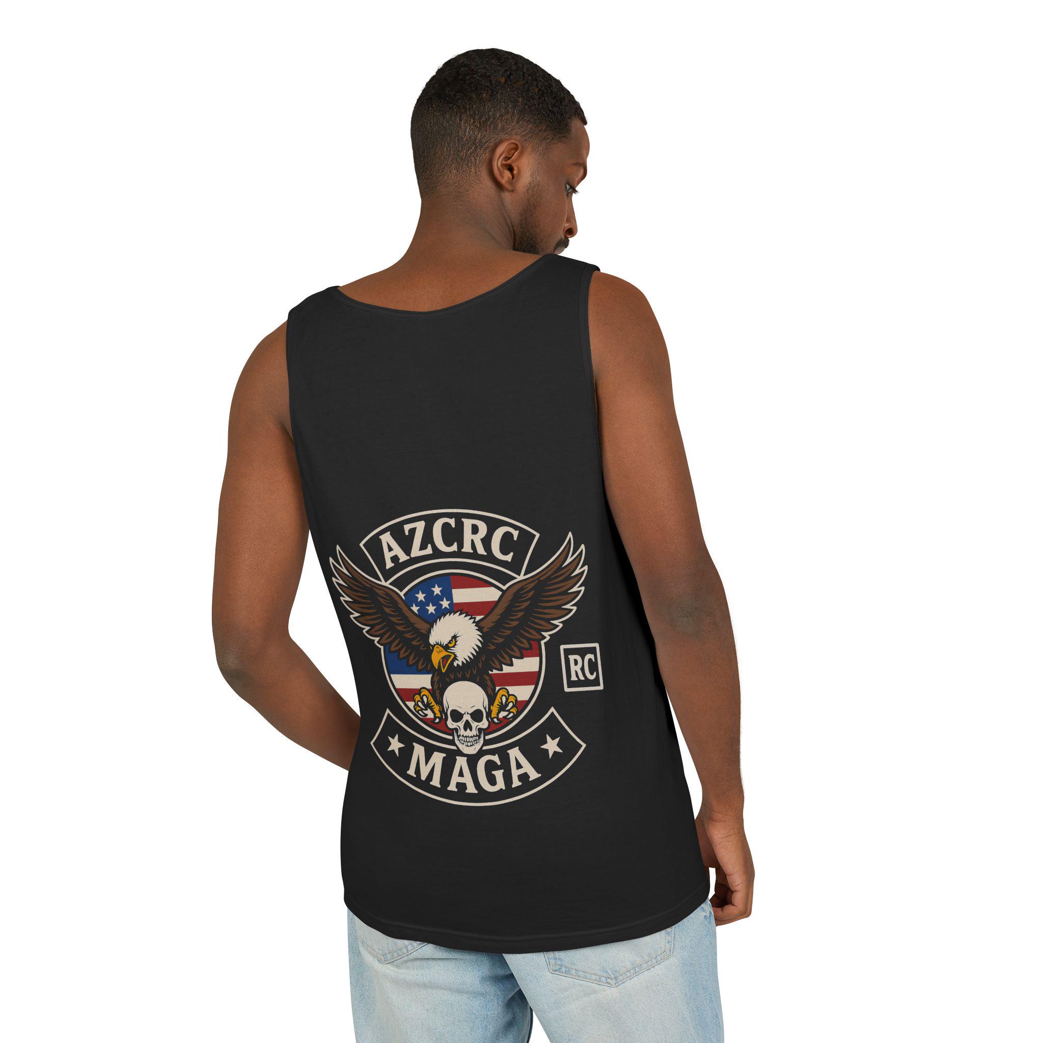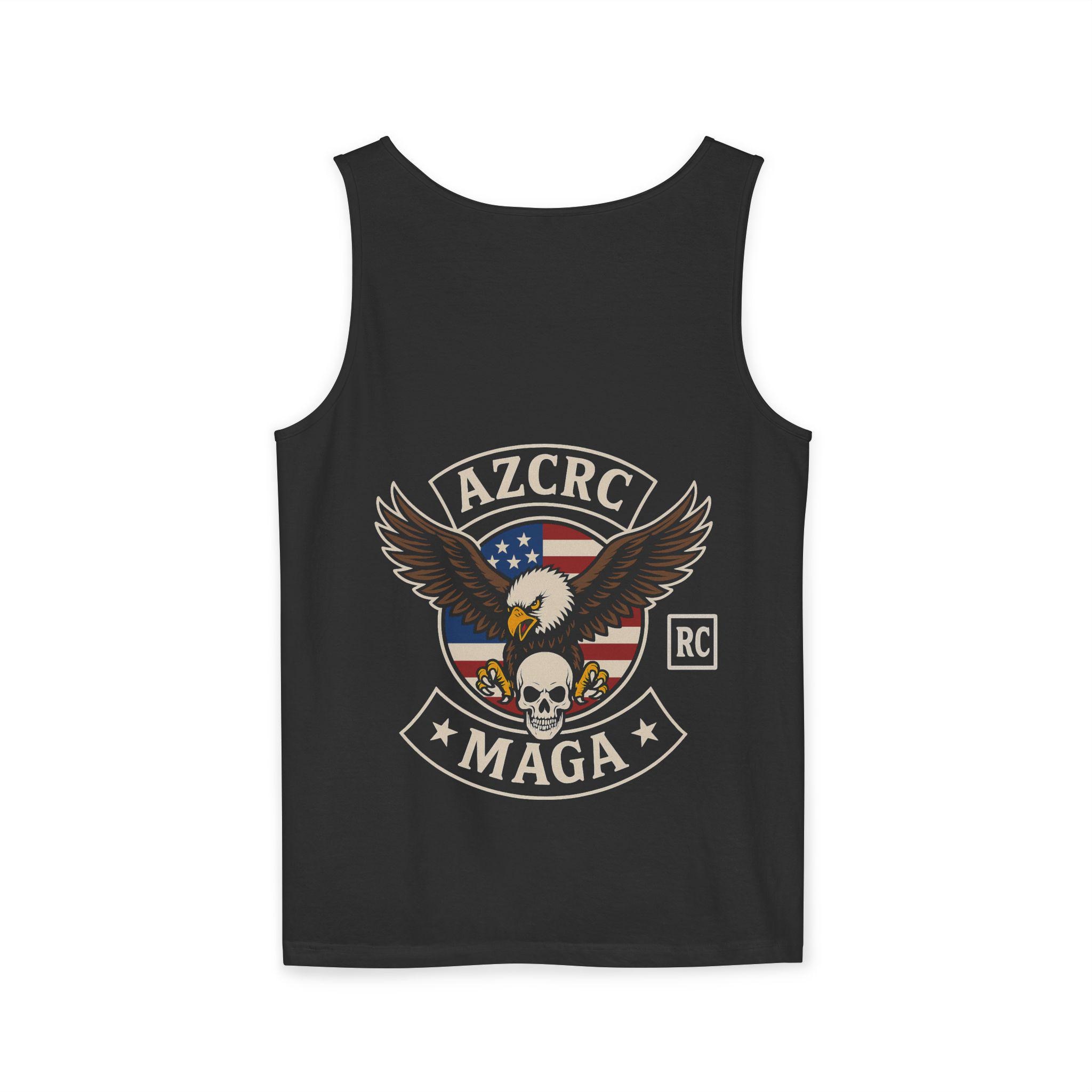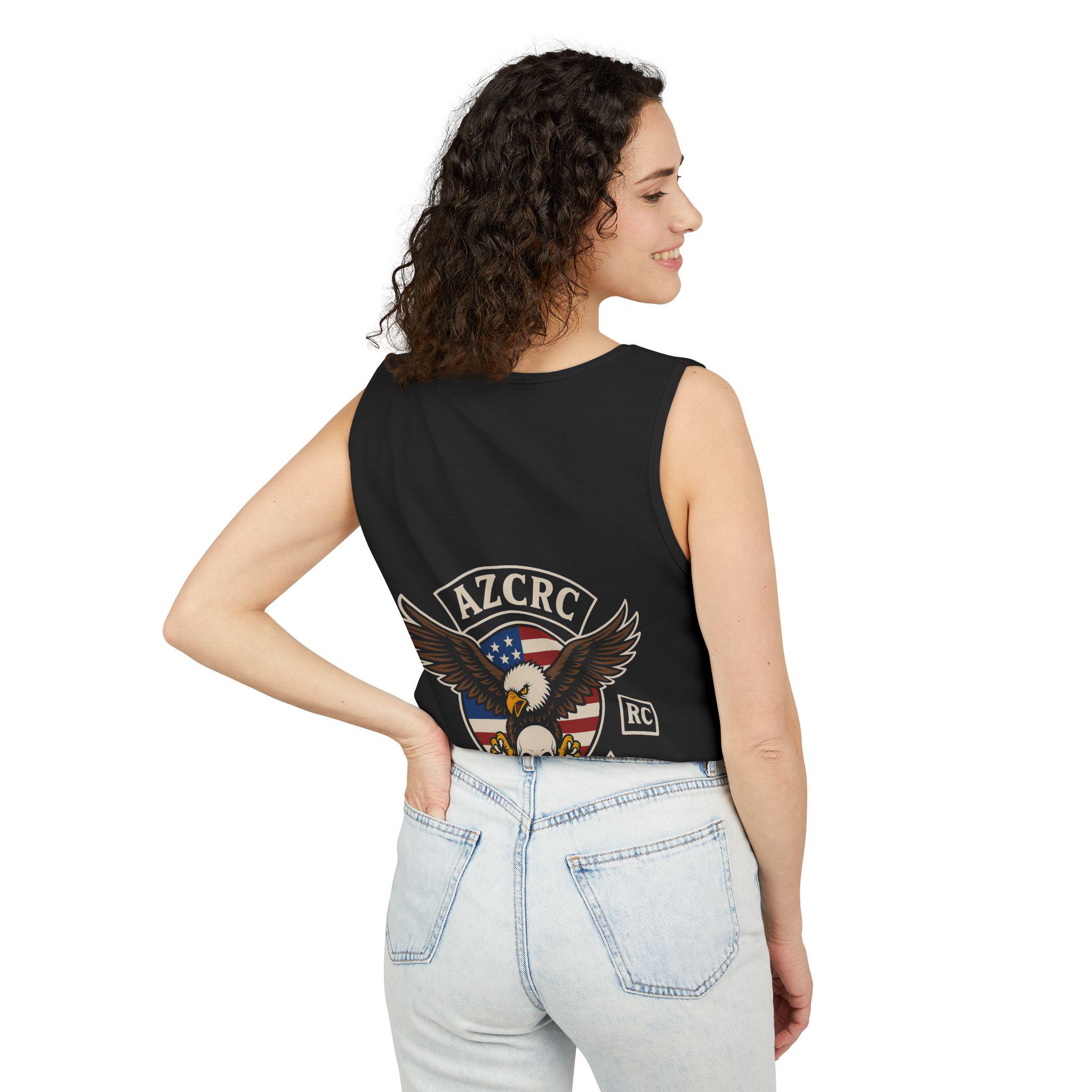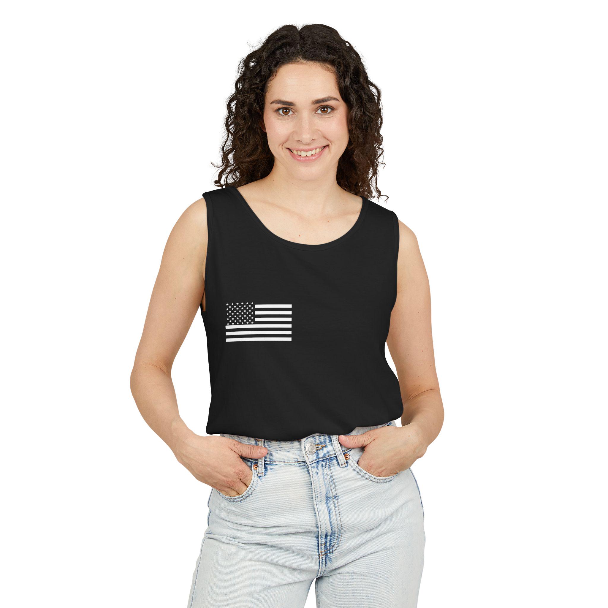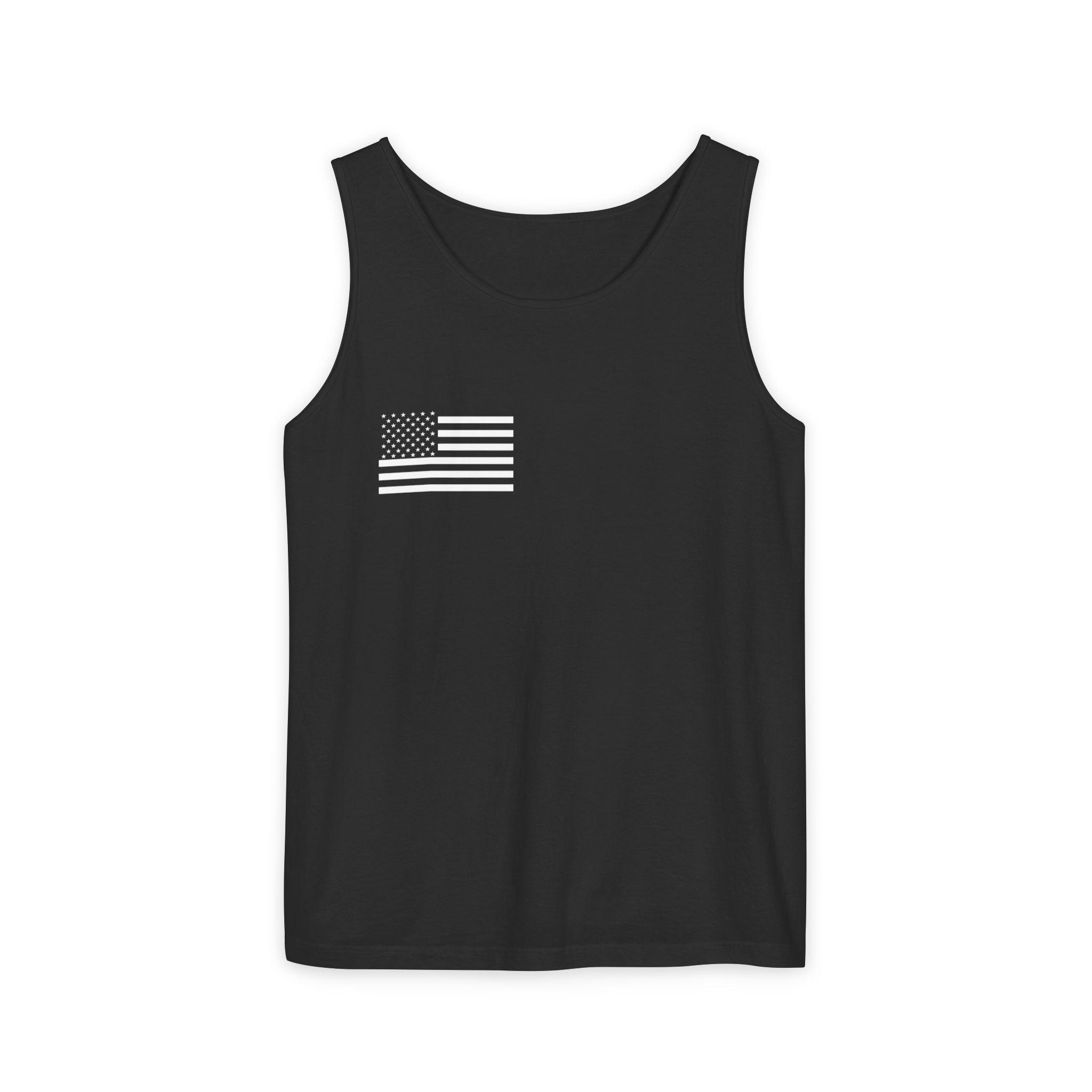 A garment-dyed cotton tank that feels lived-in from the first wear. The relaxed cut and soft, midweight fabric drape easily on warm days or layered under a jacket. The front carries a minimal monochrome flag near the heart; the back presents a bold, vintage-inspired emblem — an eagle, stars and stripes, and classic patch-style lettering — giving the tank a rugged, road-ready attitude. Wear it to ride, rally, or hang out with friends; it moves with you and softens over time, taking on a character that feels personal.