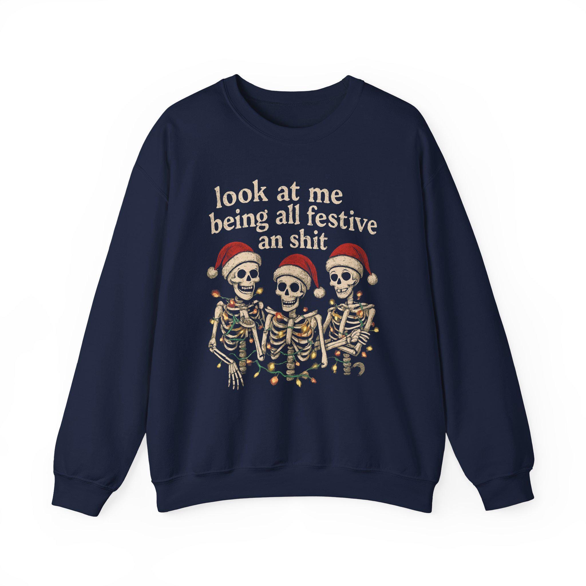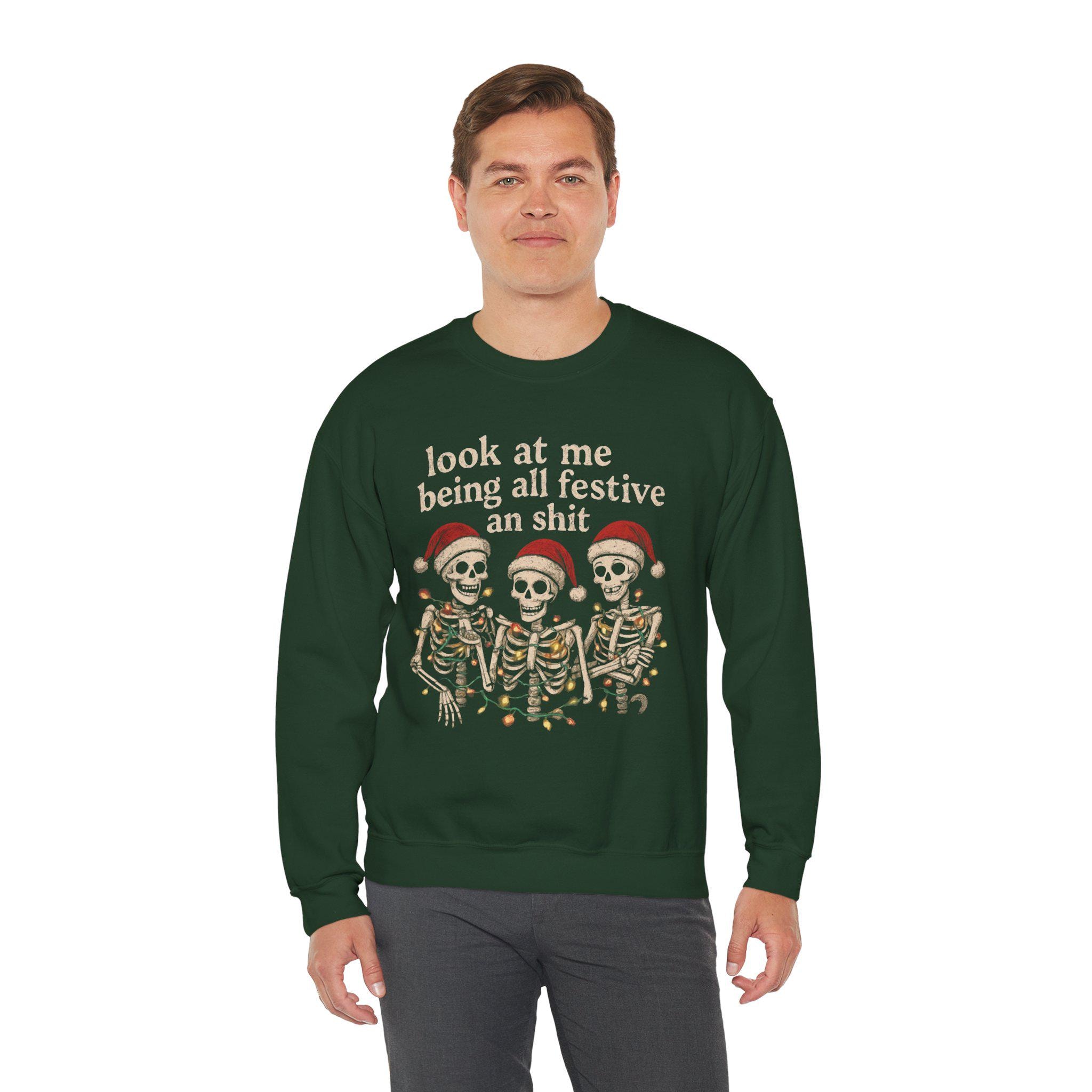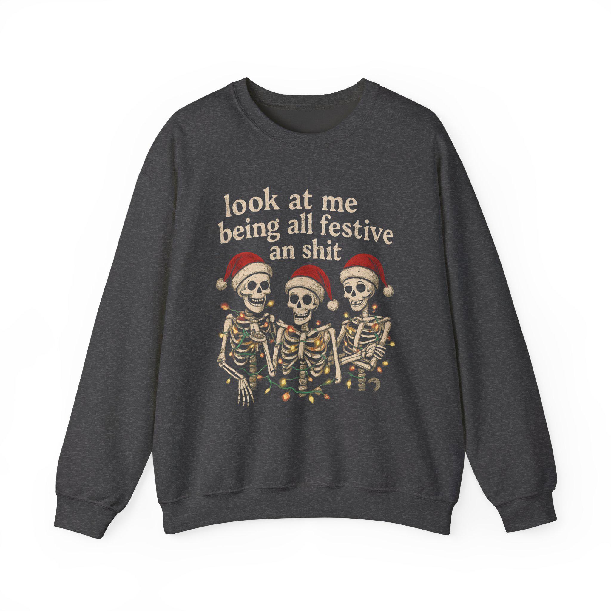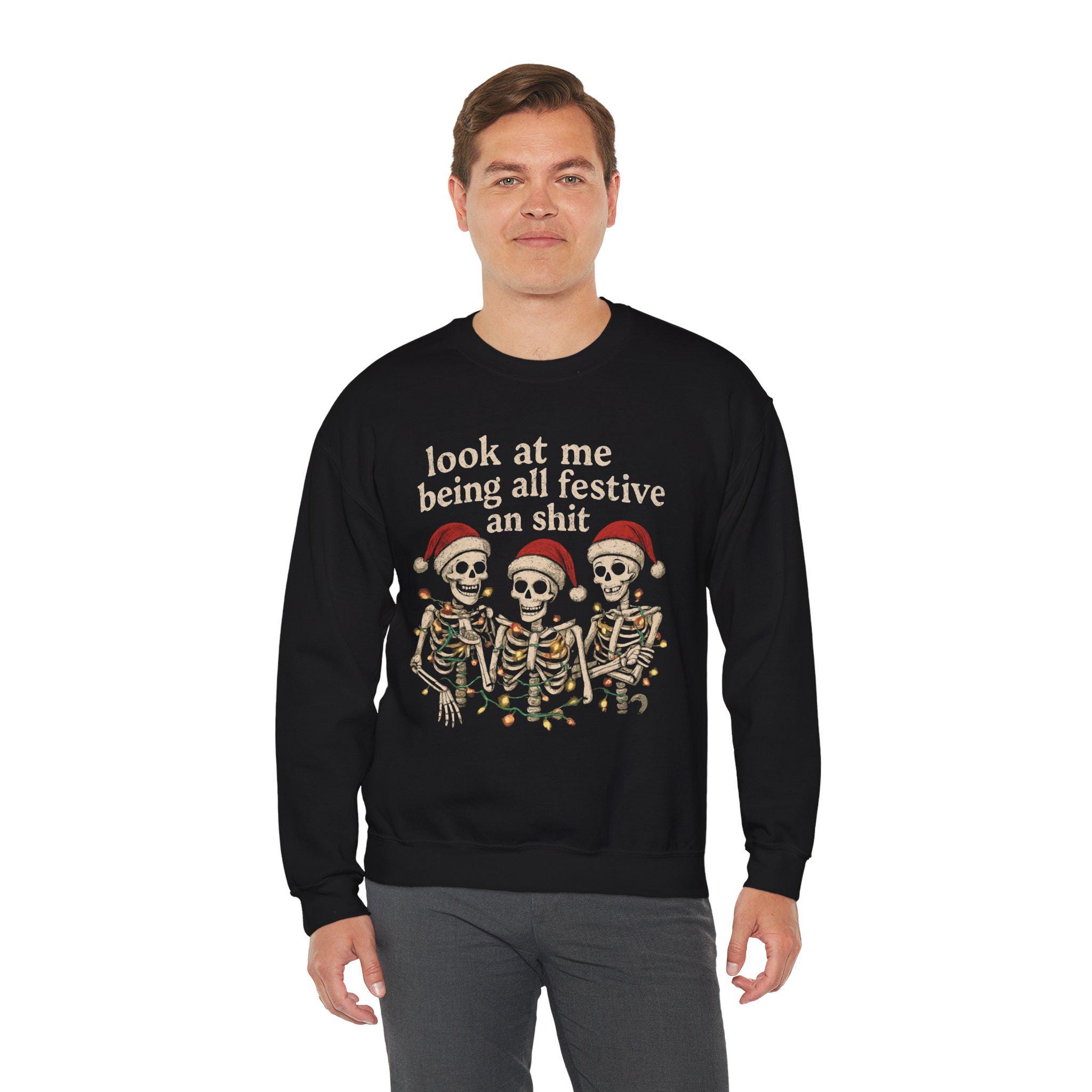 This cozy crewneck sweatshirt blends dark humor with seasonal cheer. Three skeletons in Santa hats are tangled in colorful holiday lights beneath the cheeky line “look at me being all festive an shit,” giving the piece playful irreverence that lands somewhere between gothic and festive. The medium-heavy cotton-poly fabric drapes comfortably and holds the embroidered or printed artwork clearly. Wear it to low-key holiday hangouts, late-night drink runs, or anytime you want to wink at tradition without taking it too seriously.