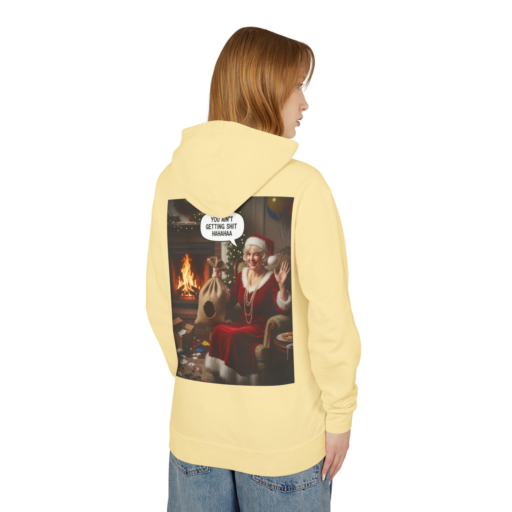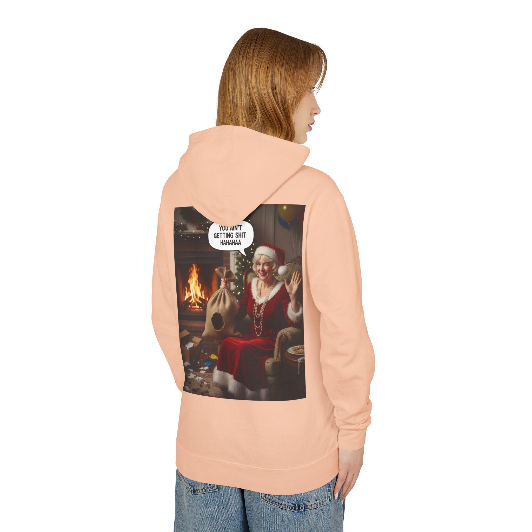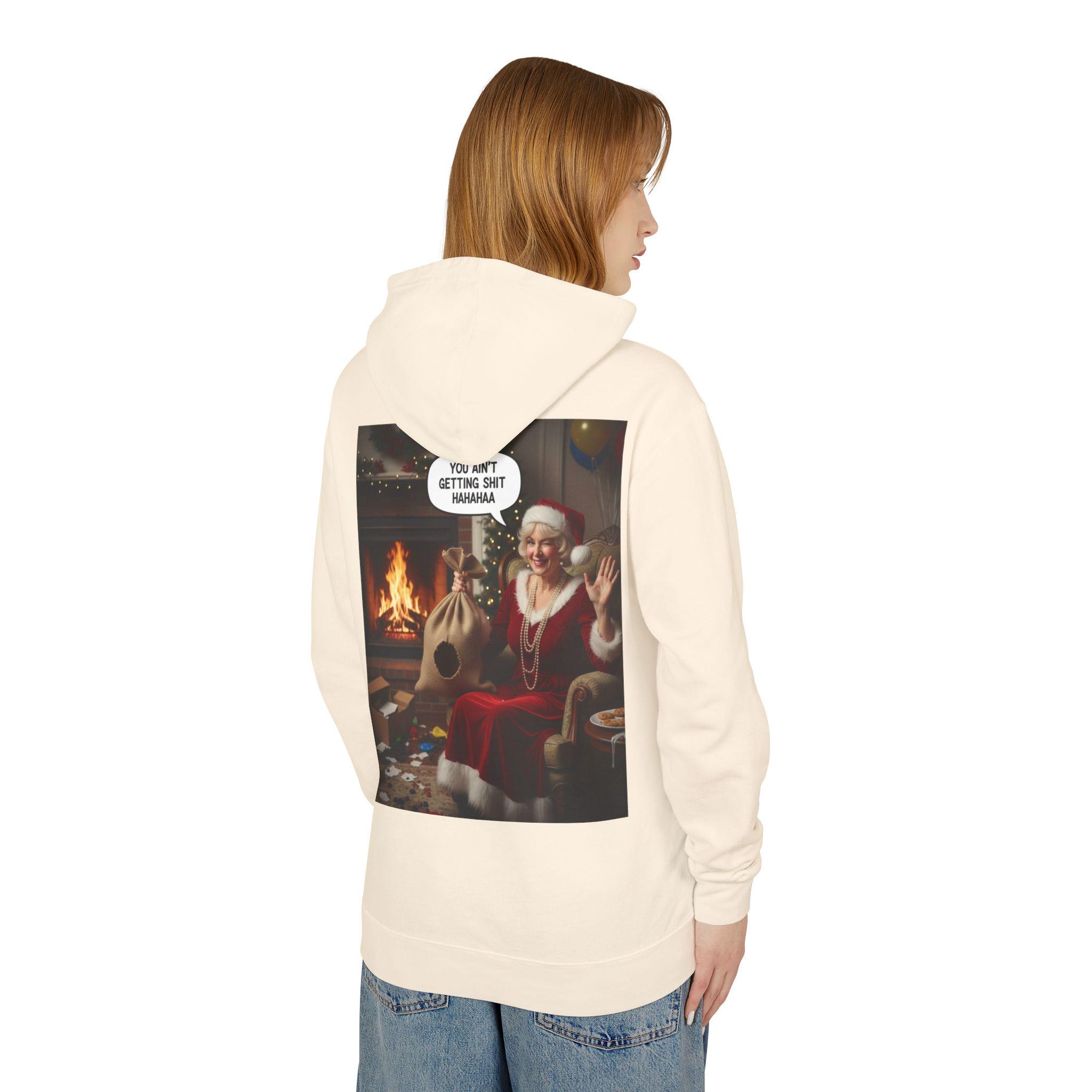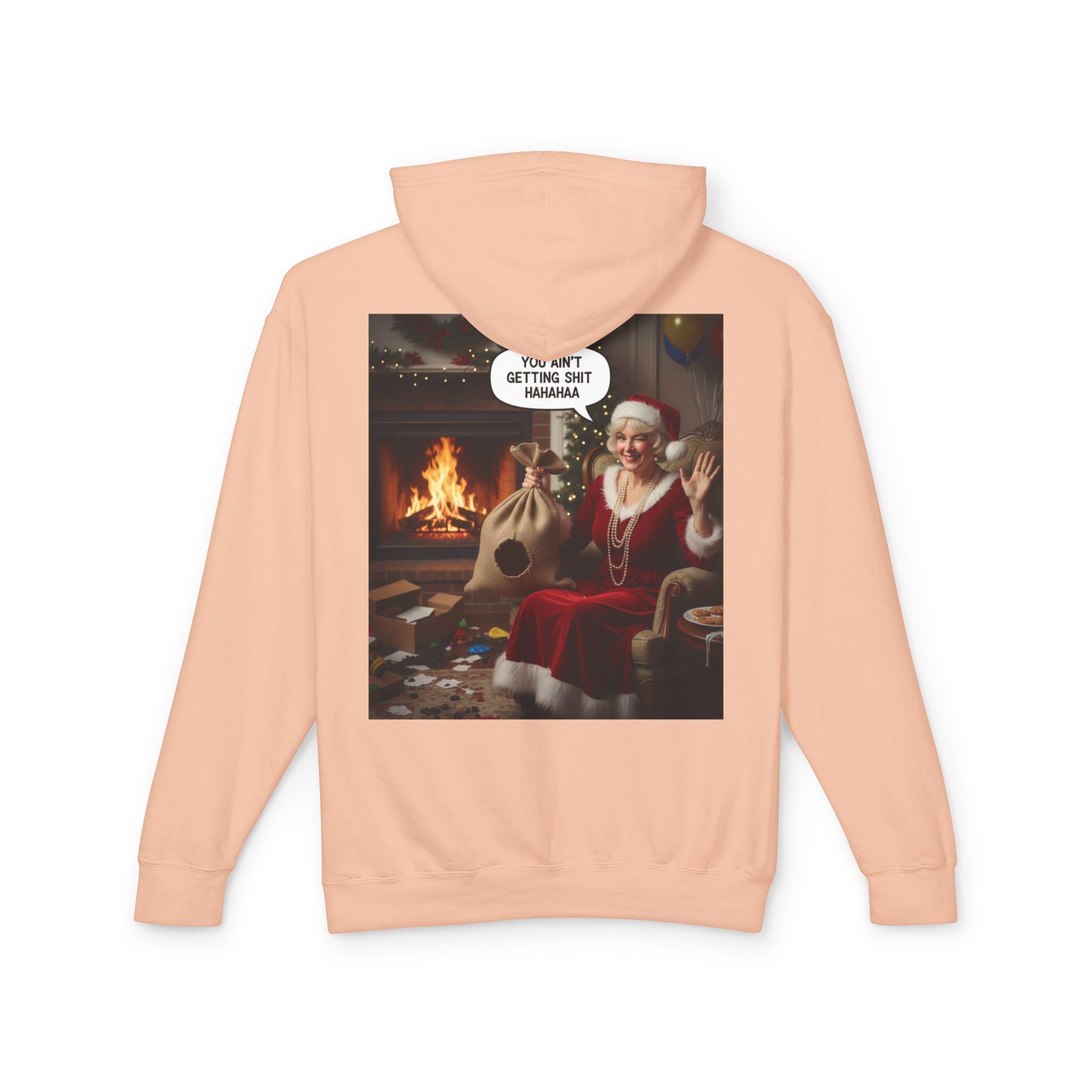 This lightweight hooded sweatshirt brings cozy vintage holiday vibes to everyday wear. The soft, breathable cotton and relaxed cut make it feel like slipping into a warm living room on a quiet winter evening. The back features a bold, nostalgic holiday image that reads like a candid moment by the fireplace — a little cheeky, warmly humorous, and unmistakably festive. Wear it layered over tees or pajamas while wrapping gifts, watching seasonal films, or hosting a casual get-together with friends who appreciate tongue-in-cheek holiday charm.