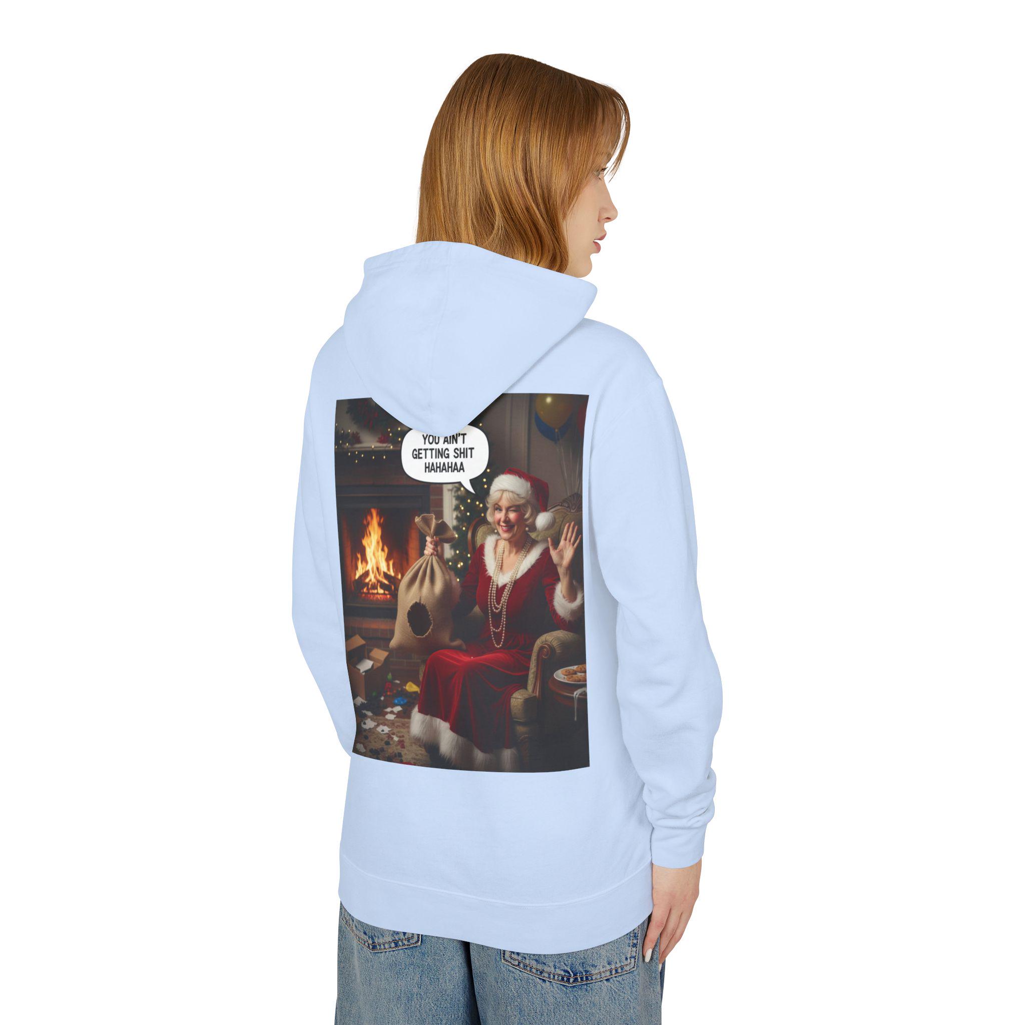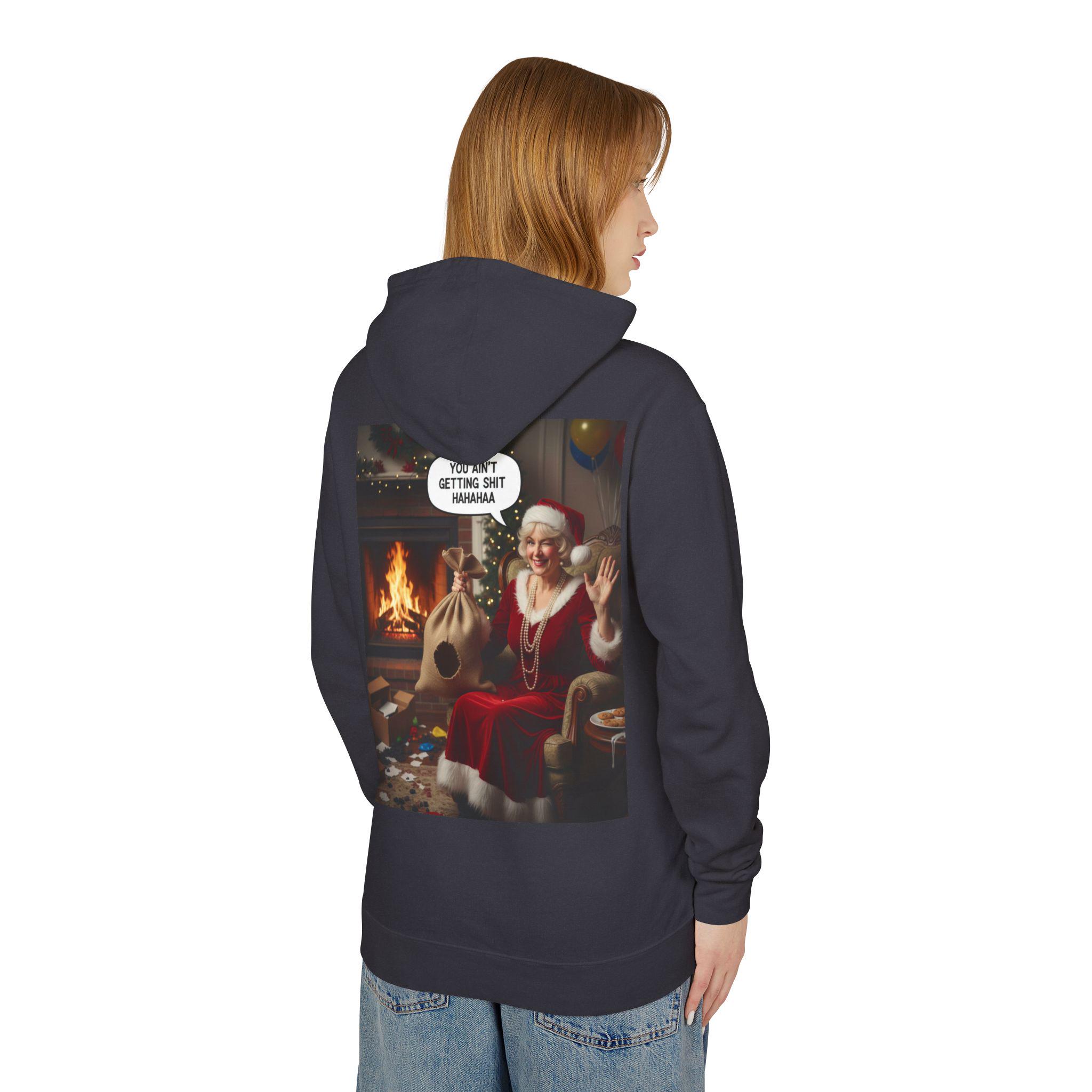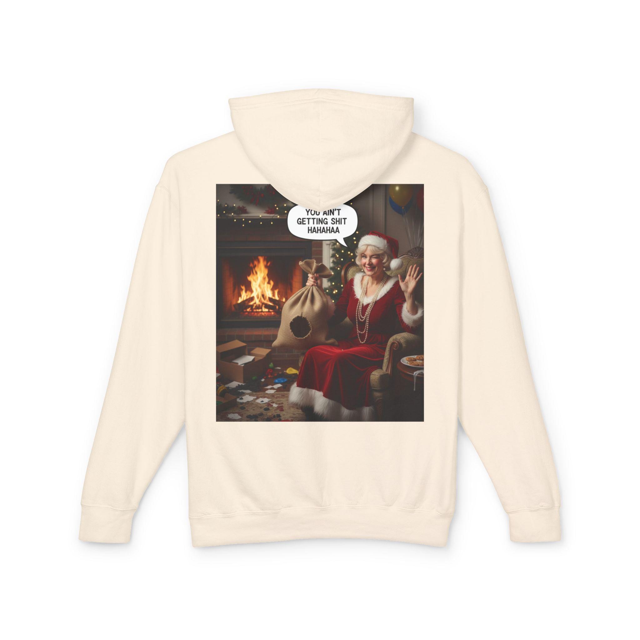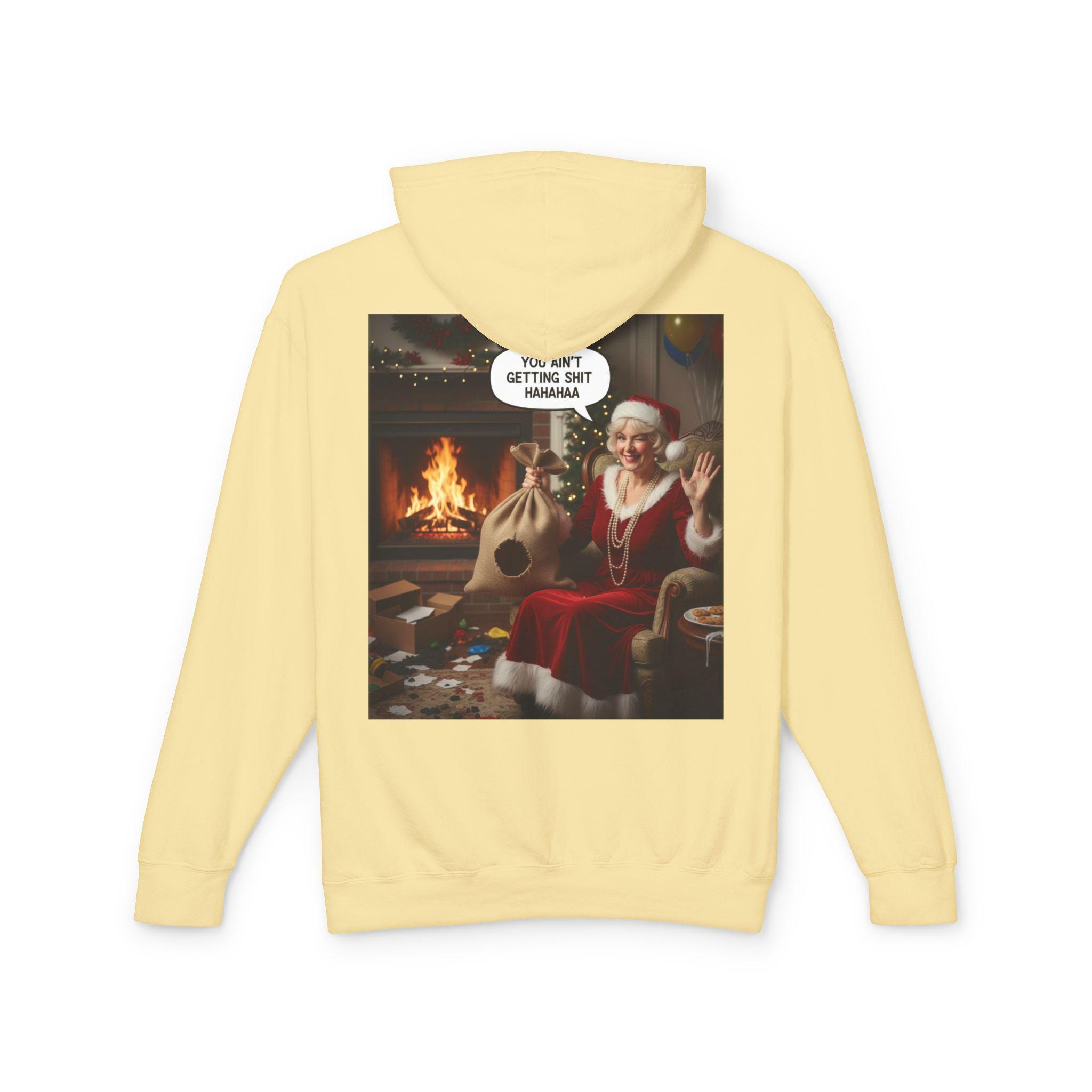 This lightweight hooded sweatshirt brings cozy vintage holiday vibes to everyday wear. The soft, breathable cotton and relaxed cut make it feel like slipping into a warm living room on a quiet winter evening. The back features a bold, nostalgic holiday image that reads like a candid moment by the fireplace — a little cheeky, warmly humorous, and unmistakably festive. Wear it layered over tees or pajamas while wrapping gifts, watching seasonal films, or hosting a casual get-together with friends who appreciate tongue-in-cheek holiday charm.