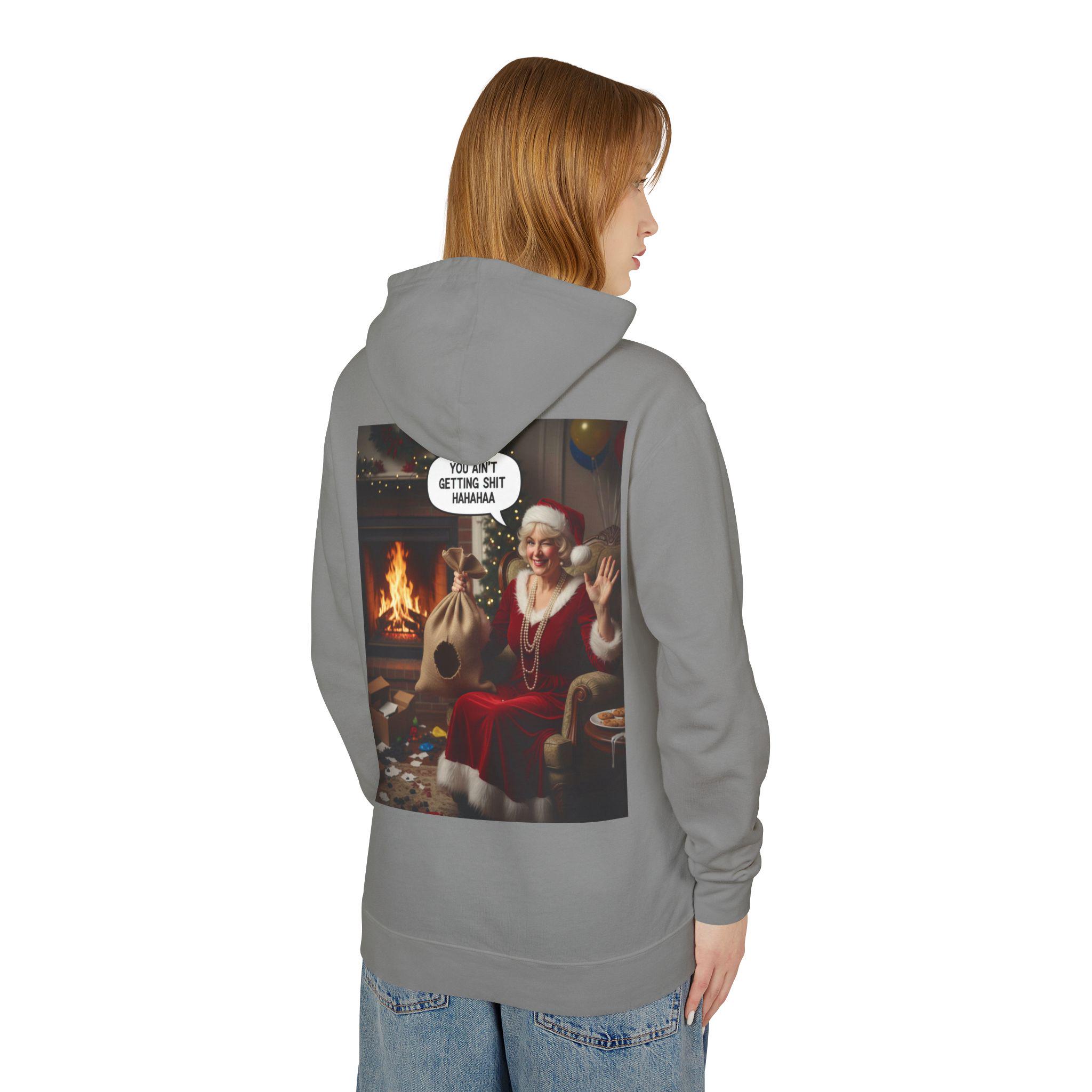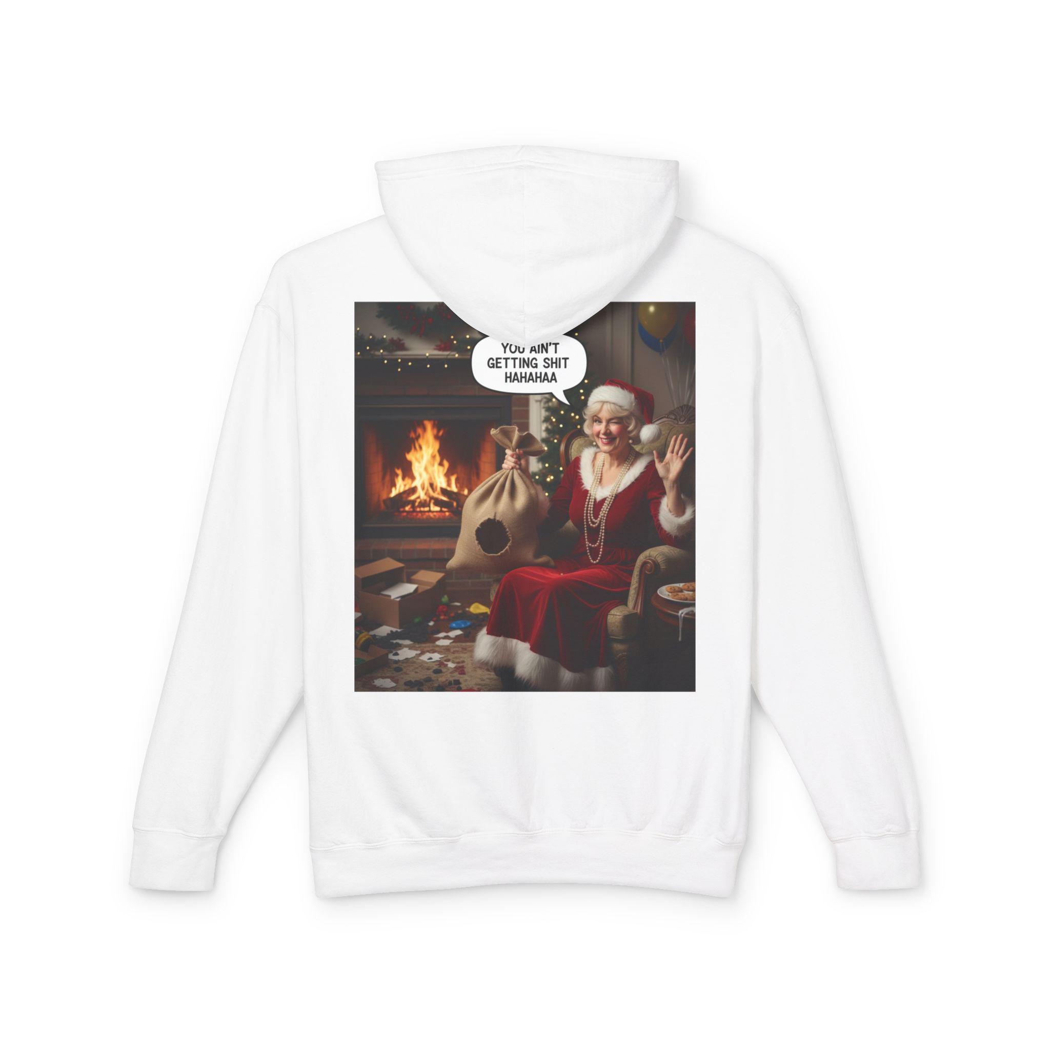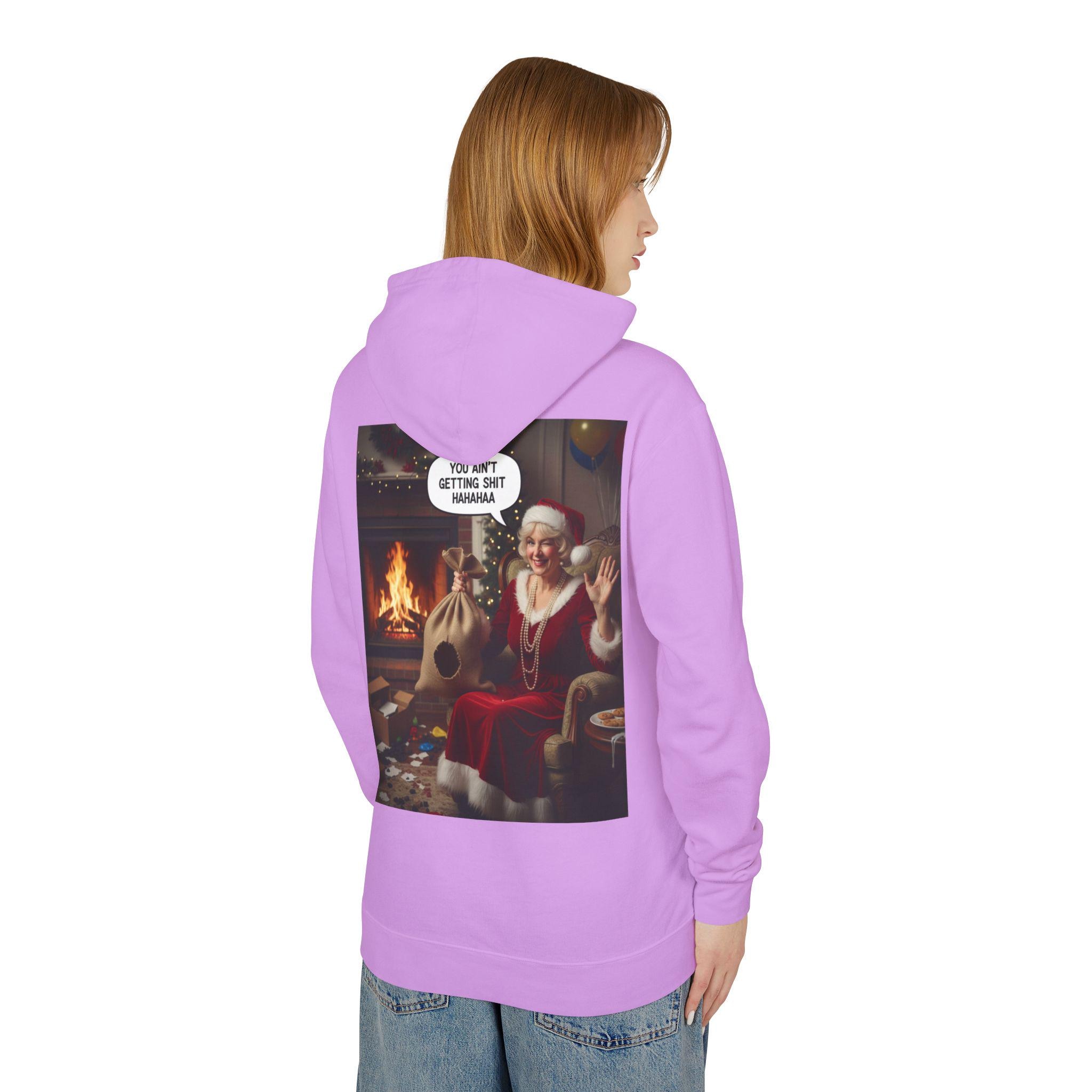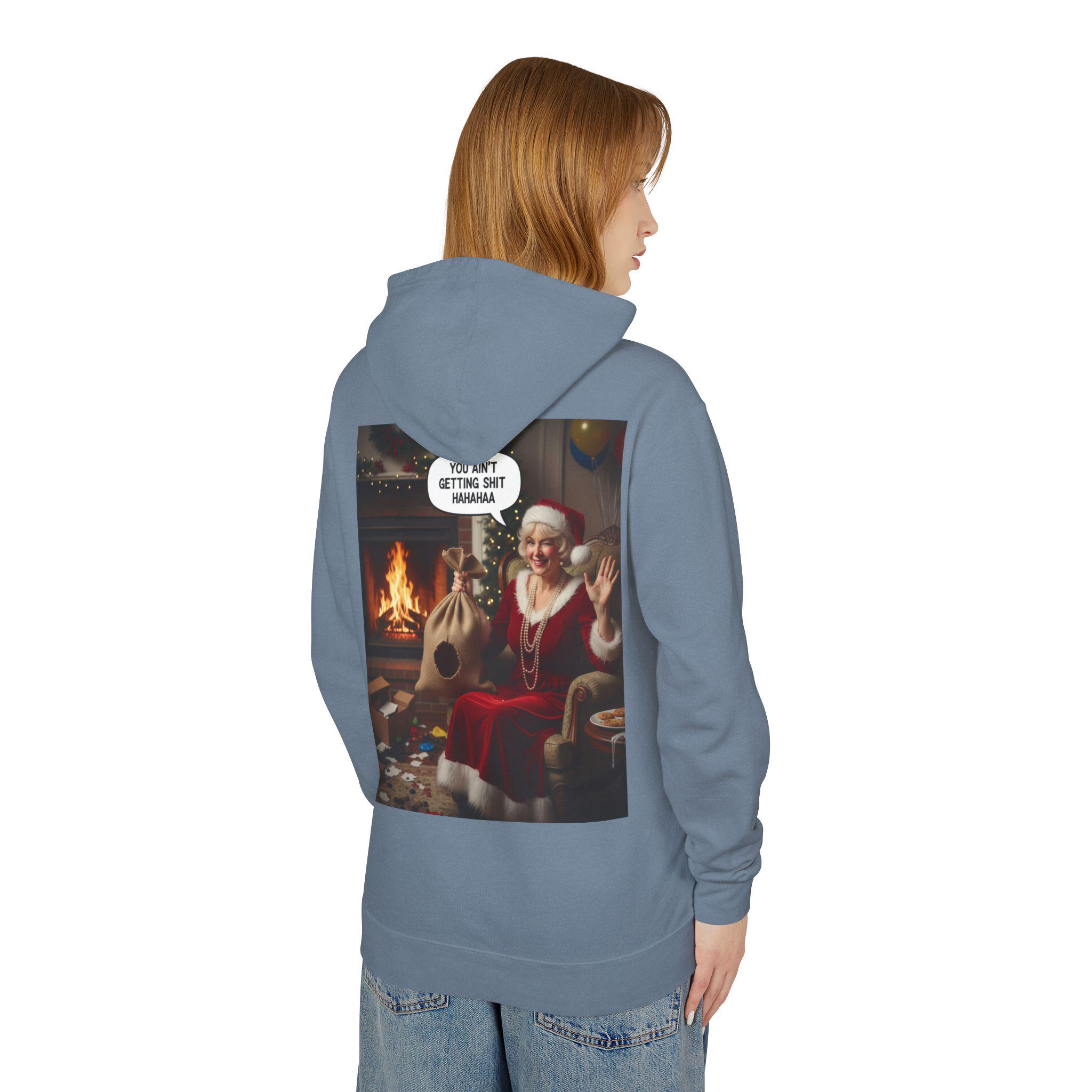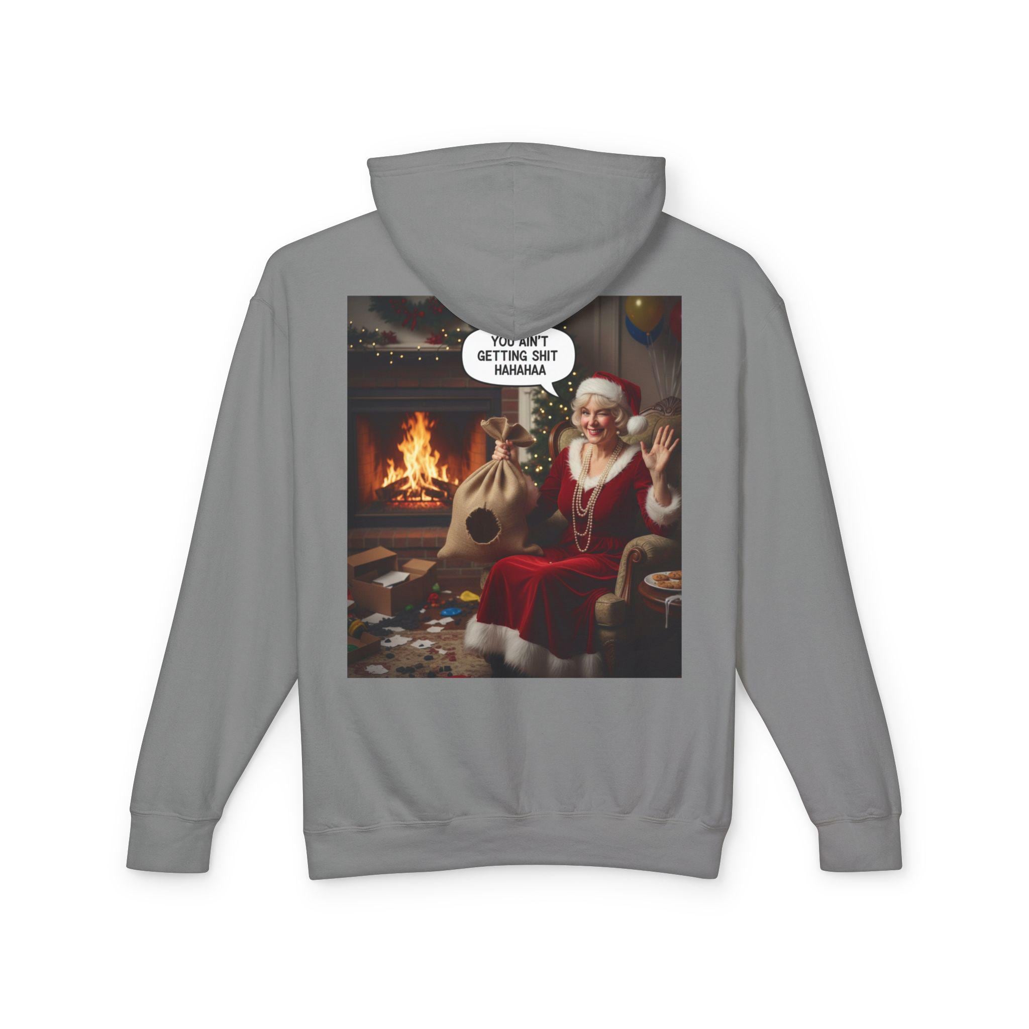 This lightweight hooded sweatshirt brings cozy vintage holiday vibes to everyday wear. The soft, breathable cotton and relaxed cut make it feel like slipping into a warm living room on a quiet winter evening. The back features a bold, nostalgic holiday image that reads like a candid moment by the fireplace — a little cheeky, warmly humorous, and unmistakably festive. Wear it layered over tees or pajamas while wrapping gifts, watching seasonal films, or hosting a casual get-together with friends who appreciate tongue-in-cheek holiday charm.