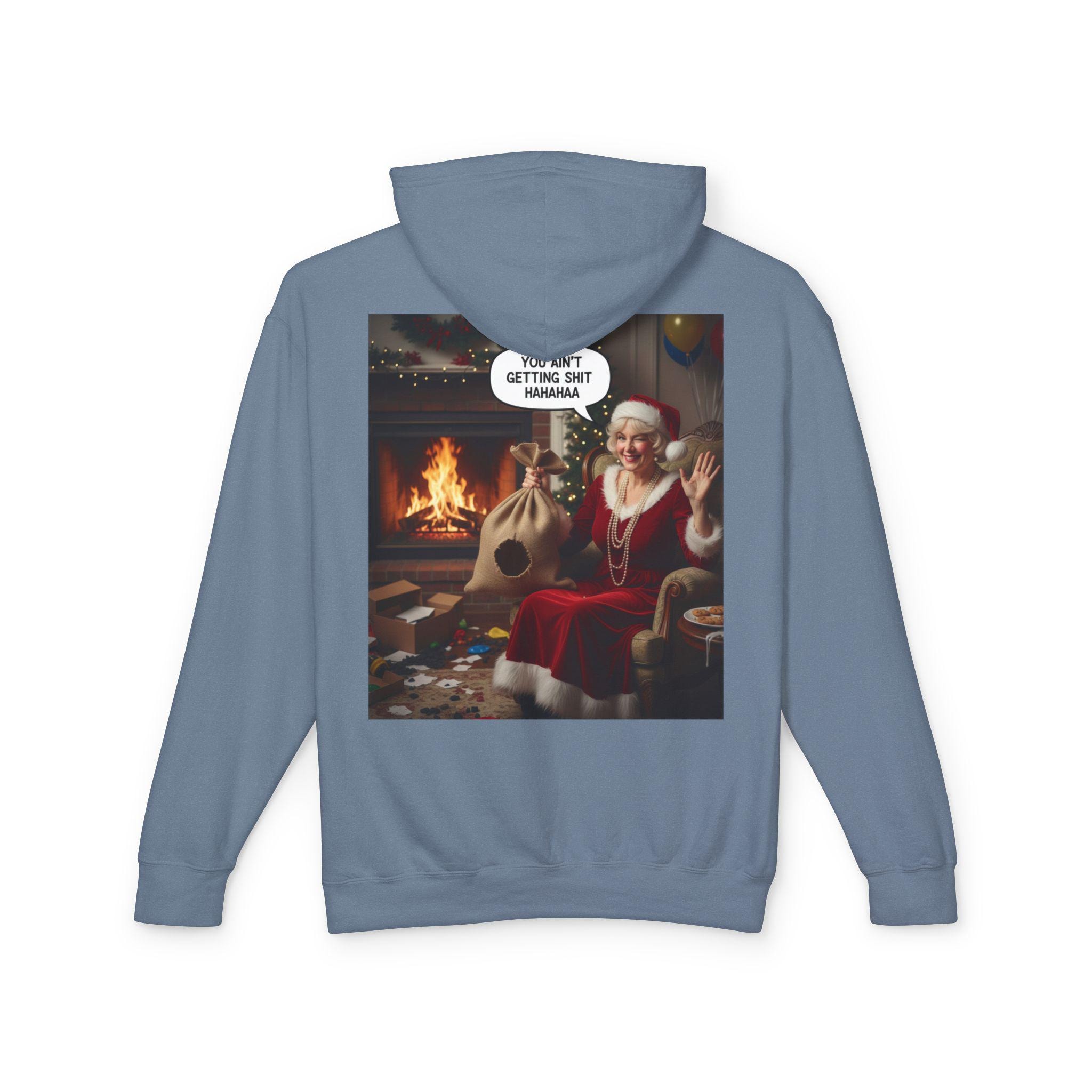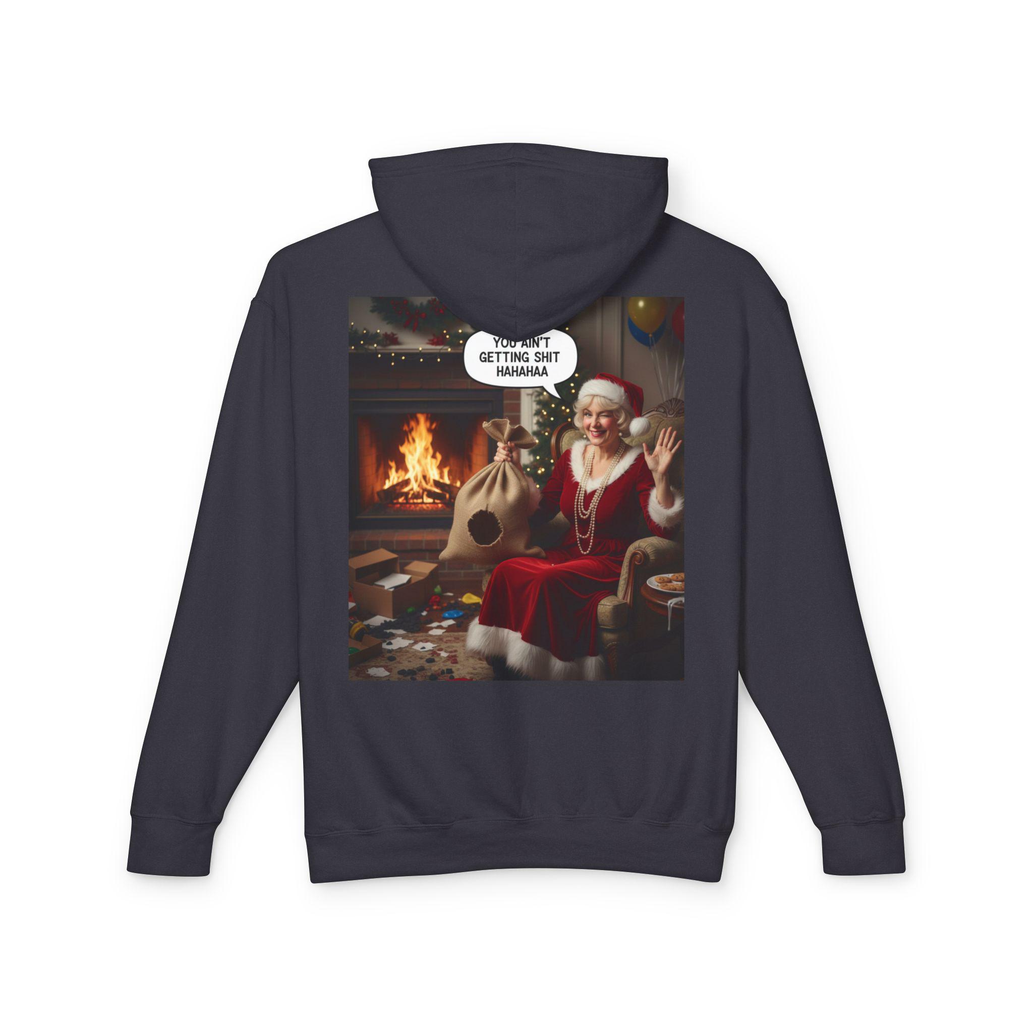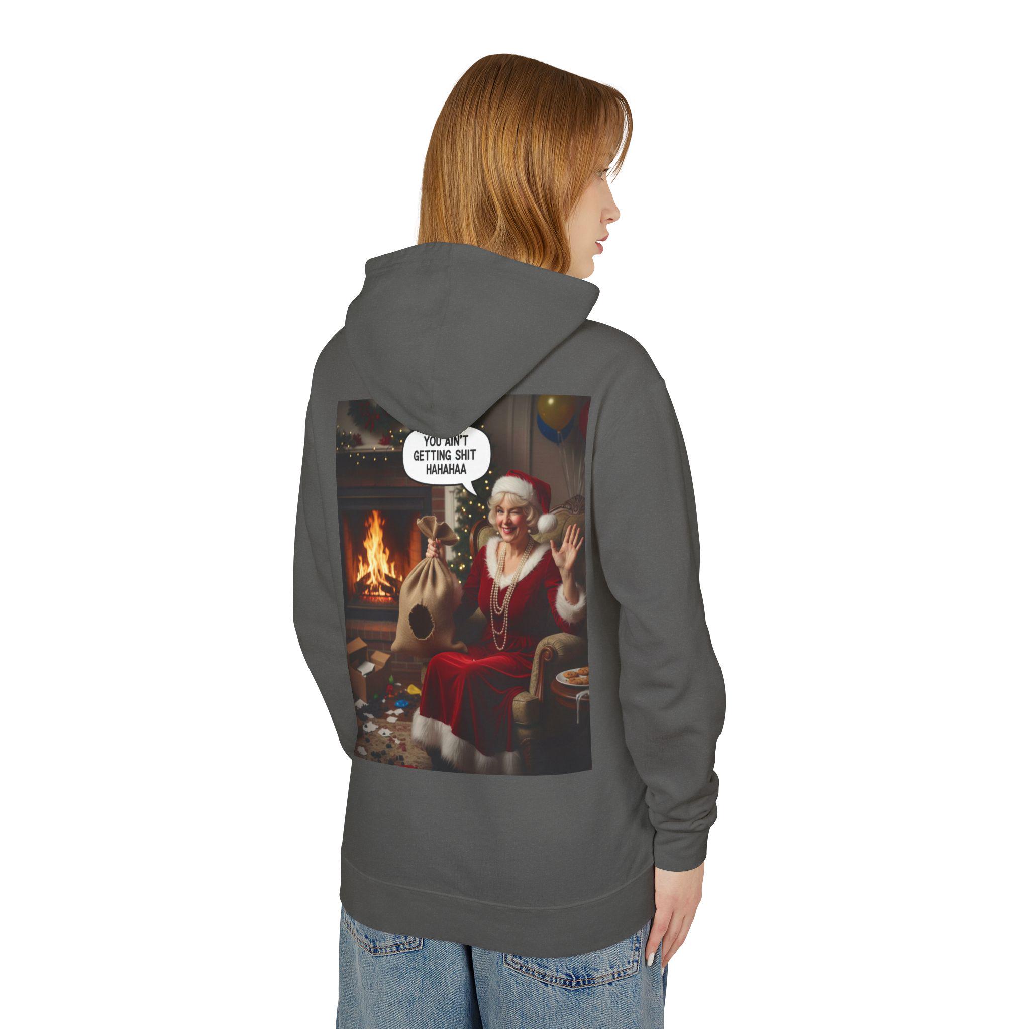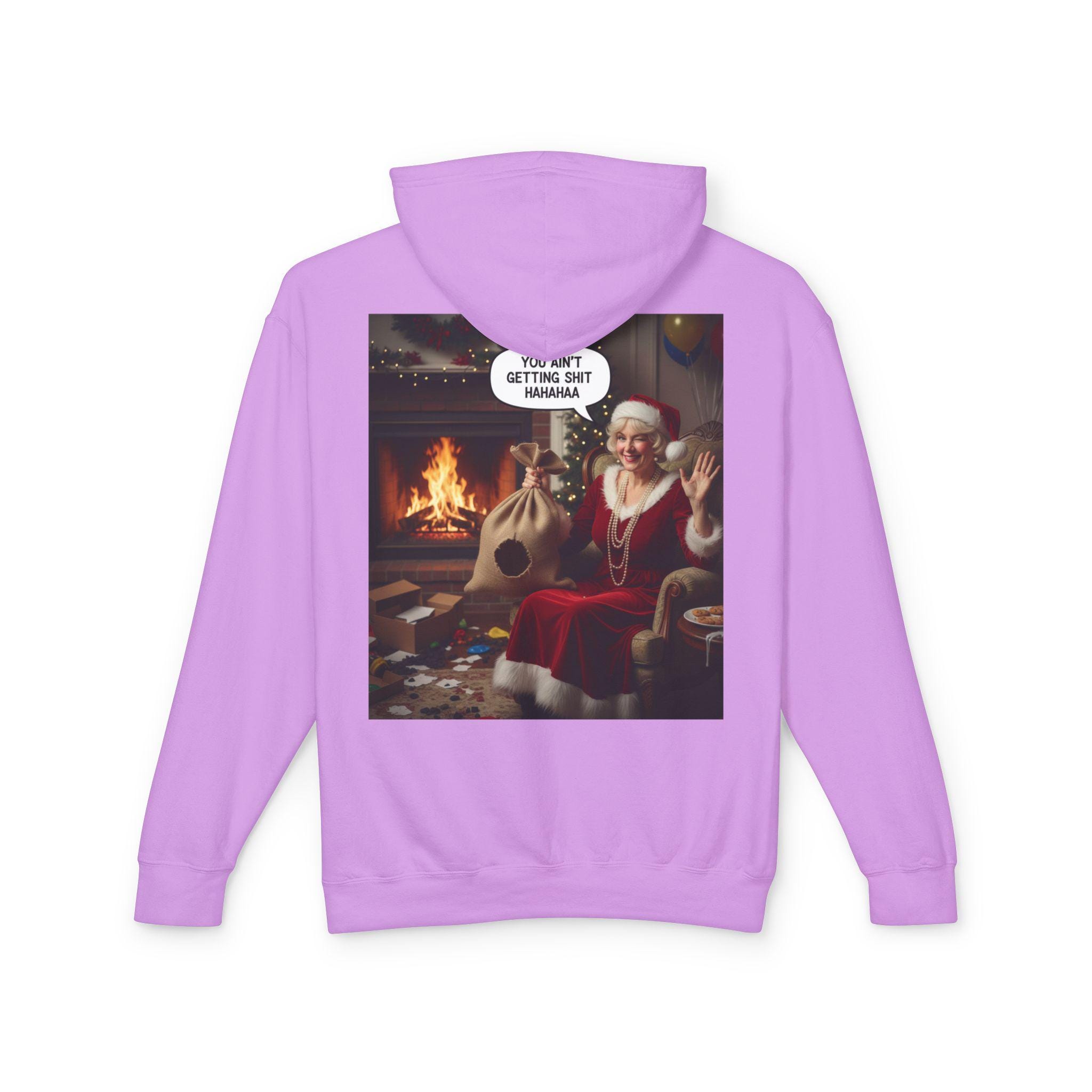 This lightweight hooded sweatshirt brings cozy vintage holiday vibes to everyday wear. The soft, breathable cotton and relaxed cut make it feel like slipping into a warm living room on a quiet winter evening. The back features a bold, nostalgic holiday image that reads like a candid moment by the fireplace — a little cheeky, warmly humorous, and unmistakably festive. Wear it layered over tees or pajamas while wrapping gifts, watching seasonal films, or hosting a casual get-together with friends who appreciate tongue-in-cheek holiday charm.
