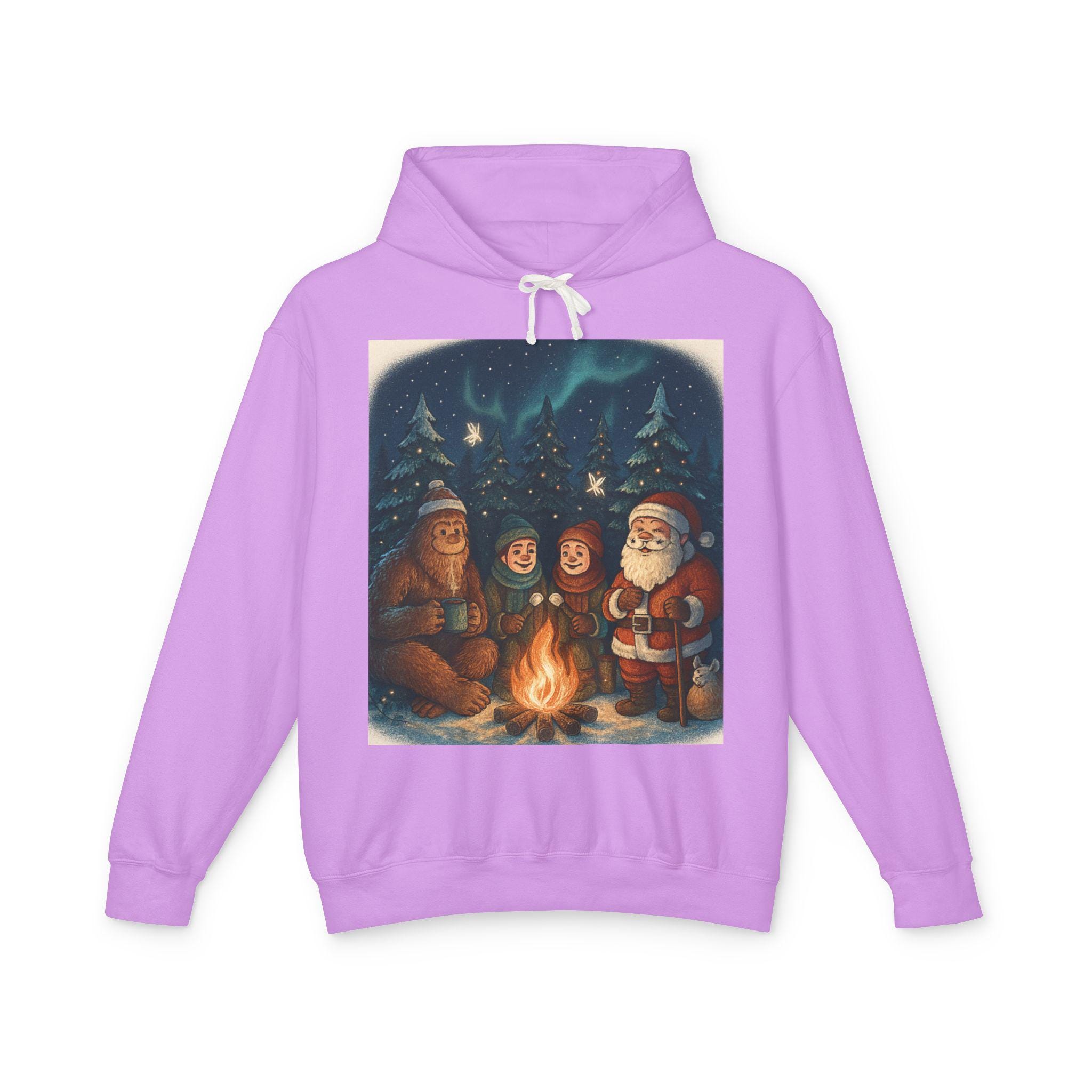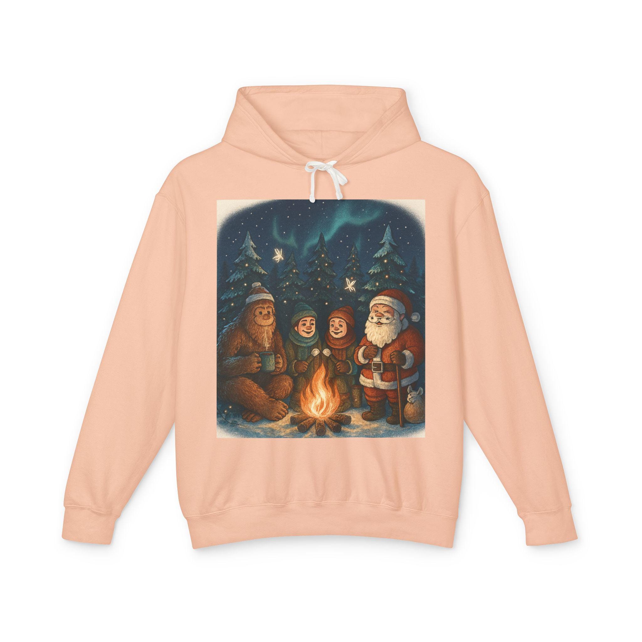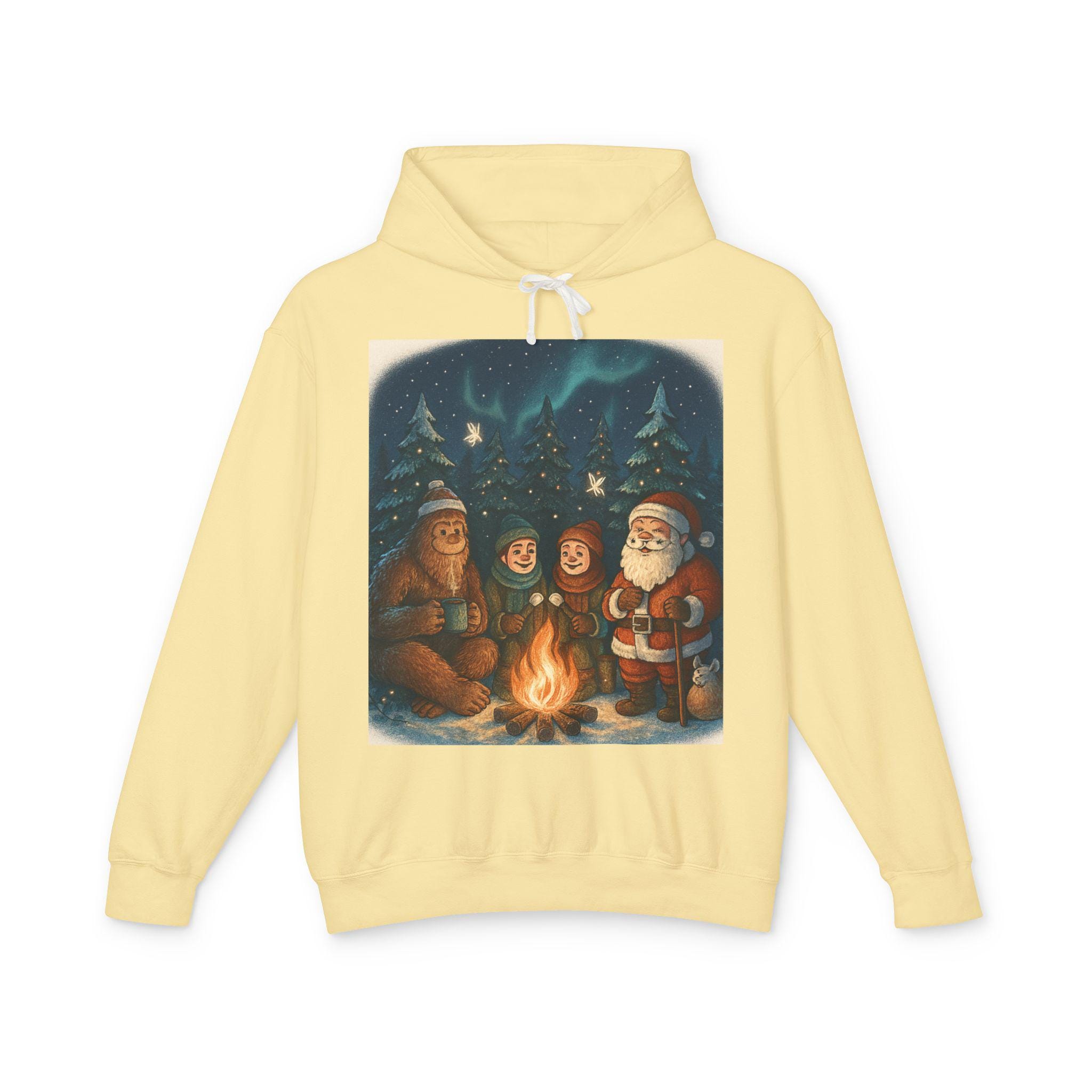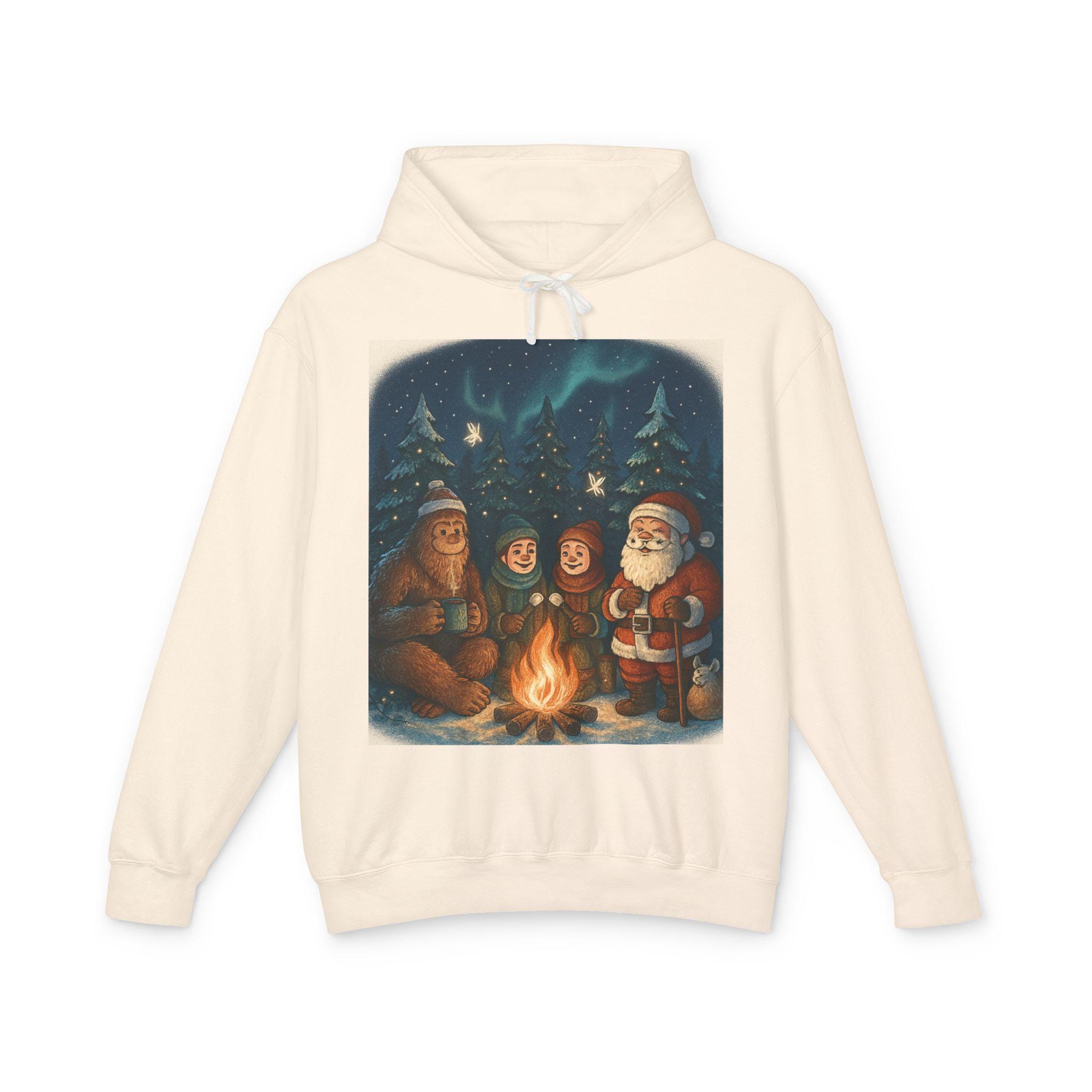 Lightweight warmth with a story stitched into the fabric. This cotton hoodie carries a cozy forest scene: a small group gathered around a crackling campfire beneath tall pines and a soft aurora. The illustration feels like a late-night winter tradition—murmured stories, hot drinks, and the hush of snow—translated into wearable comfort. It slips on easily for slow evenings by the fire, winter walks between cabins, or layering for holiday drives. The relaxed cut gives room to move without losing that tucked-in, contented feeling. Subtle natural tones and a jersey-lined hood make it feel lived-in from the first wear, like an autumn evening you can carry with you.