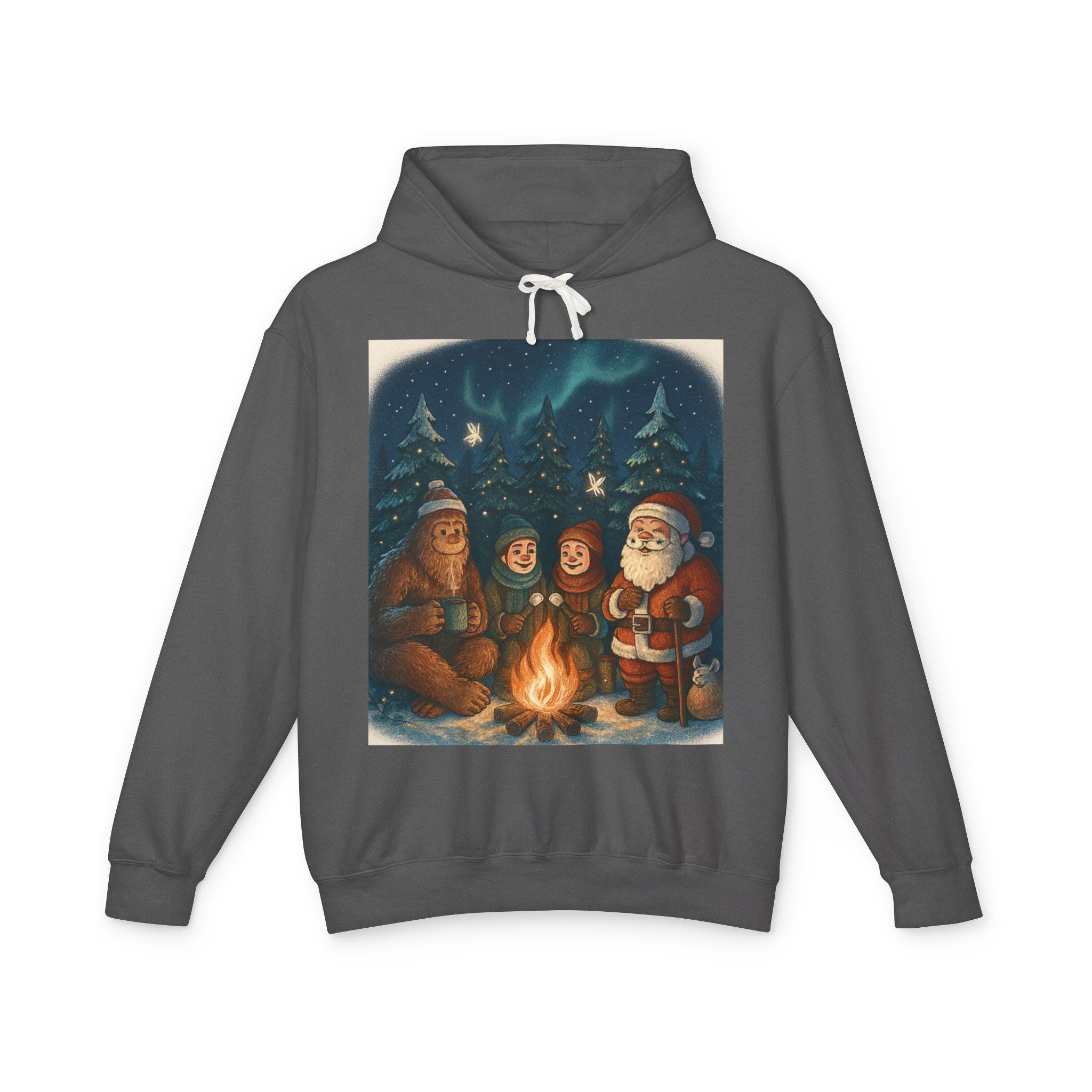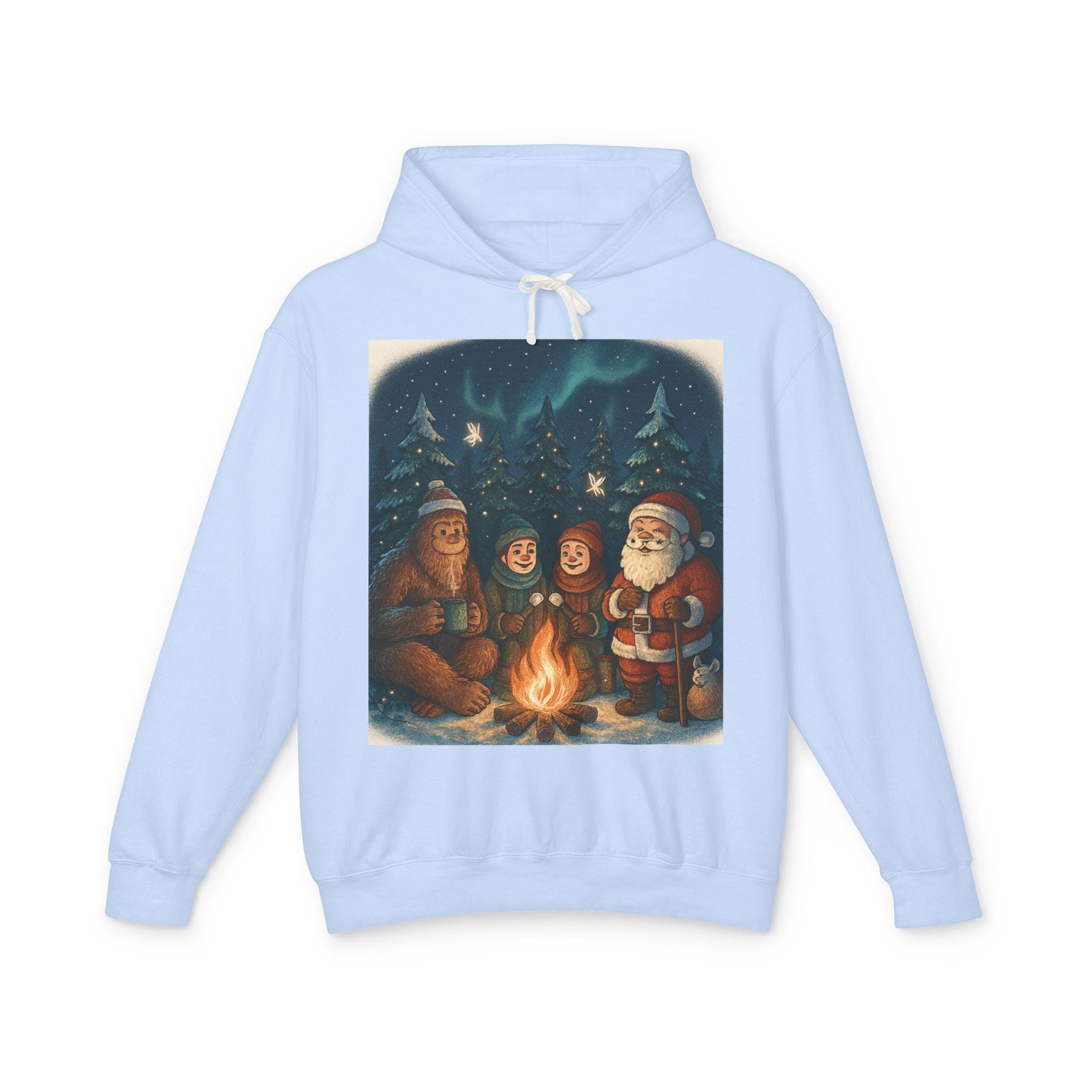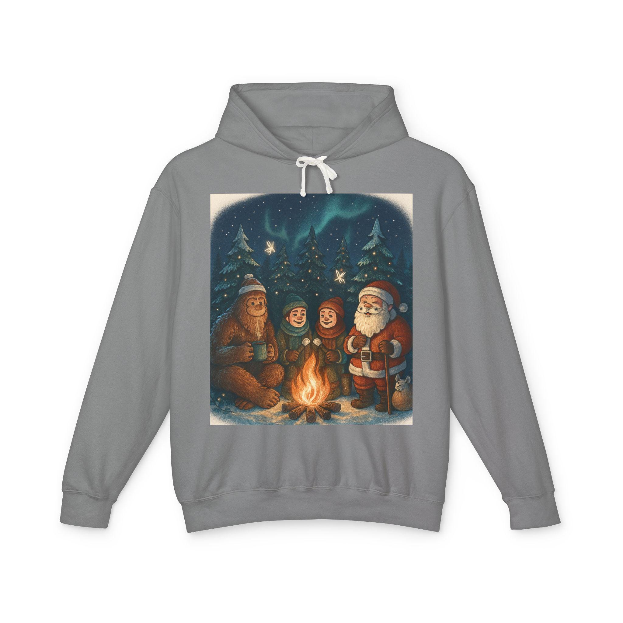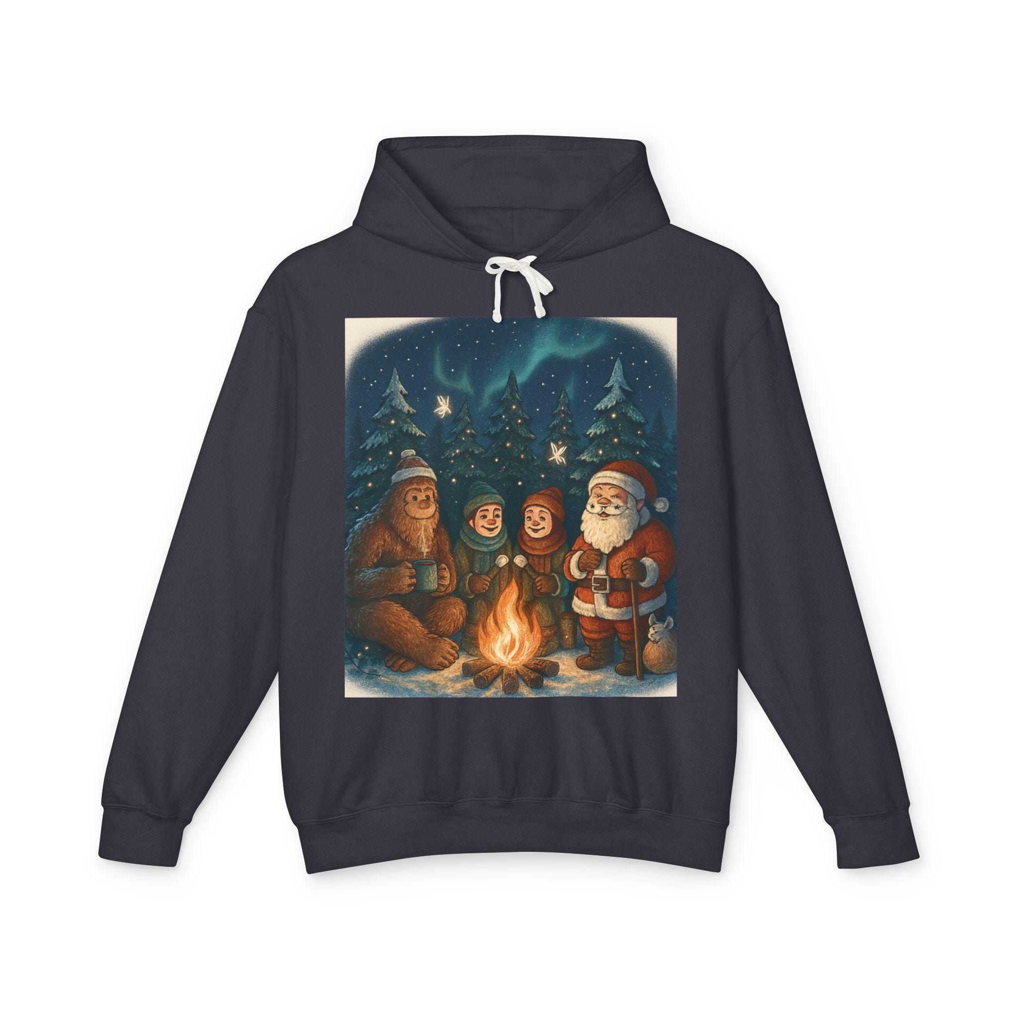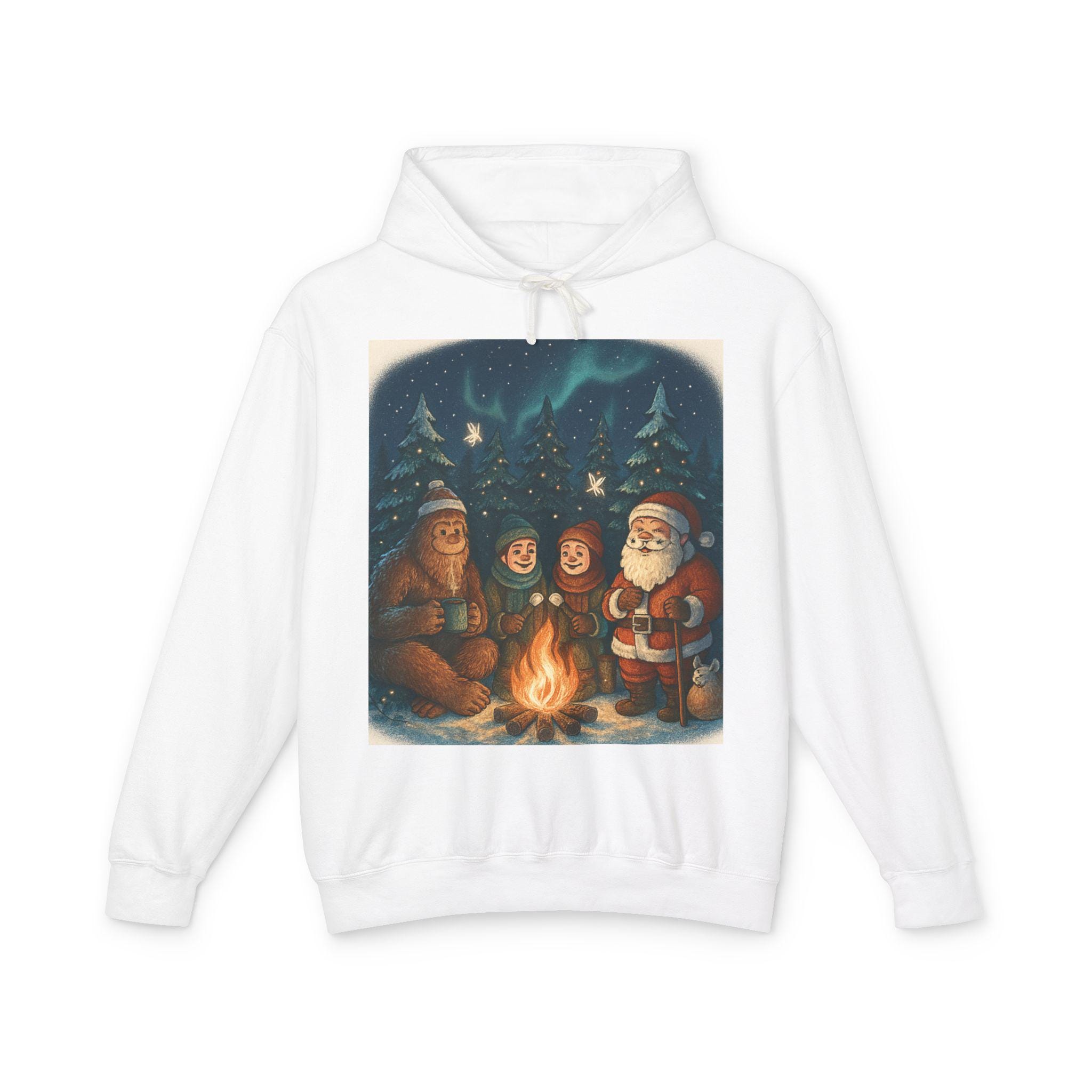 Lightweight warmth with a story stitched into the fabric. This cotton hoodie carries a cozy forest scene: a small group gathered around a crackling campfire beneath tall pines and a soft aurora. The illustration feels like a late-night winter tradition—murmured stories, hot drinks, and the hush of snow—translated into wearable comfort. It slips on easily for slow evenings by the fire, winter walks between cabins, or layering for holiday drives. The relaxed cut gives room to move without losing that tucked-in, contented feeling. Subtle natural tones and a jersey-lined hood make it feel lived-in from the first wear, like an autumn evening you can carry with you.