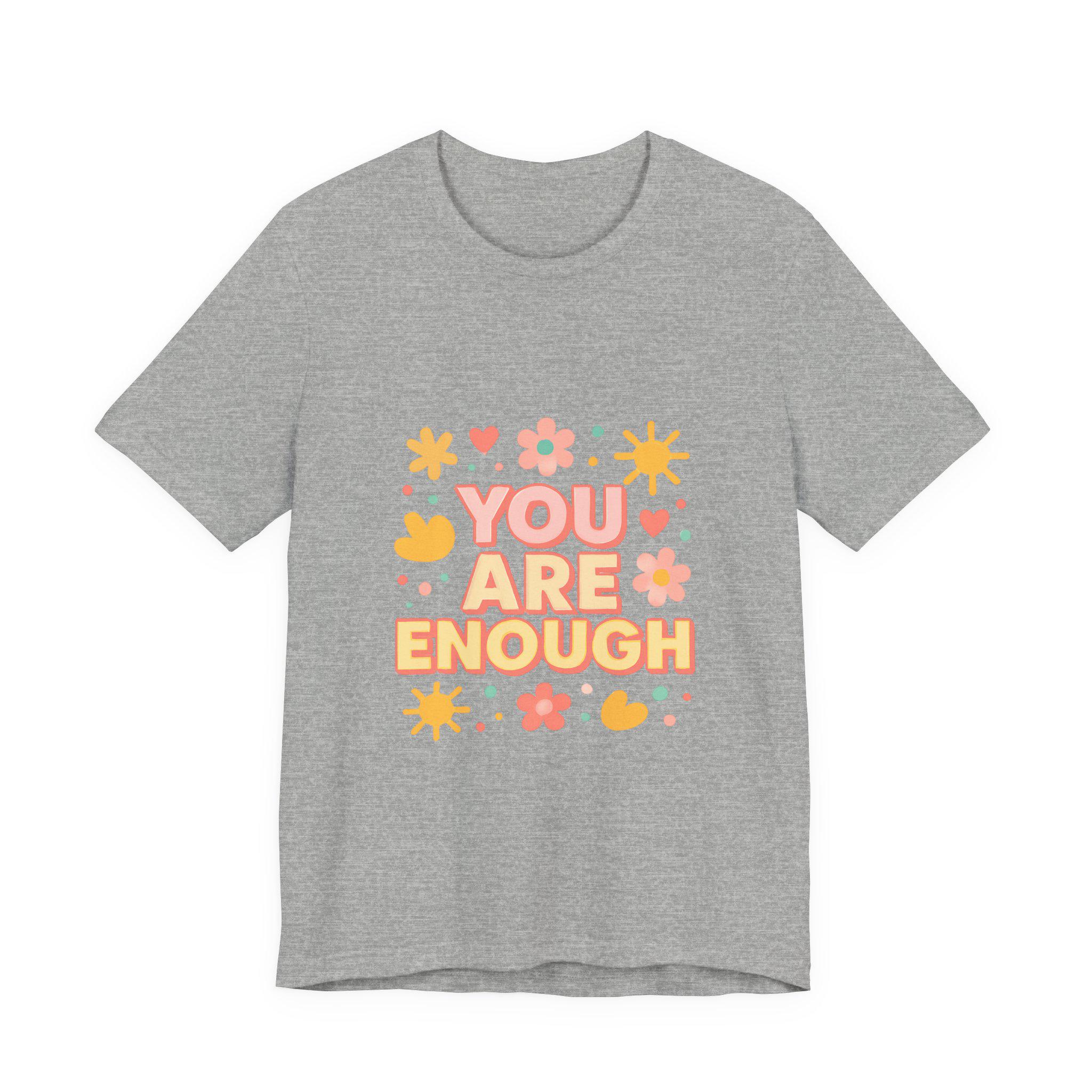 Soft, breathable, and gently uplifting — this tee carries a warm, nostalgic vibe that feels like a quiet reminder from a friend. The front artwork reads “YOU ARE ENOUGH” in rounded, retro lettering surrounded by playful suns, hearts, and flowers in peach, coral, and sunny tones. Lightweight Airlume combed and ring-spun cotton keeps the shirt airy and comfortable for daily wear. It layers easily under a jacket or stands alone as a statement piece during slow mornings, coffee runs, or casual meetups. The retail crew neckline and neat silhouette make it easy to dress up with a cardigan or keep it relaxed with jeans and sneakers. Ethically made blanks and a tear-away label add thoughtful details for anyone who prefers conscious, comfortable clothing.