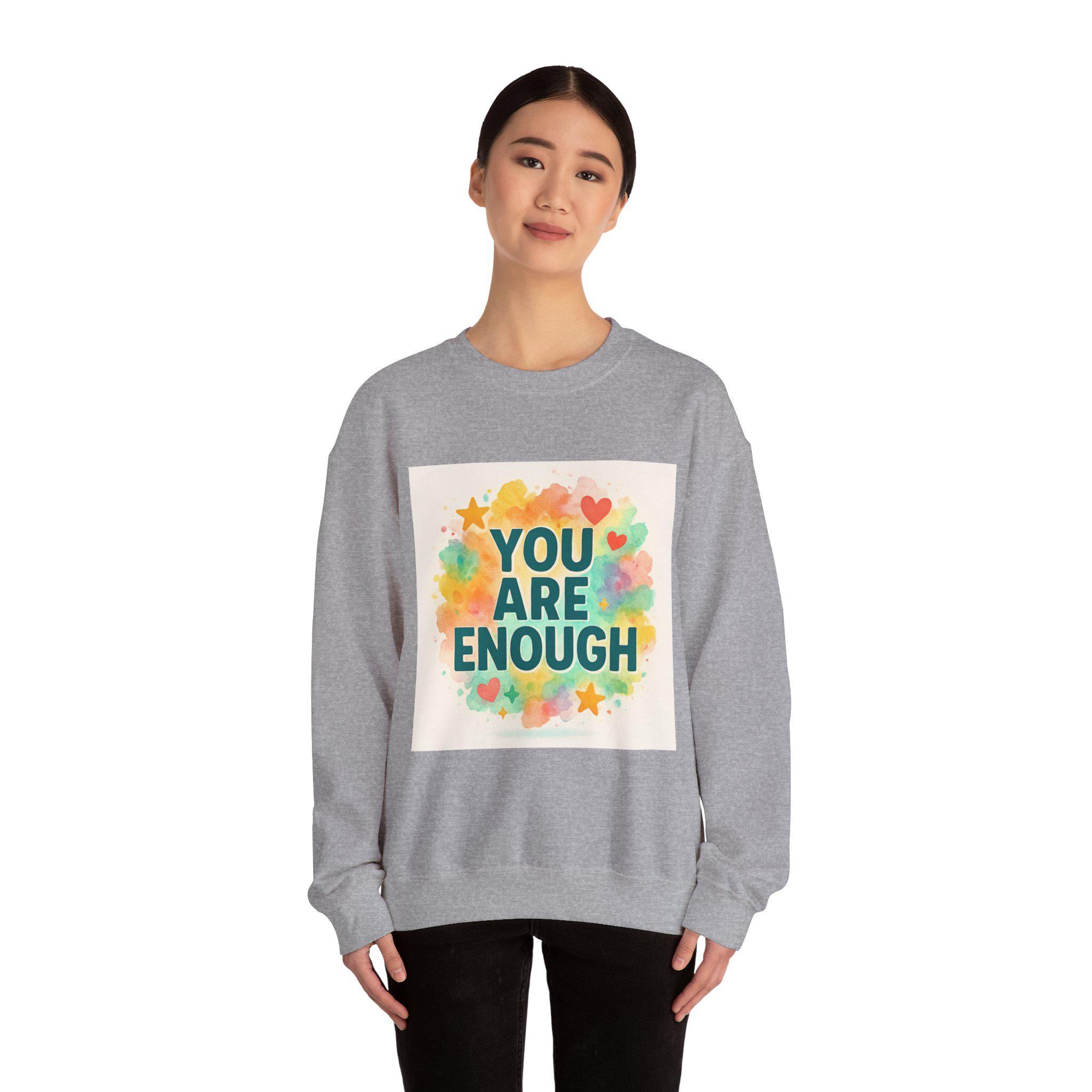 This cozy crewneck brings a quiet, uplifting moment into everyday wear. Soft, medium-weight fabric drapes comfortably while a colorful, hand-painted style graphic reads “YOU ARE ENOUGH” across the chest — a gentle reminder carried through your day. The classic crew neckline and clean silhouette make it easy to layer over tees or pair with jeans for slow mornings, errands, or relaxed evenings. Embroidered and printed label details keep the inside soft against skin, and durable double-needle stitching means this sweatshirt stays part of your rotation for seasons to come. It’s made with responsibly sourced cotton and OEKO-TEX dyes, so the warm message feels good inside and out.